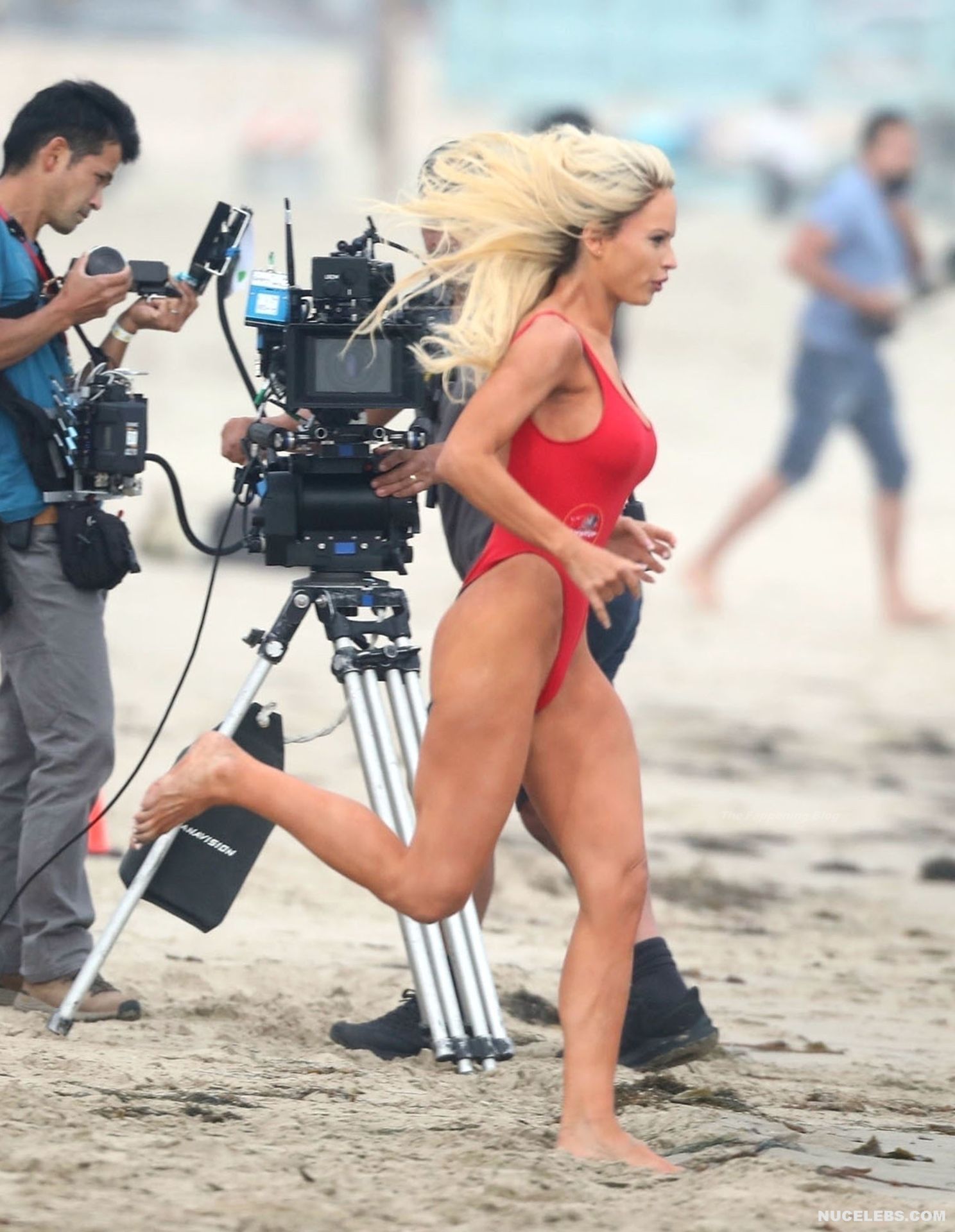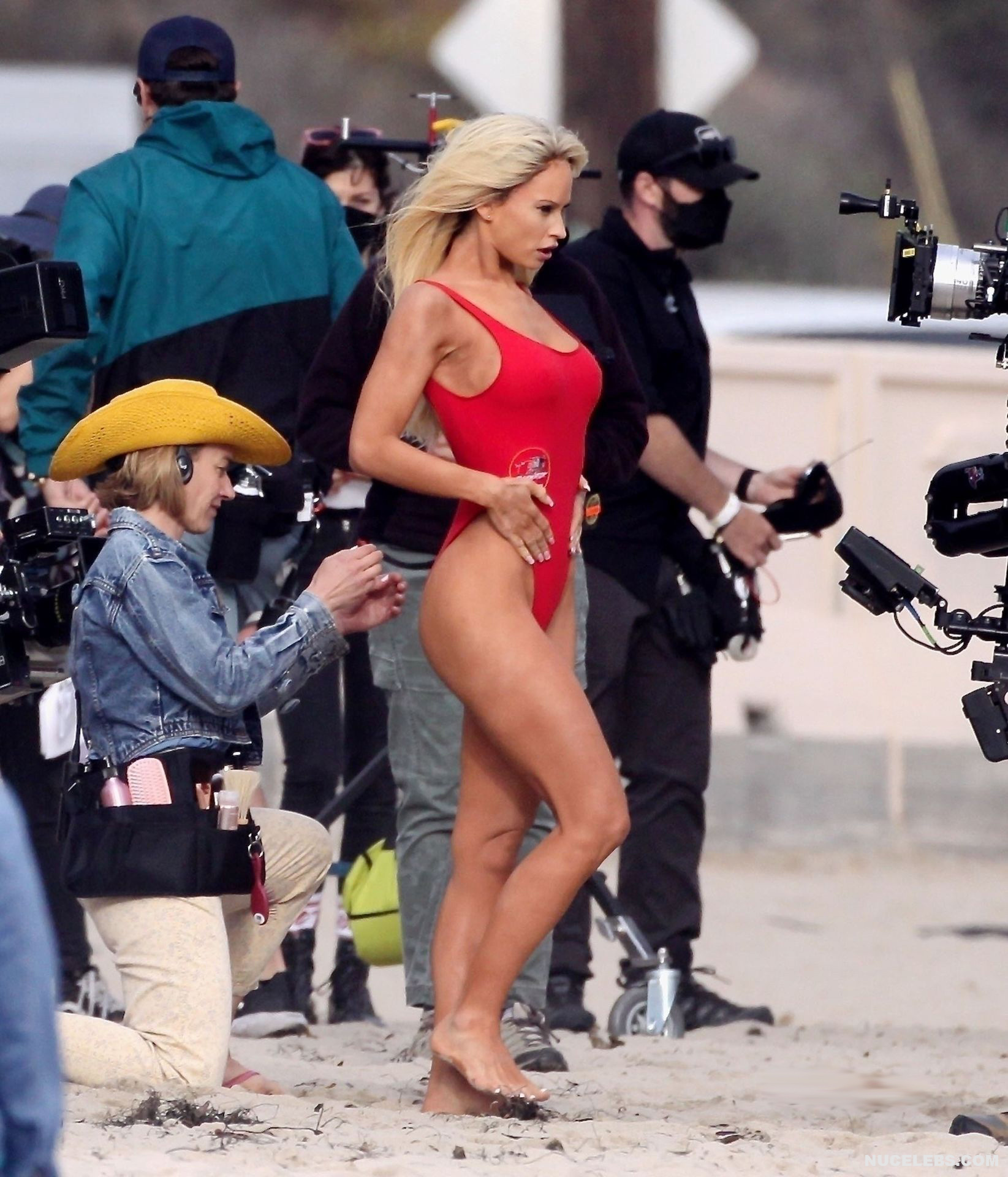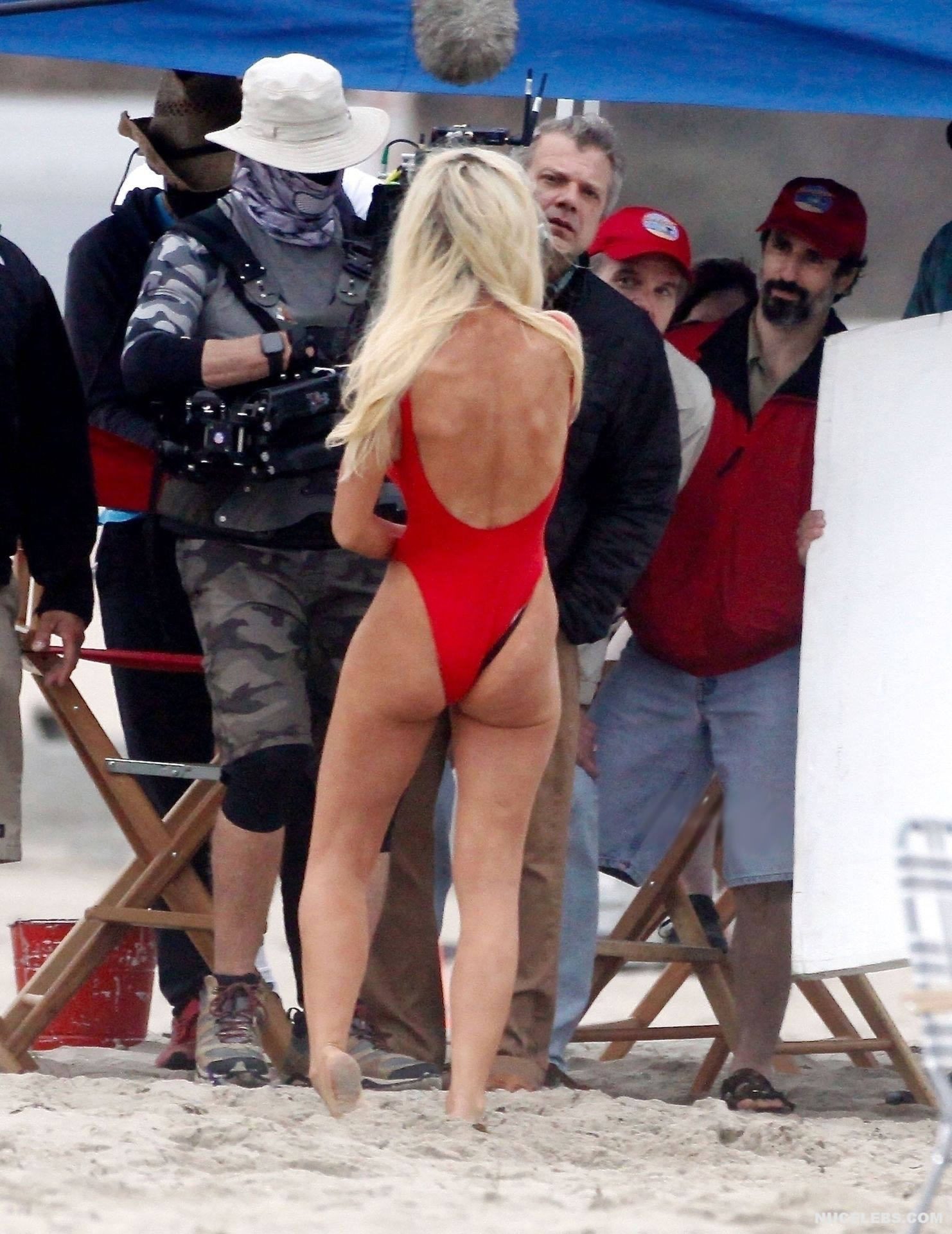 You will go nuts when you see Lily James in the new Pam & Tommy movie. Judging by the behind scene pics, this movie will be very exciting. So far, the paparazzi have not been able to catch Lily James nude moments. However, they managed to photograph this charming blonde in a red swimsuit. Oh, Lily James’s nude boobs really looked huge in a tight, low cut swimsuit. And her sweet butt was covered only by a narrow red strip of panties. I’d love to spank her lovely buttocks, wouldn’t you?