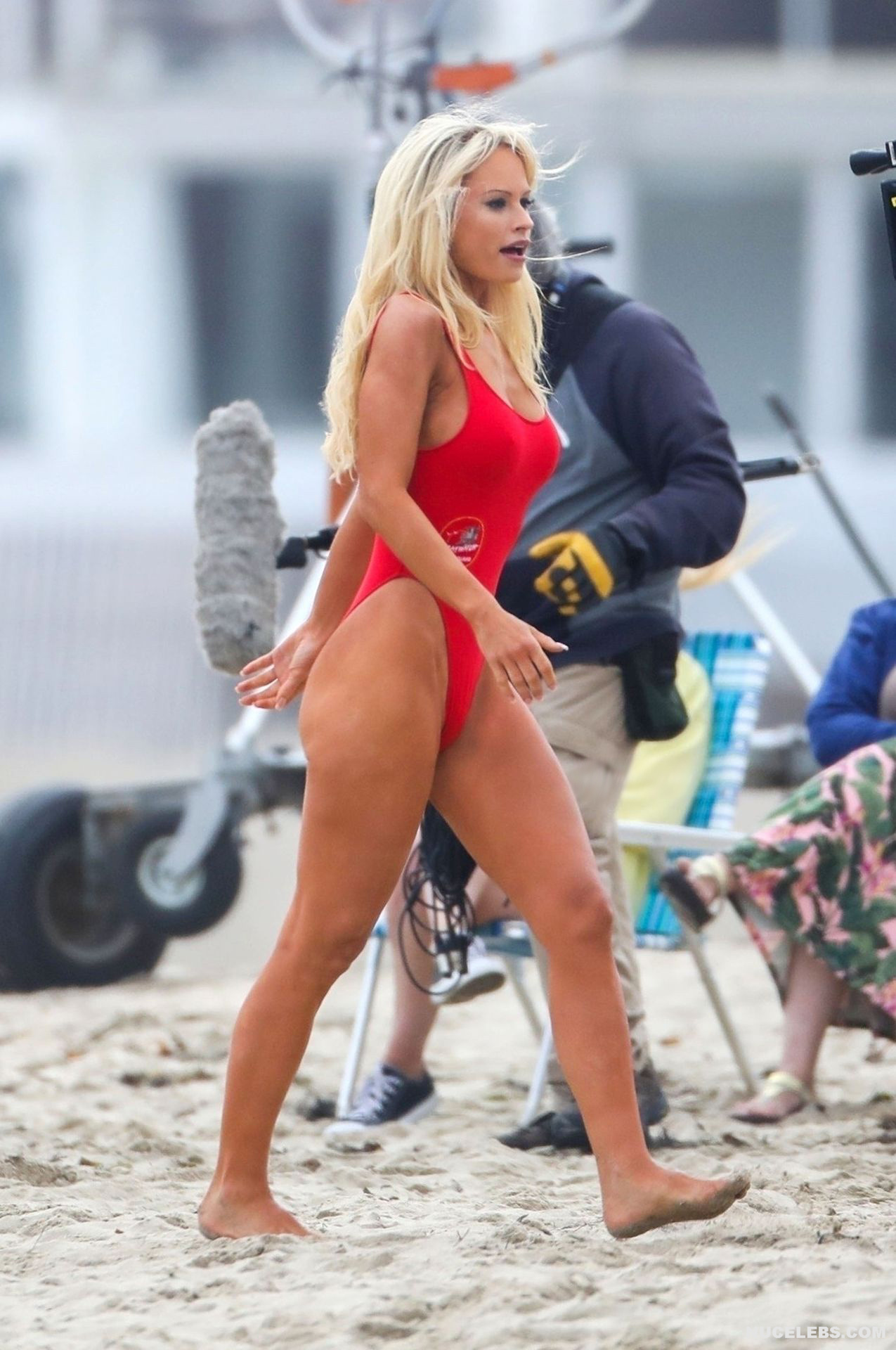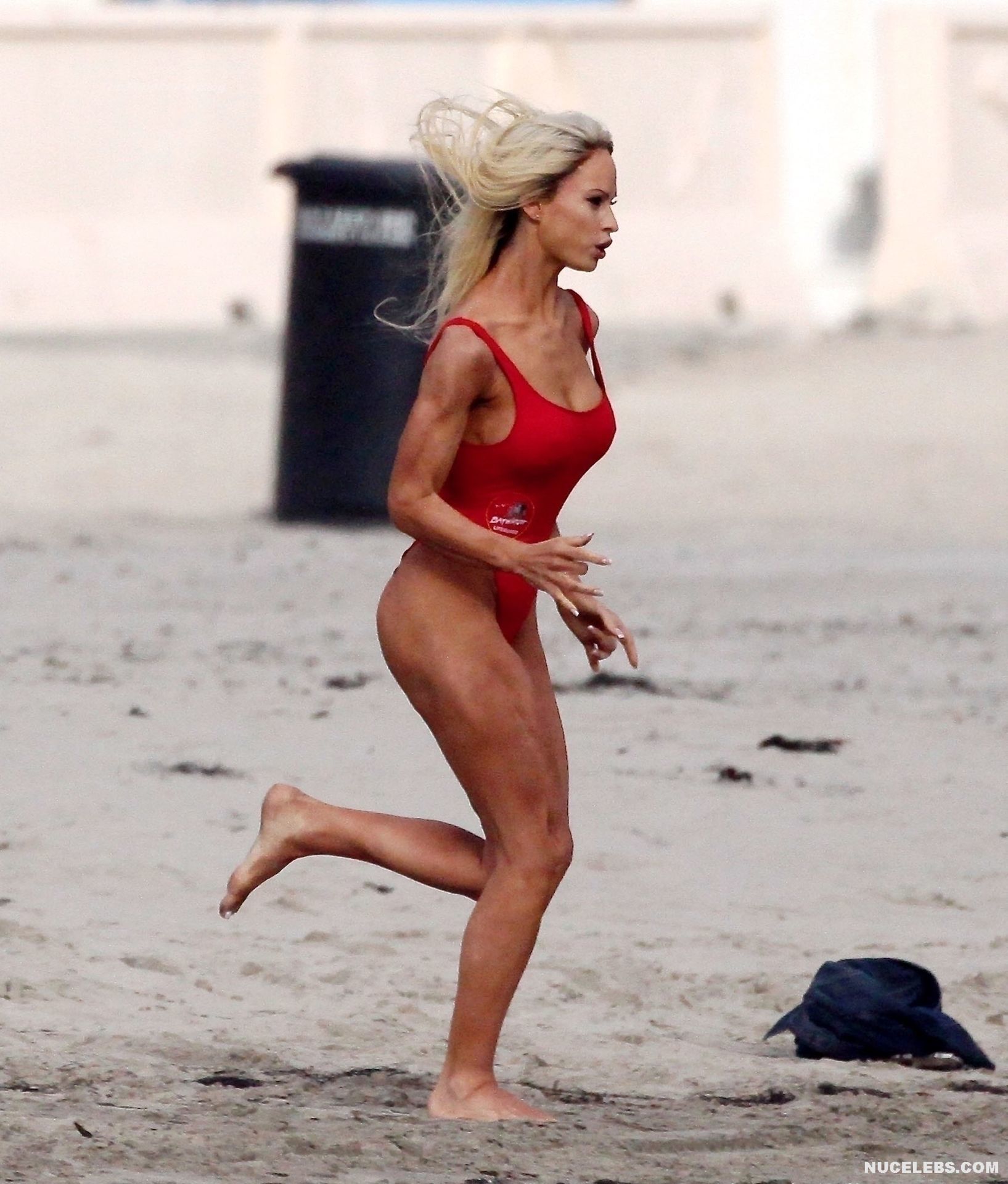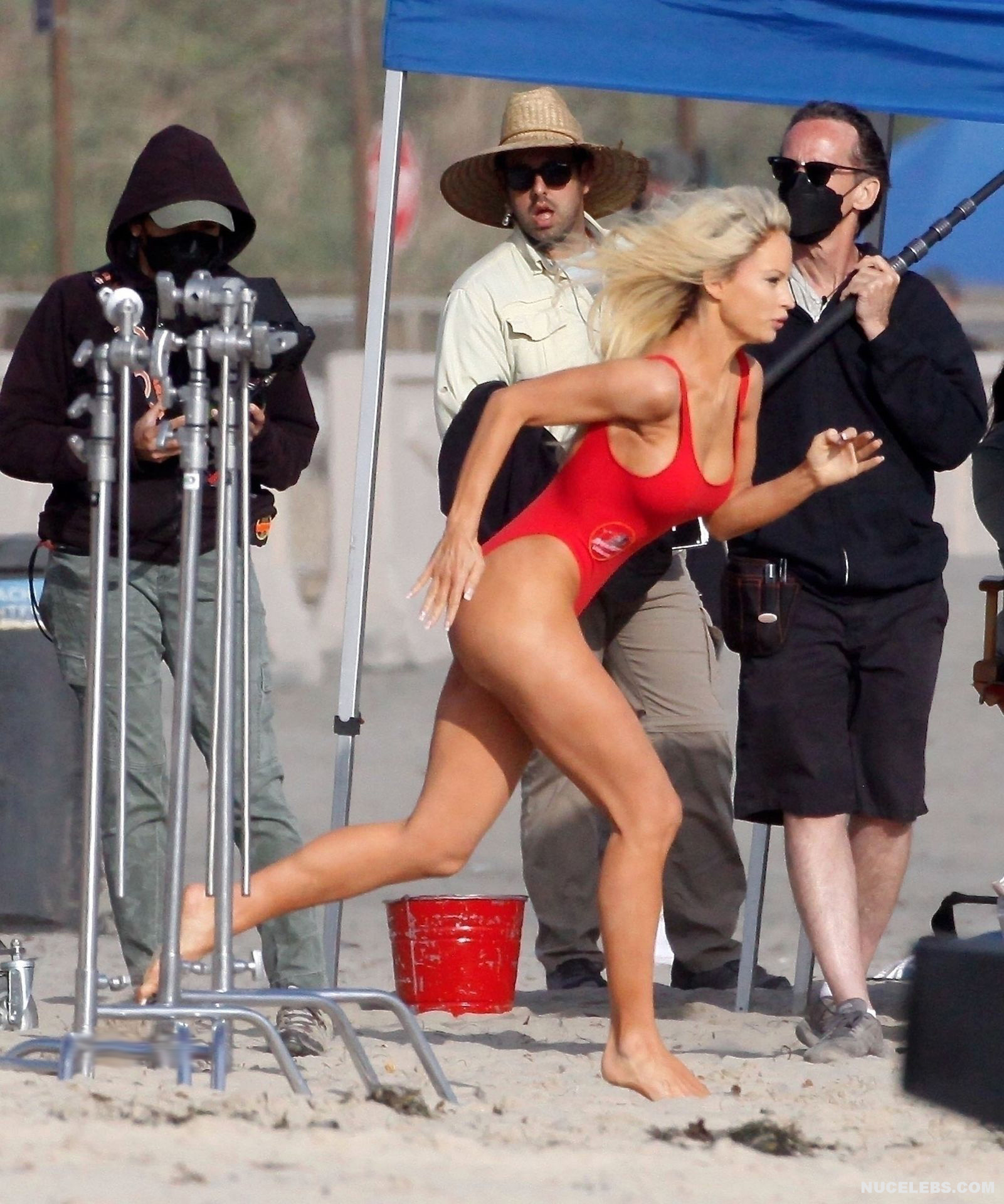 You will go nuts when you see Lily James in the new Pam & Tommy movie. Judging by the behind scene pics, this movie will be very exciting. So far, the paparazzi have not been able to catch Lily James nude moments. However, they managed to photograph this charming blonde in a red swimsuit. Oh, Lily James’s nude boobs really looked huge in a tight, low cut swimsuit. And her sweet butt was covered only by a narrow red strip of panties. I’d love to spank her lovely buttocks, wouldn’t you?