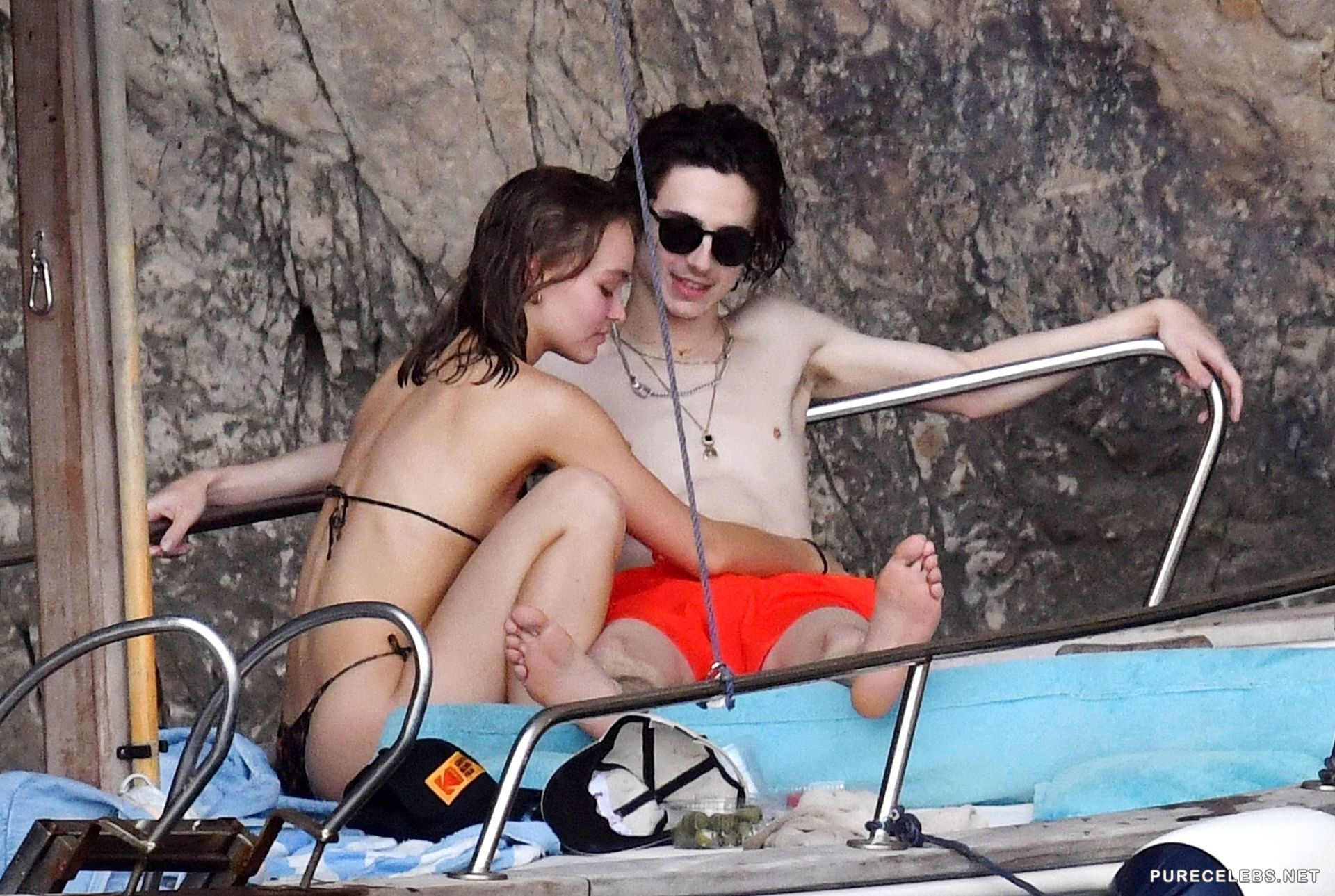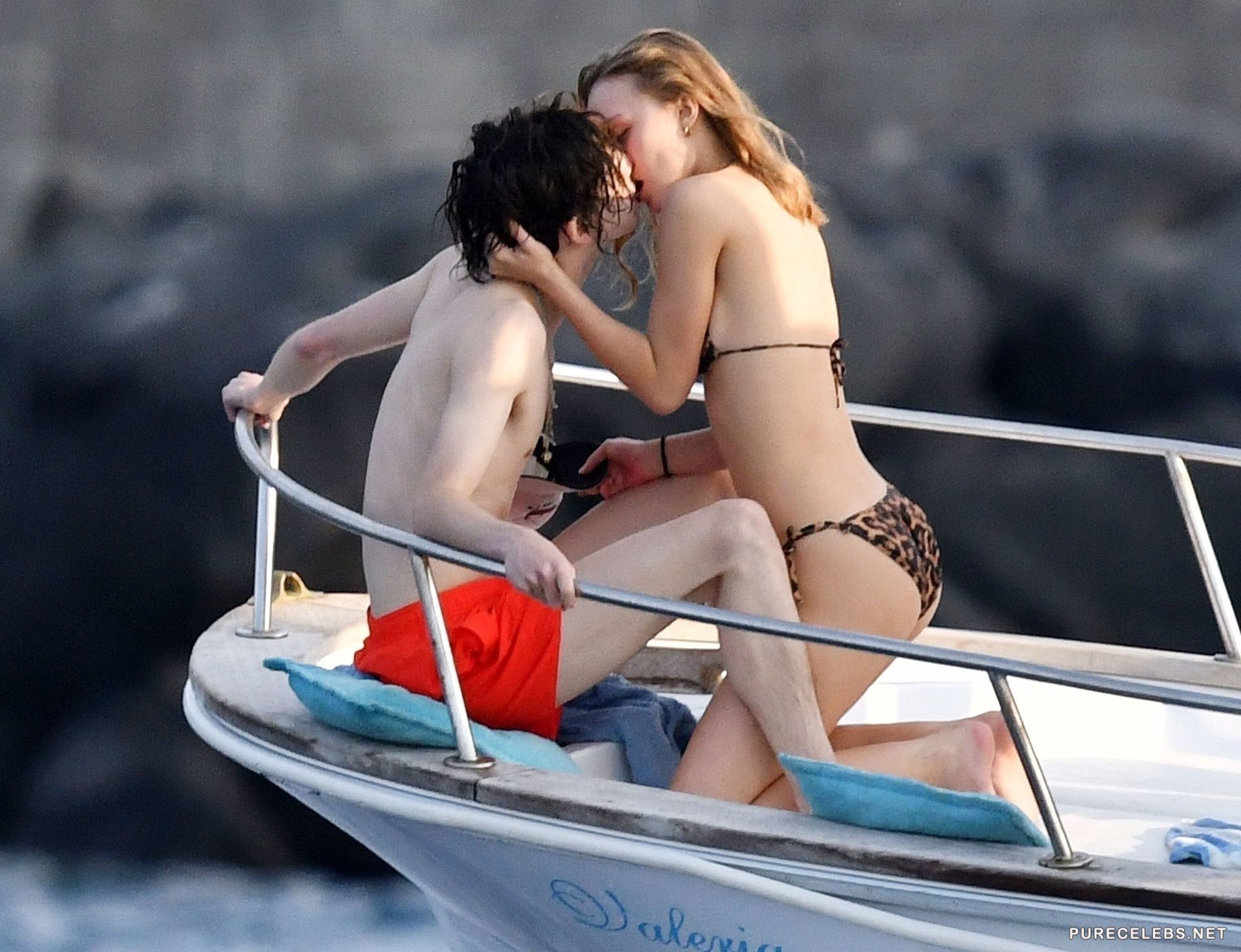American-French actress and model Lily-Rose Depp was spotted during a hot, deep kiss on a yacht and these photos immediately scattered across all the tabloids. The charming blonde had a great time and looked incredibly seductive in a wet print bikini. You will surely be delighted with her awesome booty and juicy boobies, which were barely covered by a small bra. This girl will make you dream of her all night!