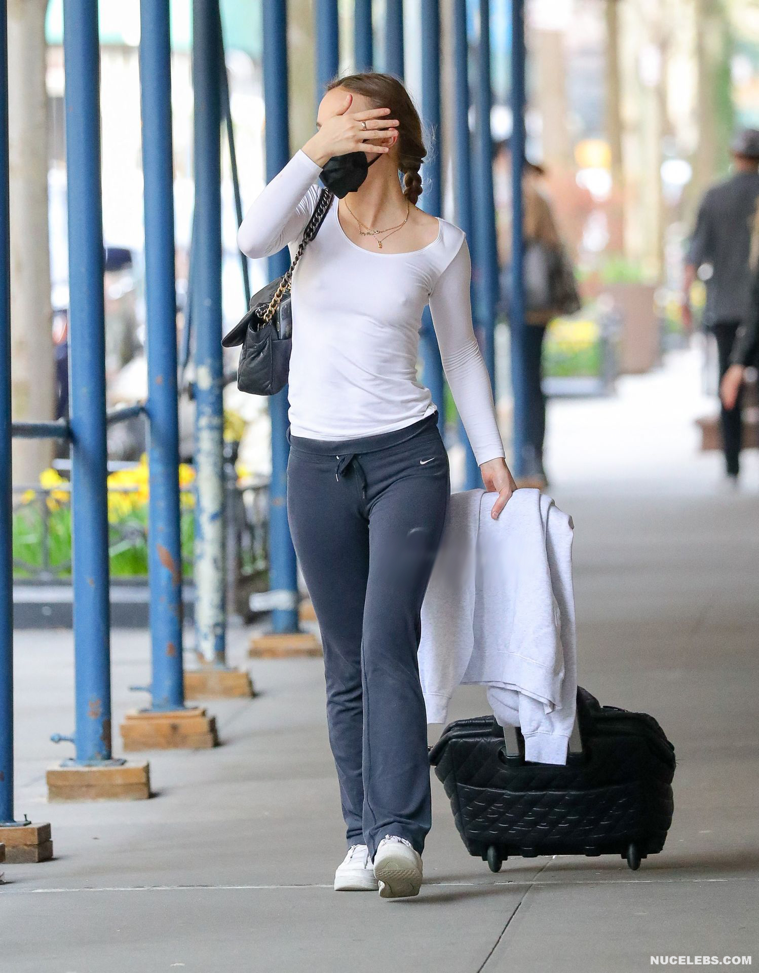 Adorable beauty Lily-Rose Depp continues to tease the audience with her almost nude tits. So, the paparazzi photographed this beauty on the street in a very provocative outfit. The actress wore a tight-fitting white blouse and gray pants. It is worth noting that this time the star was braless. Thanks to this, Lily-Rose Depp’s nude boobies with hard nipples showed through the thin fabric. She tried to hide her face with her hands, but it was too late. Now everyone can admire Lily-Rose Depp’s almost naked breasts.