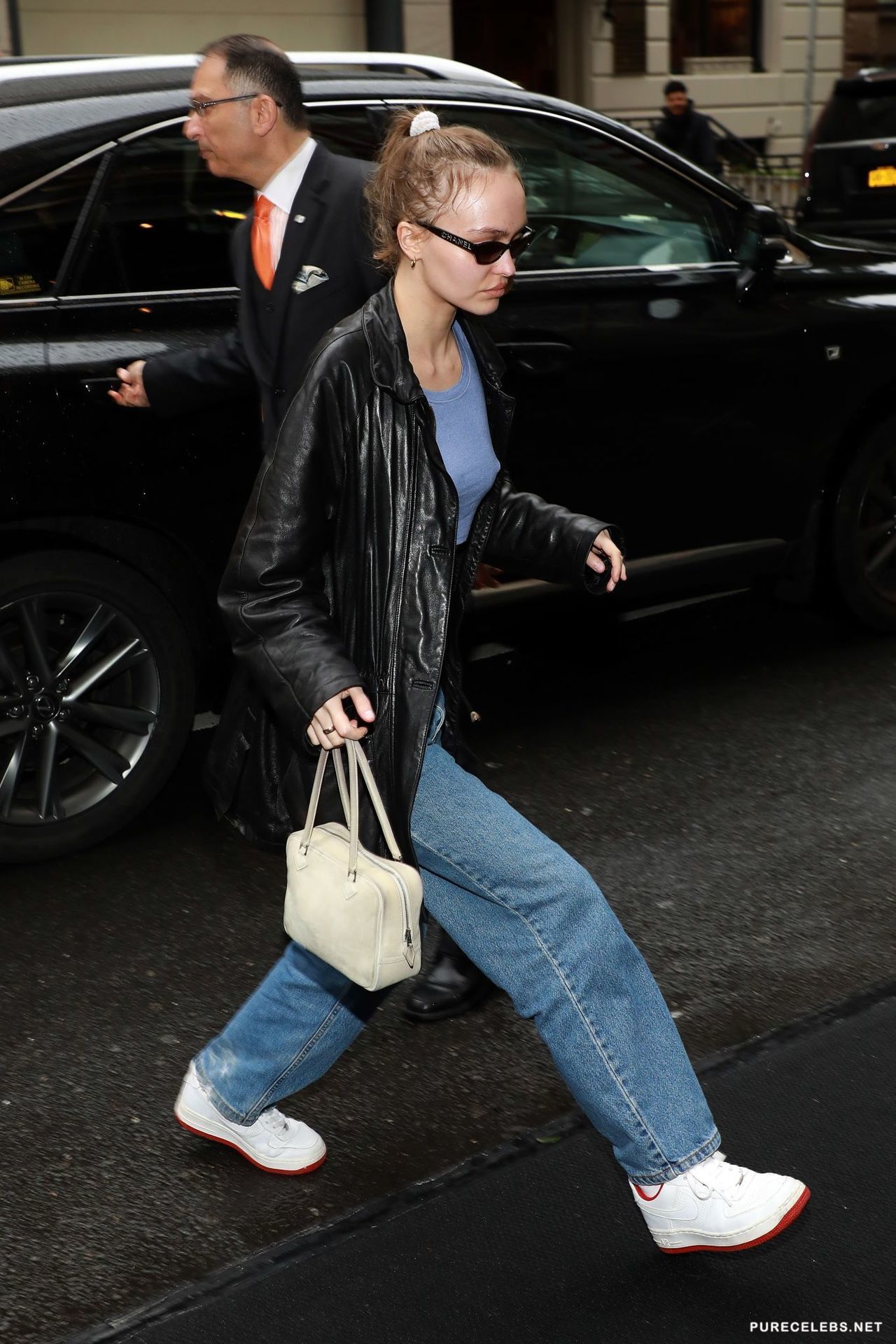 Lily-Rose Depp, a French-American actress and model, loves to show off her wonderful tits and her small flat tummy. The girl often goes for a walk without a bra as it was this time when the paparazzi took pictures of her. She was wearing blue jeans, a short blue top and a long black leather coat. And we can clearly see how her wonderful boobs with hard nipples stick out through the top.