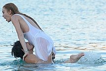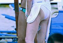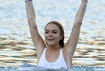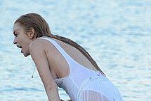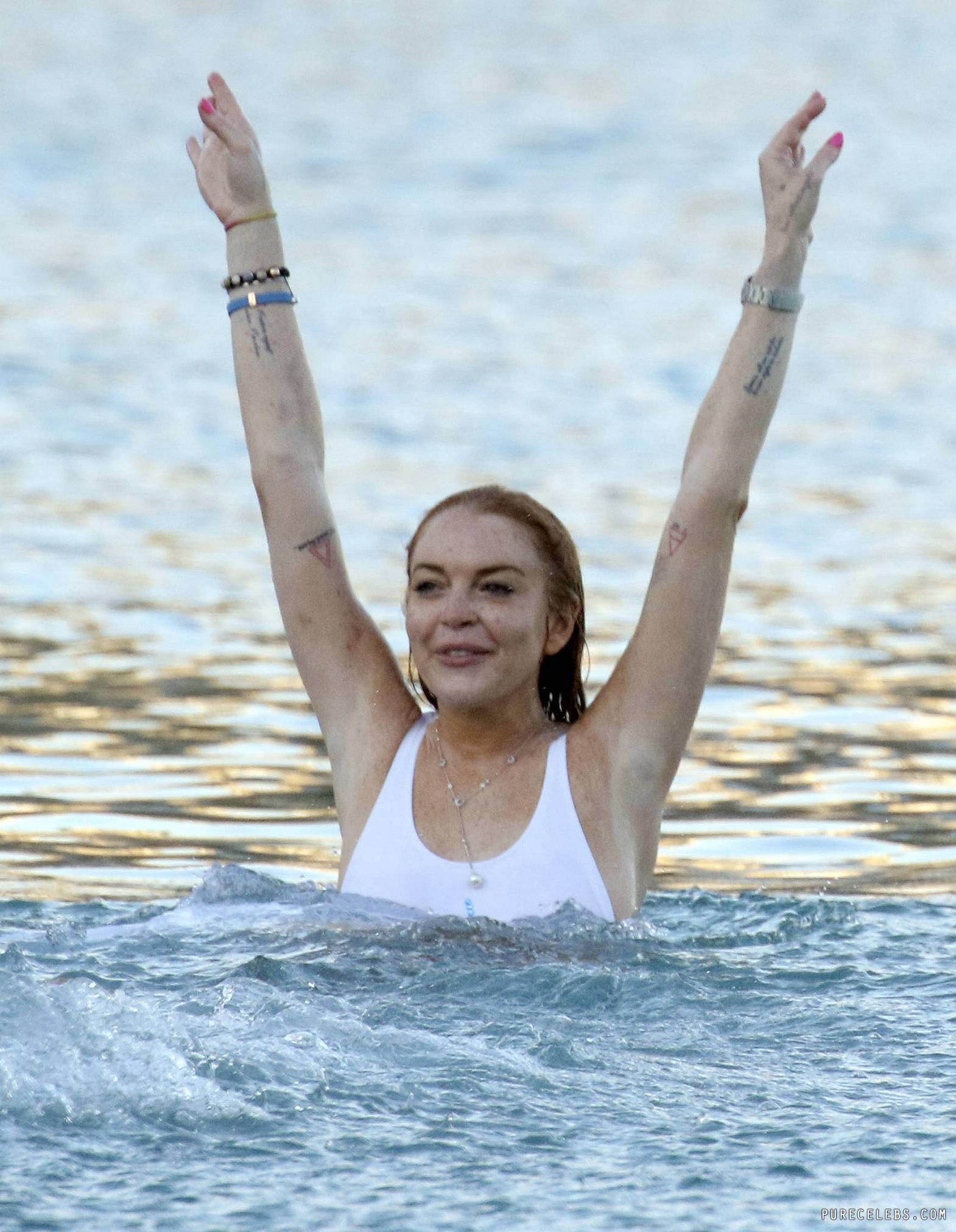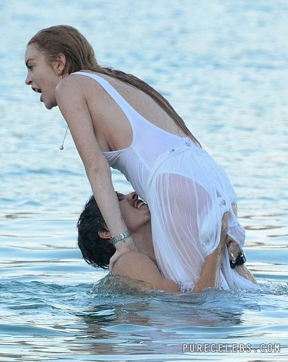 Famous redhead Lindsay Lohan wasn’t prepared to go thrashing around in the water with the outfit she chose for the beach, but this paparazzi was ready to take candid photos. In this celebrity gallery, you can see Lindsay fooling around with her boyfriend, showing off her big side boob before getting out of the water and giving us a good look at her ass and the swimsuit stuck between her buns.