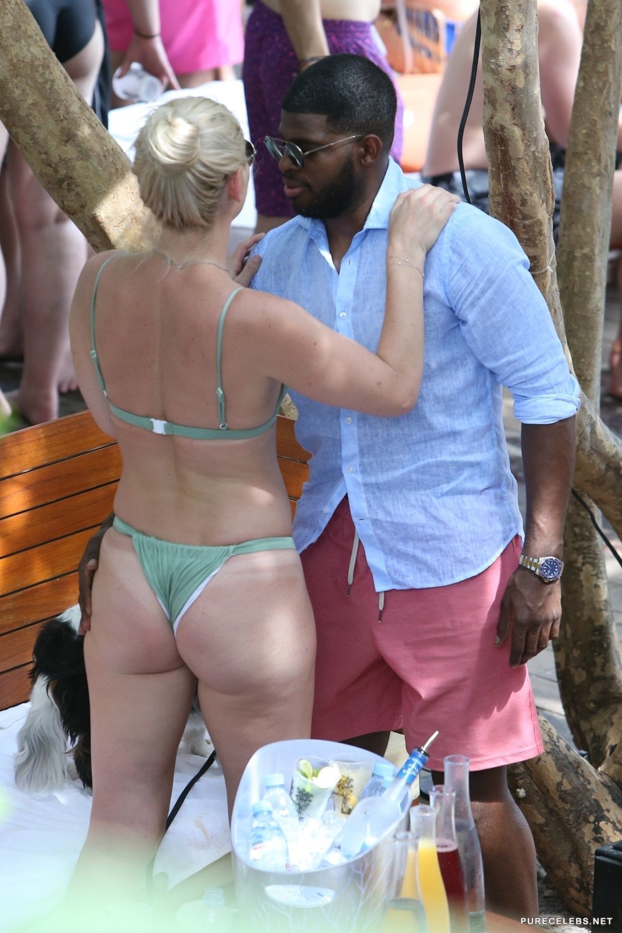 American skier Lindsey Vonn again got into the media due to her bikini photos. The star was photographed while her resting on the beach in a light green swimsuit whose bra barely covered her wonderful juicy boobs and her small narrow thongs showed her gorgeous buttocks. The celebrity looked so seductive that one man could not resist and grope her juicy ass. We think everyone would like to do it!
