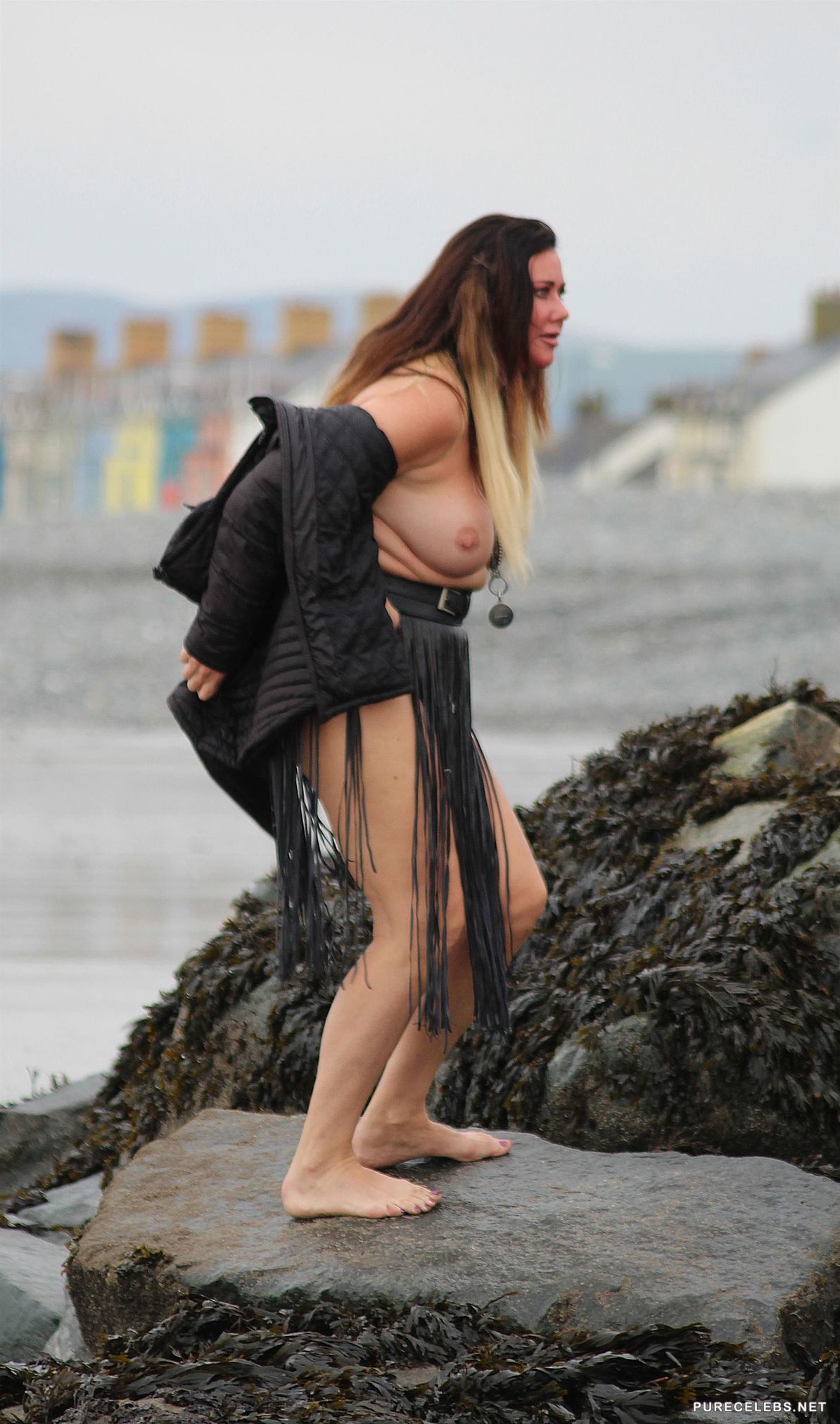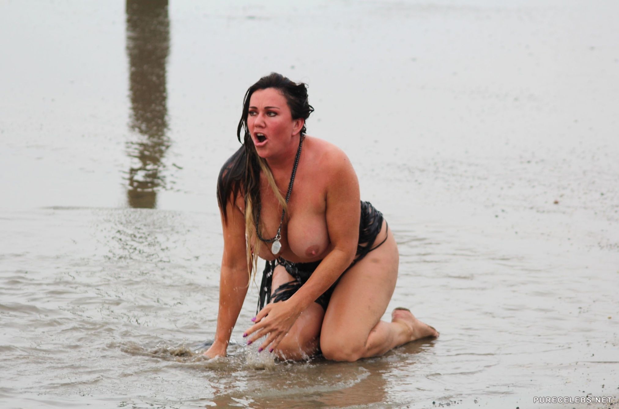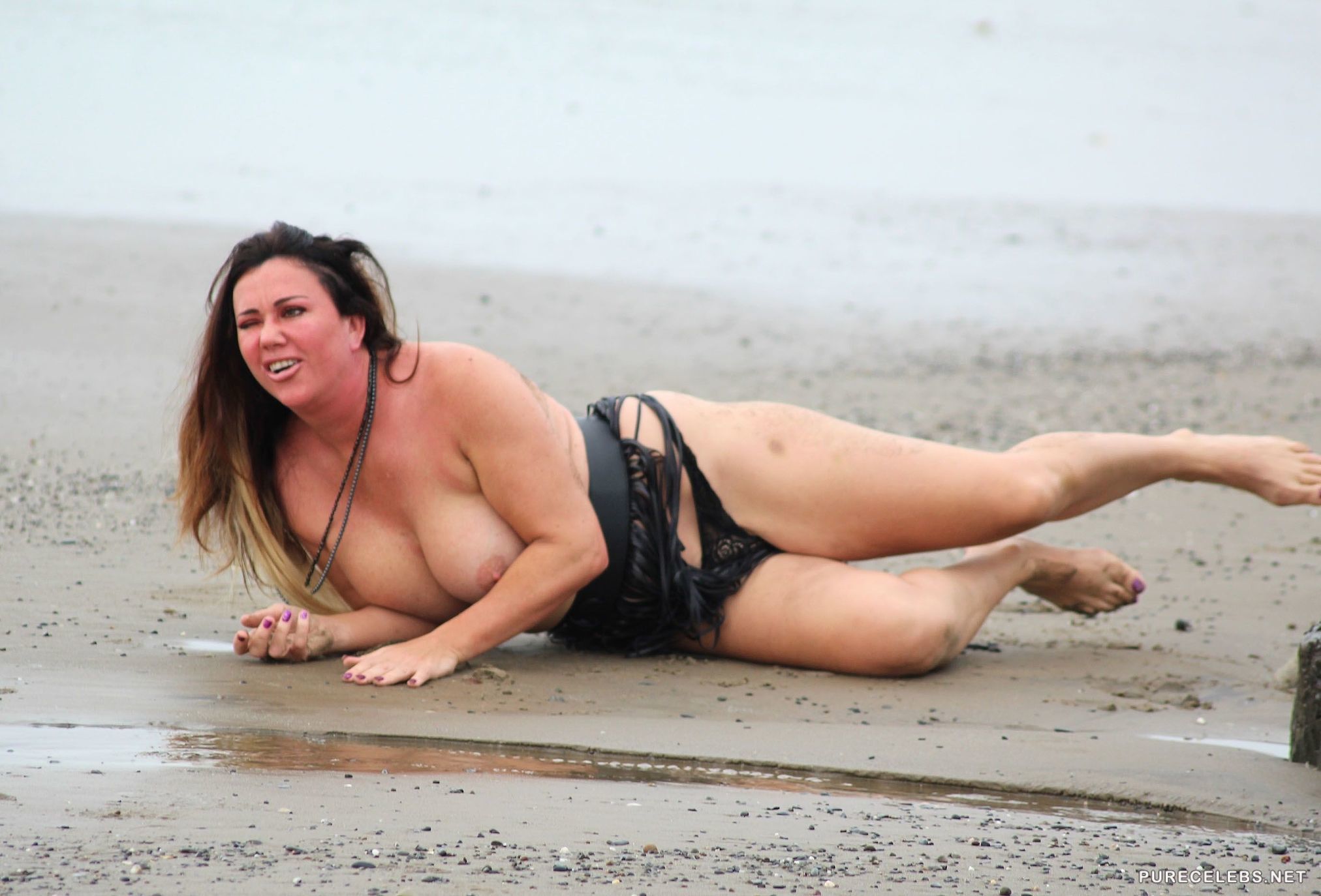 If you are a fan of British reality TV then you surely know who Lisa Appleton is. This plus sized slut was recently photographed topless on the beach wearing only a black thong that could barely conceal her huge crotch. She pranced around on the beach and even took a dip in the water unaware that lucky paparazzi were snapping shots the whole time.
