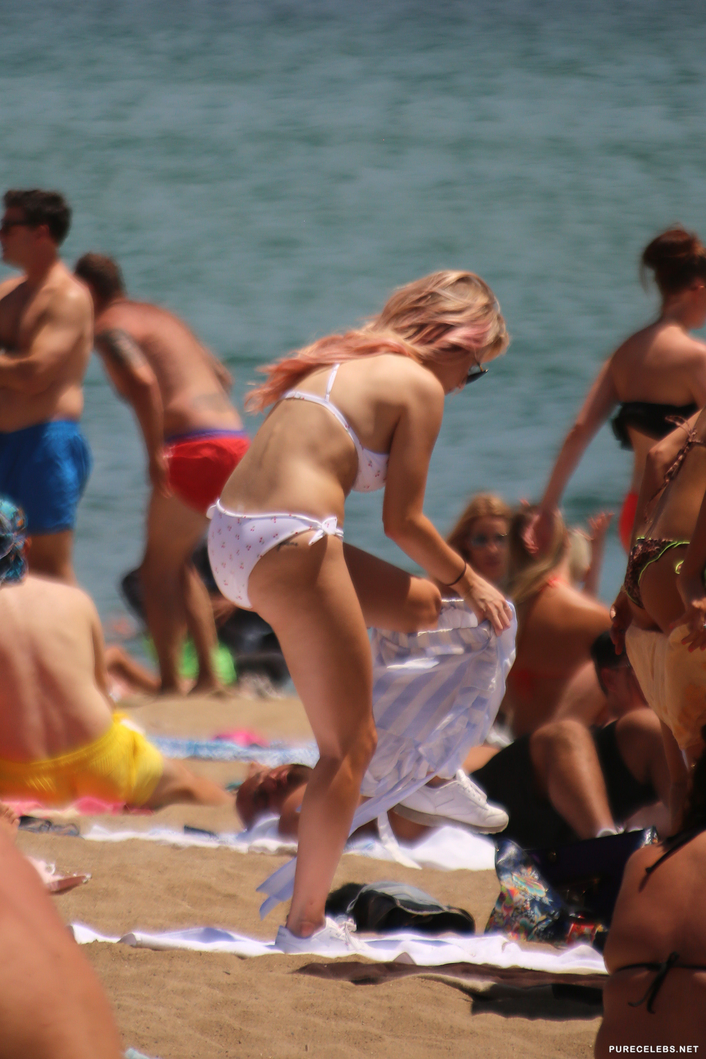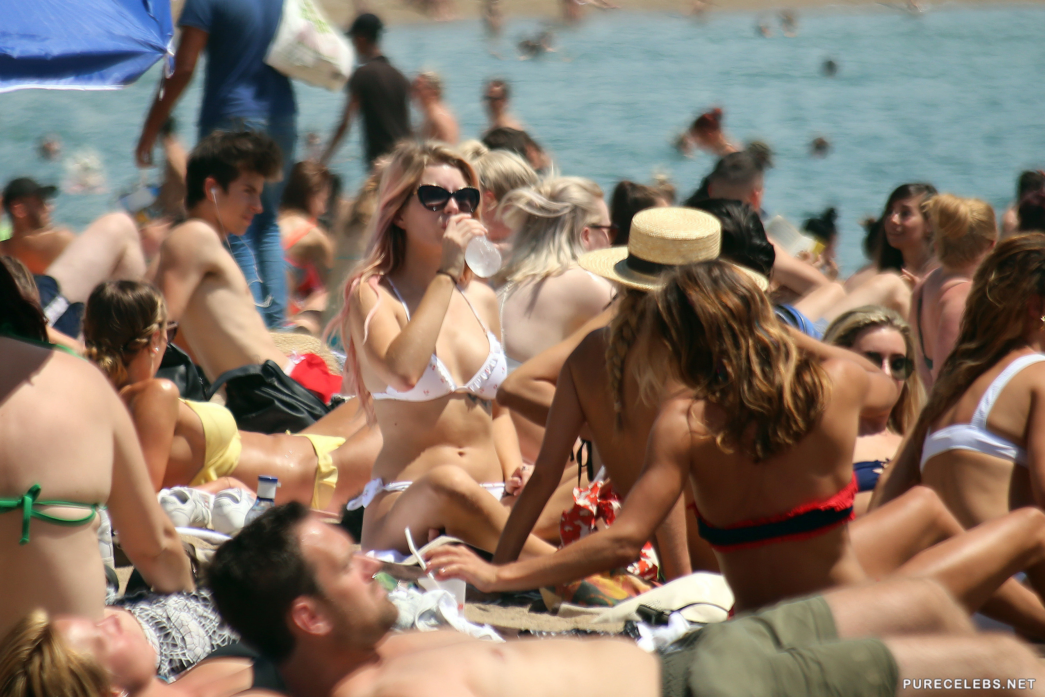 Lottie Moss goes to the beach and she wears her white bikini while she is in the middle of a large group of people. She is there with her sexy blonde friend and she is trying to find a place on which to plant her towel and catch some sun. When she does that, we are able to admire her sexy body in peace as she gets a tan.