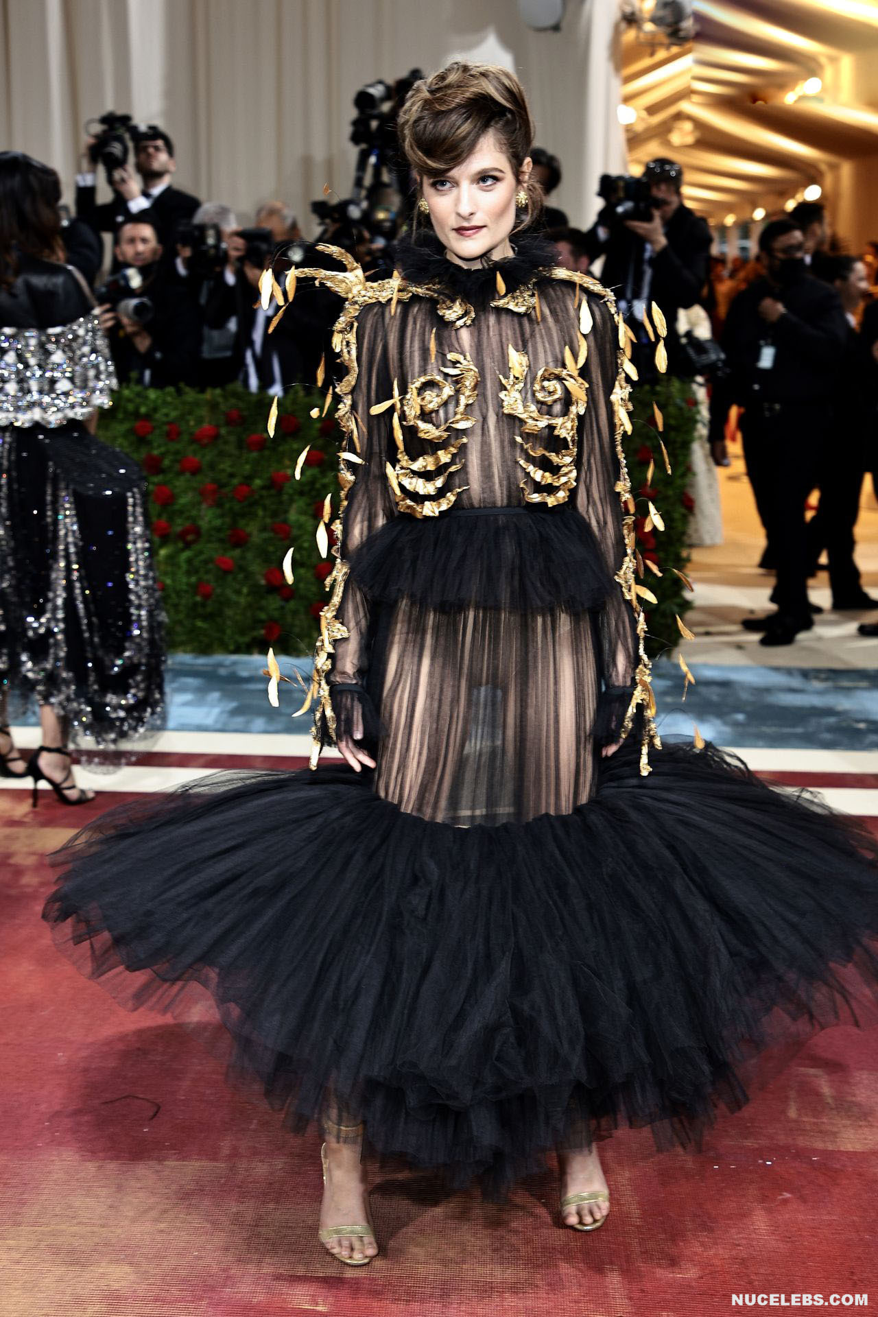 Louisa Johnson impressed everyone with her appearance at The 2022 Met Gala. And all because this British singer was dressed in a very unusual costume, which did not hide her naughty bits at all. For example, it was hard to tell if there were panties under her see-through black dress, or if Louisa Johnson’s pussy was completely nude. And although her dress was appliqued with golden monograms with flowers, they only partially covered Louisa Johnson’s nude boobs, which shone through.