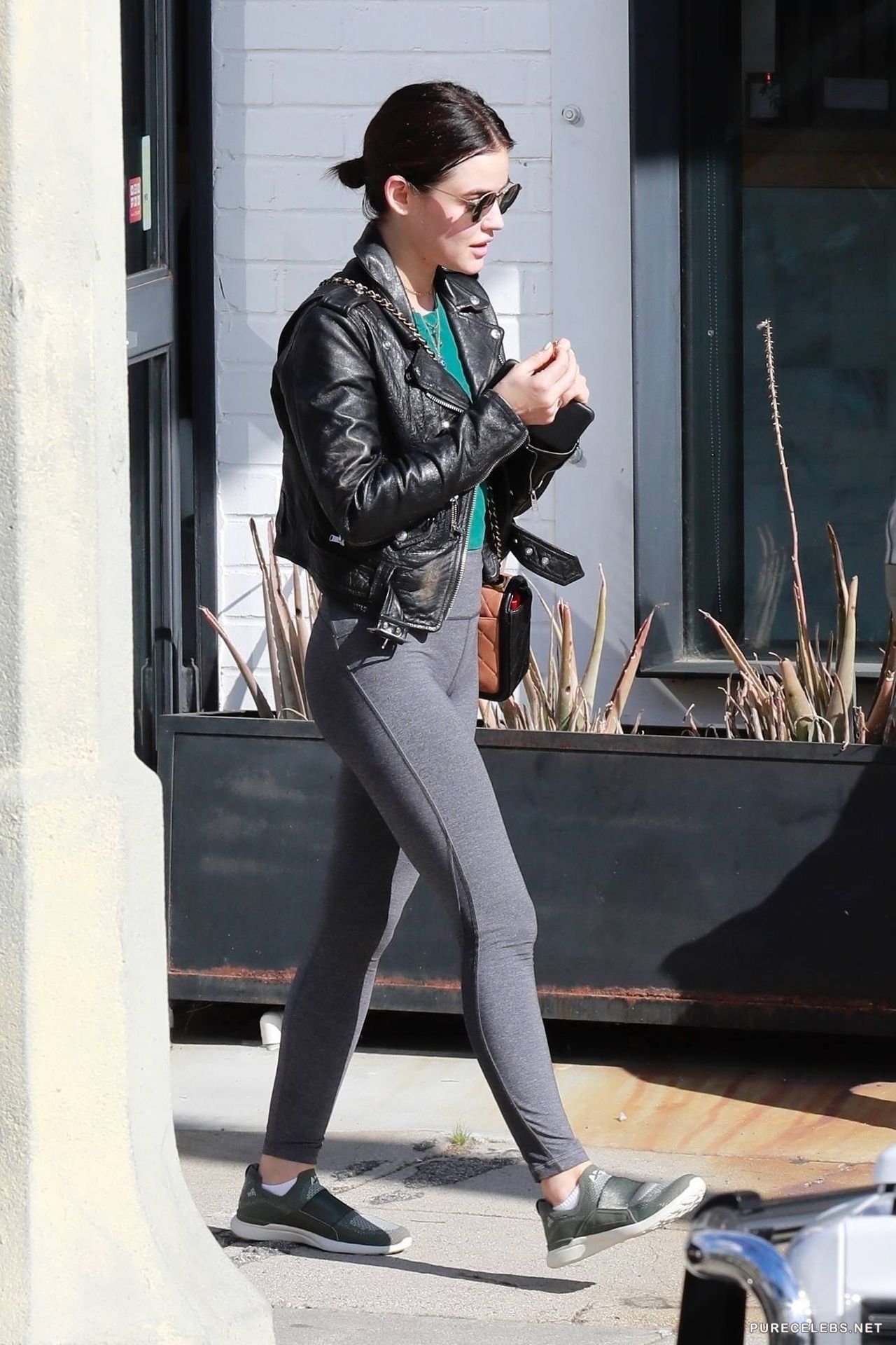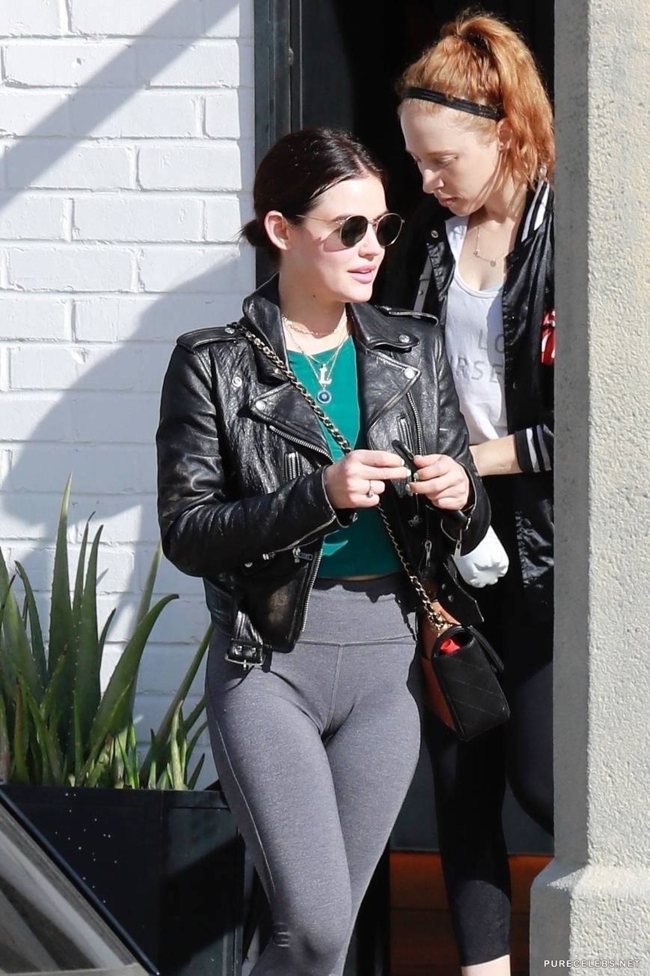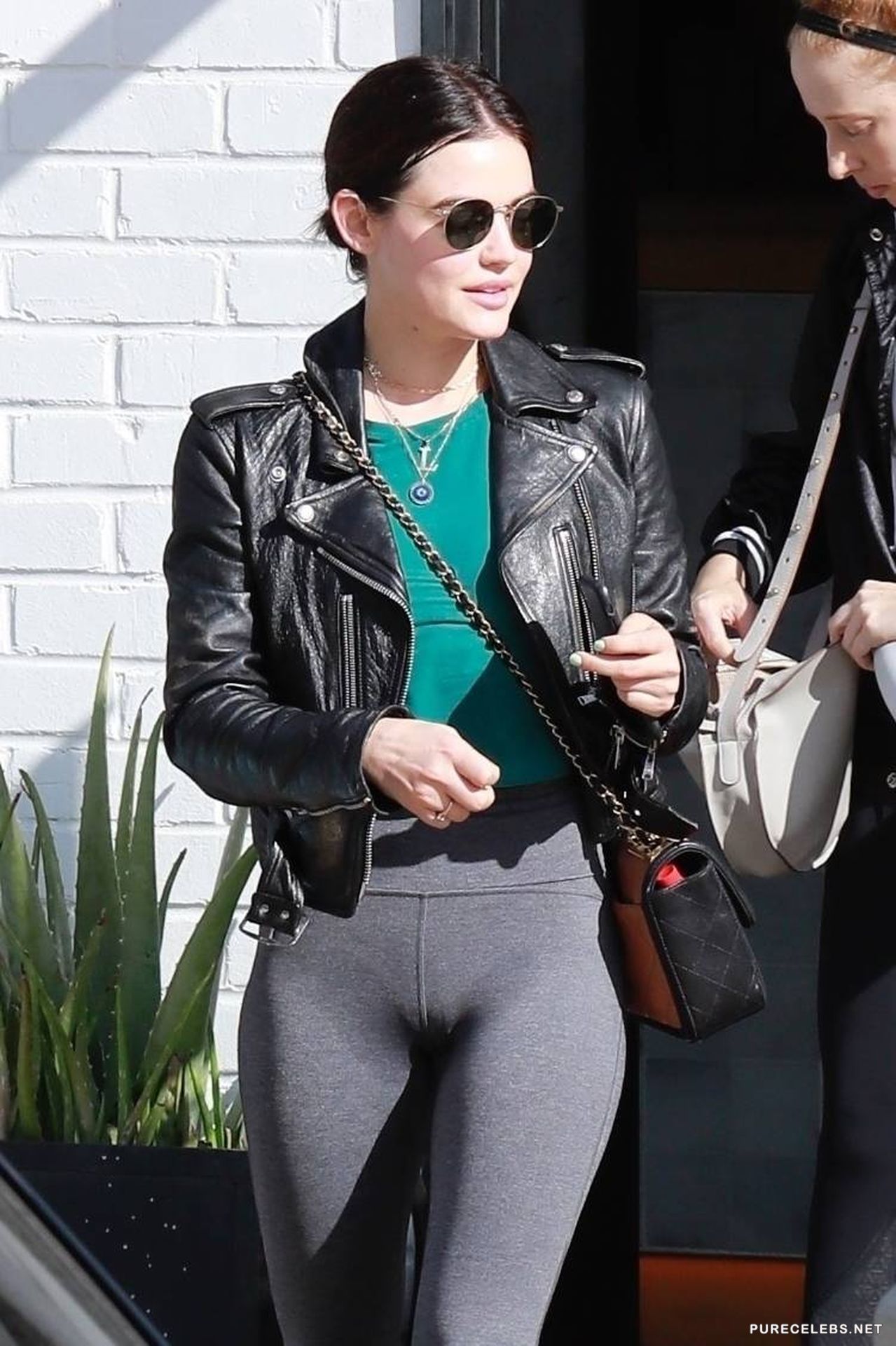 American actress and singer Lucy Hale was caught by paparazzi cameras. The star was dressed quite provocatively when she was walking down the street. She wore a short green top, tight-fitting pants, a black leather jacket, and complemented her look with black sunglasses and beautiful jewelry. Her gray pants were very tight, and we can clearly see her wet cameltoe. Apparently this girl is very excited, isn’t she?