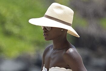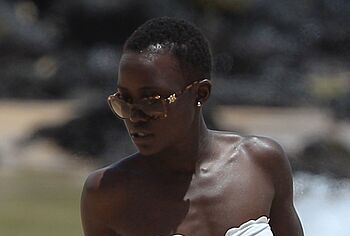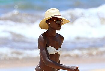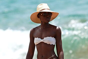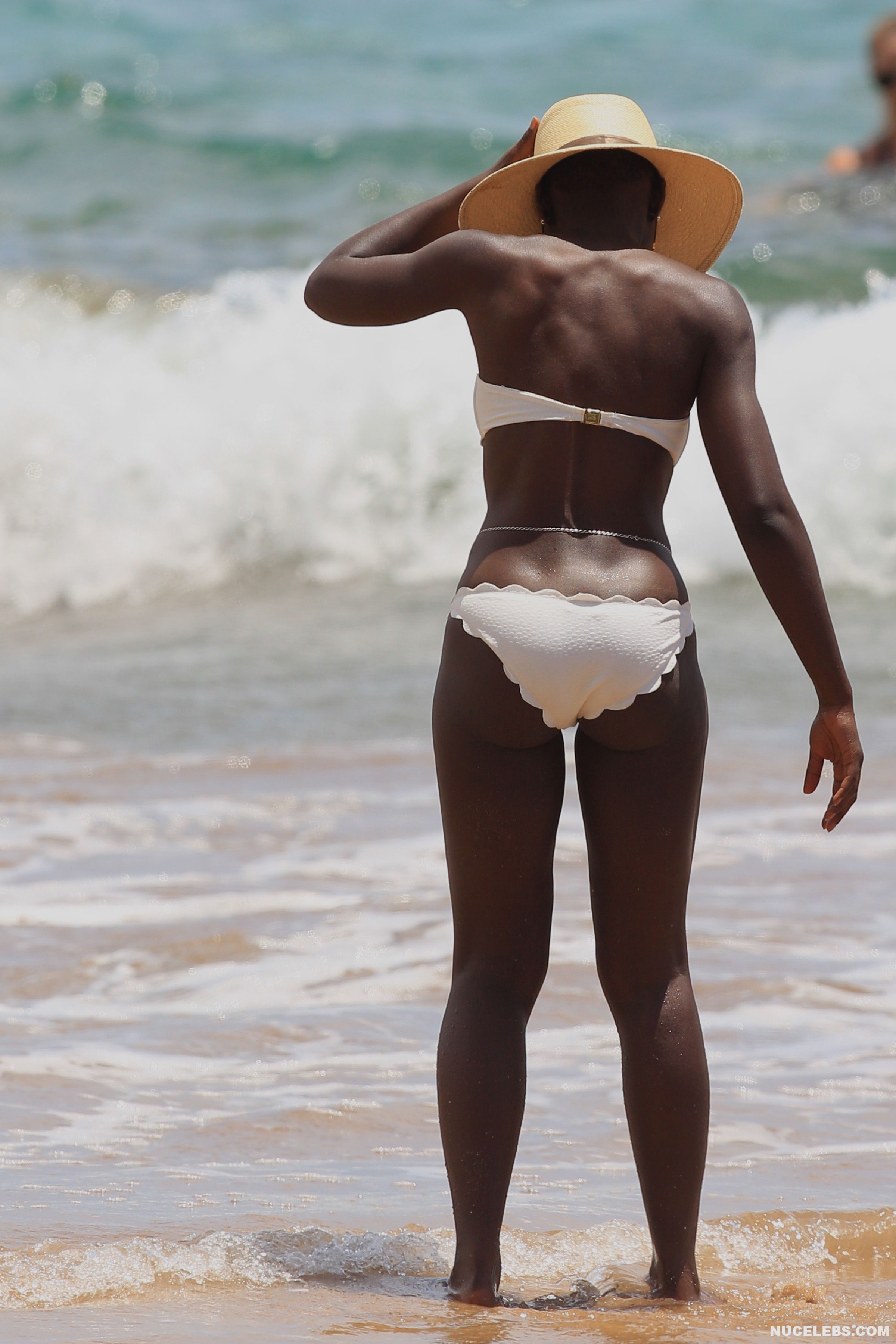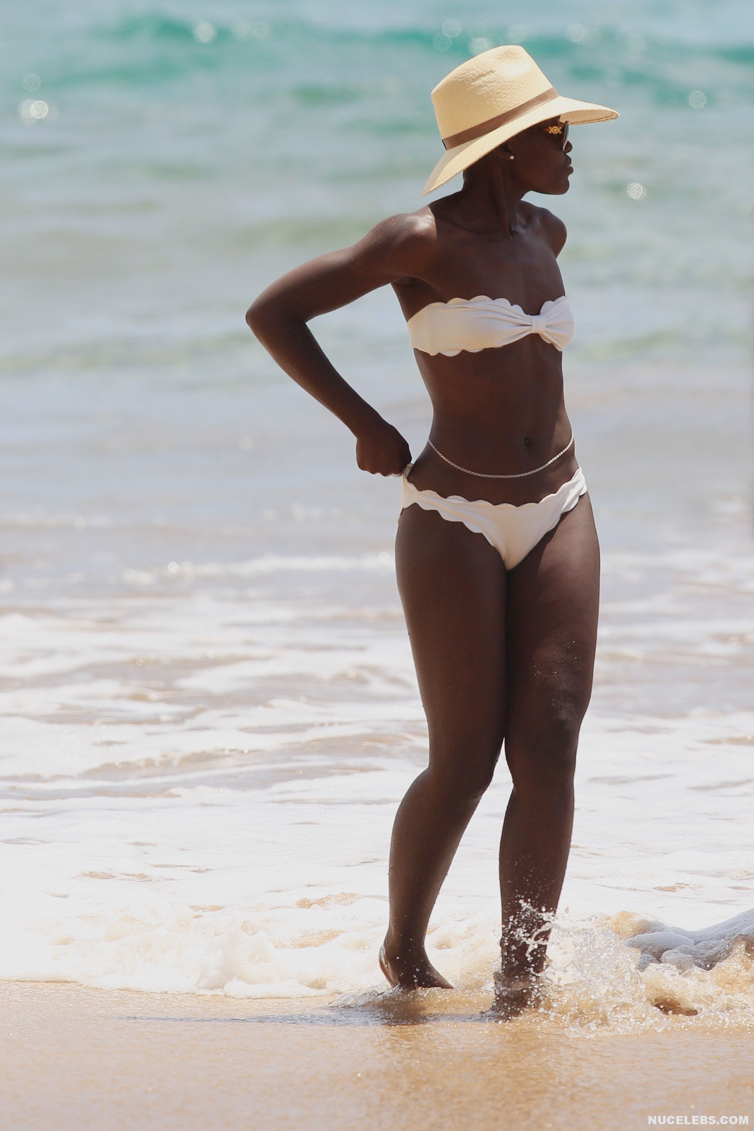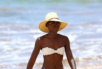 You might start to drool looking at Lupita Nyong’o’s perfect body in a white bikini. Her sweet ass looked especially sexy in tight white panties. And the small bra seemed ready to slip off her tits at any moment. Also, the paparazzi managed to take Lupita Nyong’o upskirt pictures in a silver dress when she got out of the car.