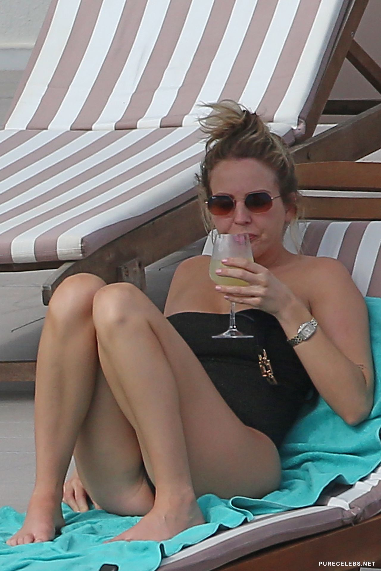 Not so long ago, the English television personality Lydia Bright, who recently broke up with her boyfriend Lee Cronin, announced her pregnancy. In addition, she even decided to sunbathe on a sunbed, where she was immediately caught by the paparazzi. The girl was wearing a black swimsuit, which barely covered her awesome boobs and showed her gorgeous ass. This beauty looked insanely seductive and hot, right?