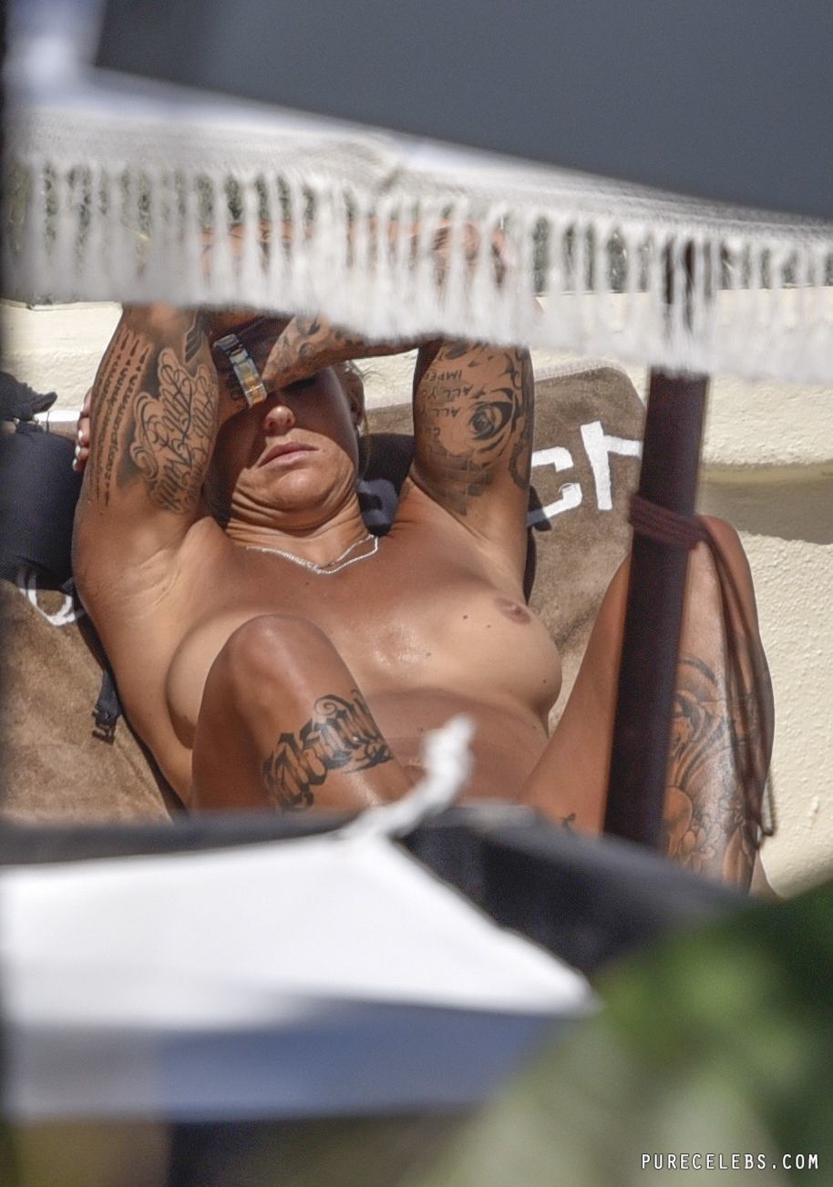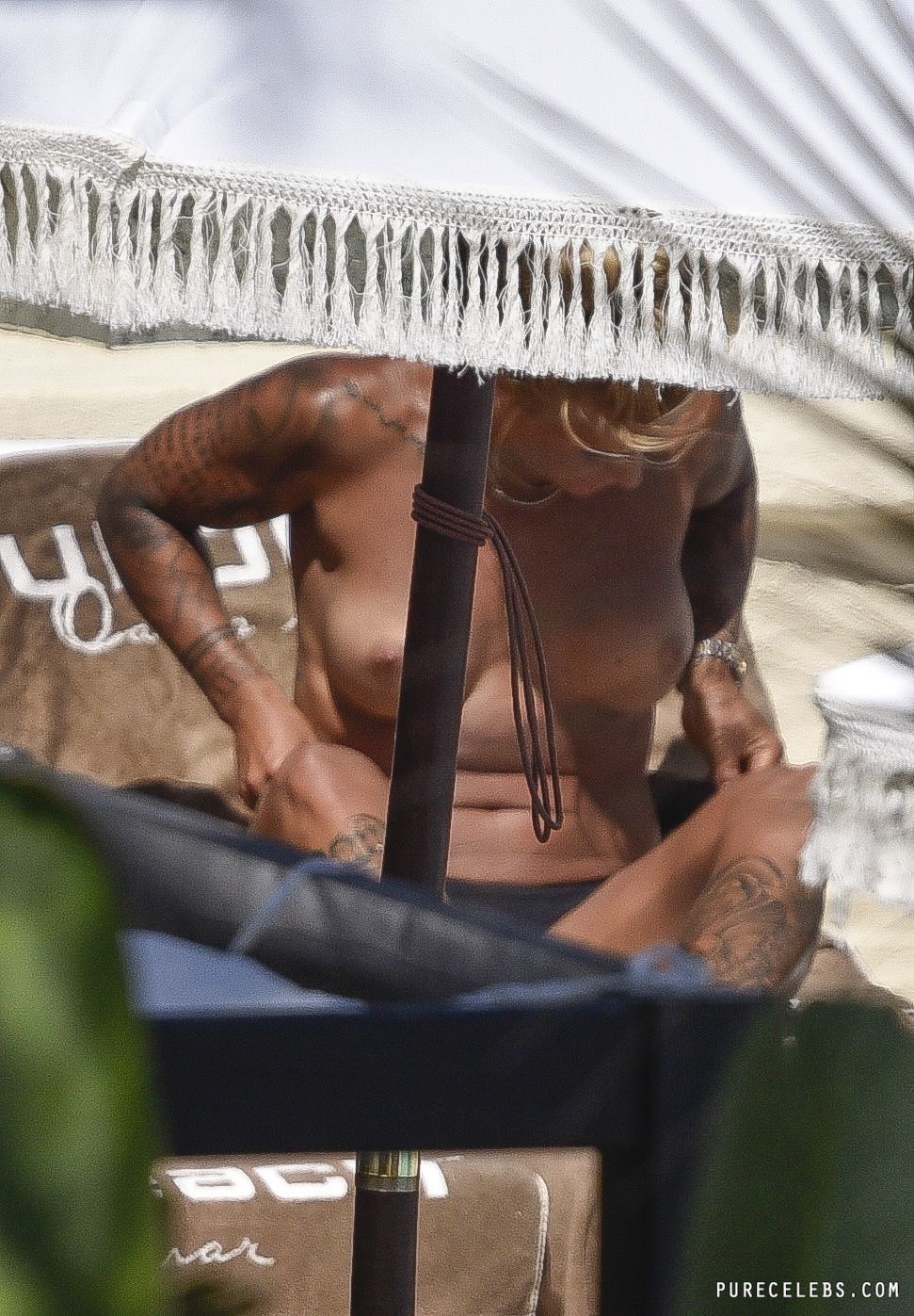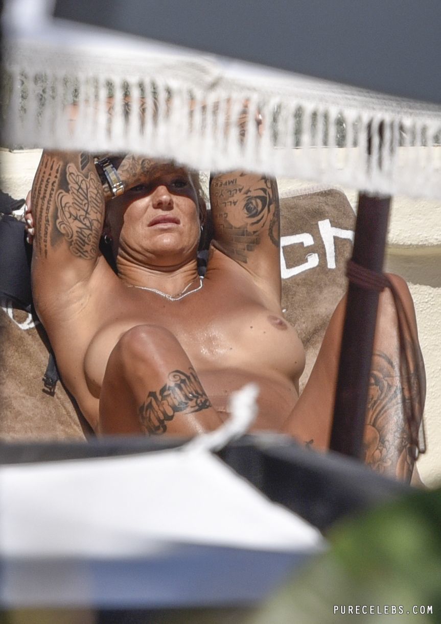 Paparazzi do not leave alone Madeleine Vall Beijner, one of the best Thaiboxer in the world. So they photographed this celebrity during her vacation. First, the girl bathed in the pool, dressed in a small black bikini. But after she emerged from the water, the star decided to take off her bra. So now we can admire Madeleine Vall Beijner’s nude boobs with brown nipples when she is sunbathing.