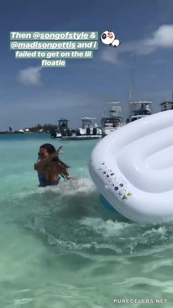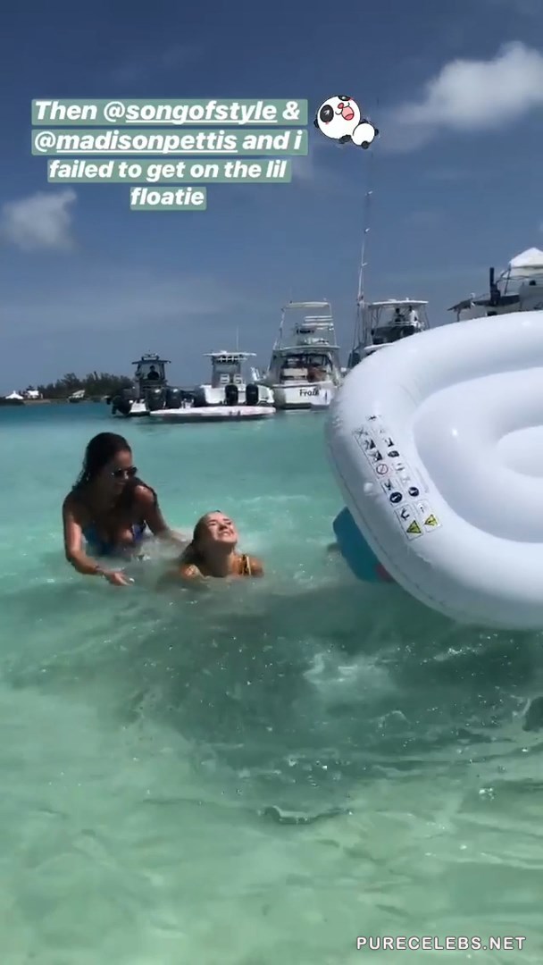 The day with friends was so good that Madison Pettis could not stop laughing, even when they all fell out of an inflating boat, straight into the water and her boob also escaped that bikini top for a moment. This adorable twenty year old honey looks so sexy and we love to see her rocking bikinis that are loose enough to give us a nislip view here and there.