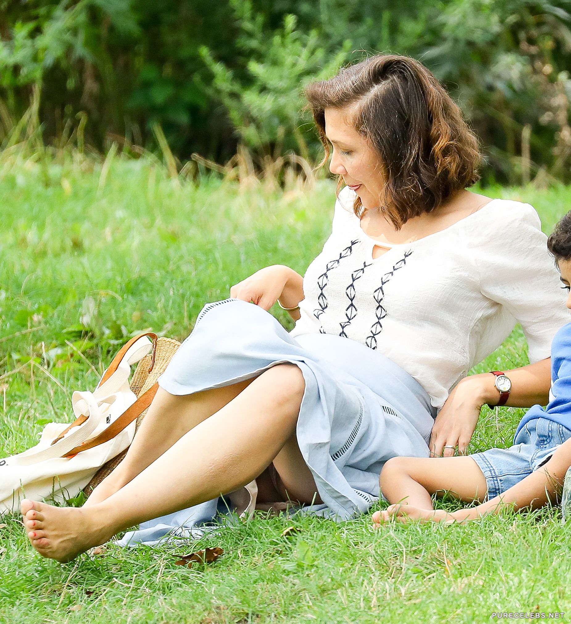 Maggie Gyllenhaal has recently been busy filming a new season of the hit show The Deuce, so budy that she forgot to wear underwear. The hot brunette was recently spotted by paparazzi while having a picnic with her friends and as she got up to adjust her skirt paparazzi were able to catch a glimpse of her crotch. The 40 year old MILF failed to conceal her snatch from the eyes of the public.