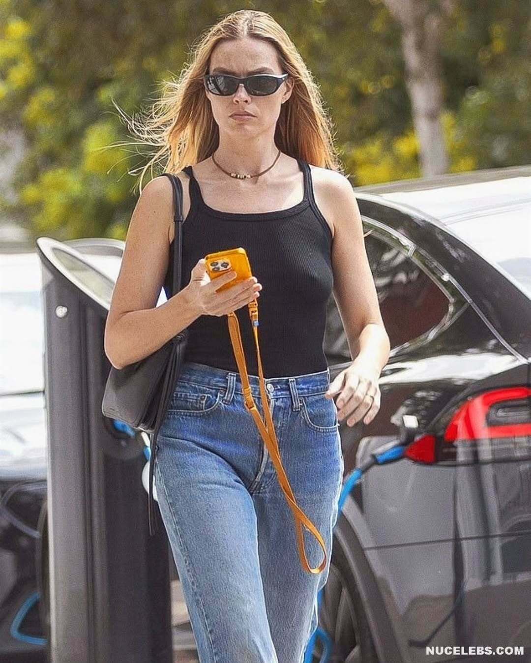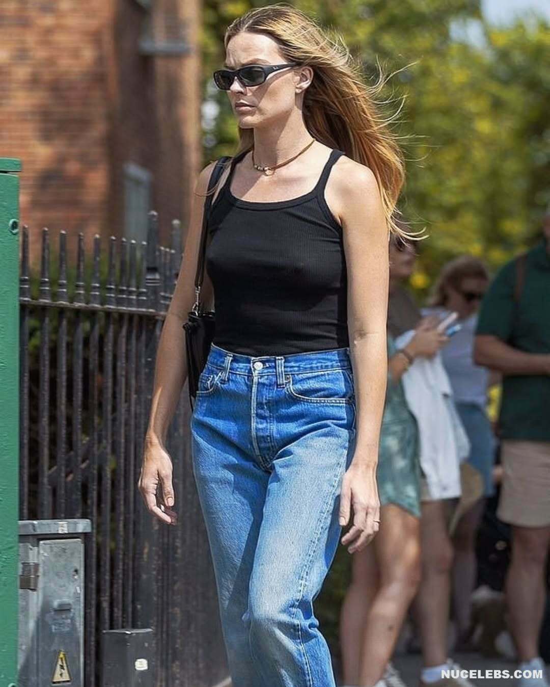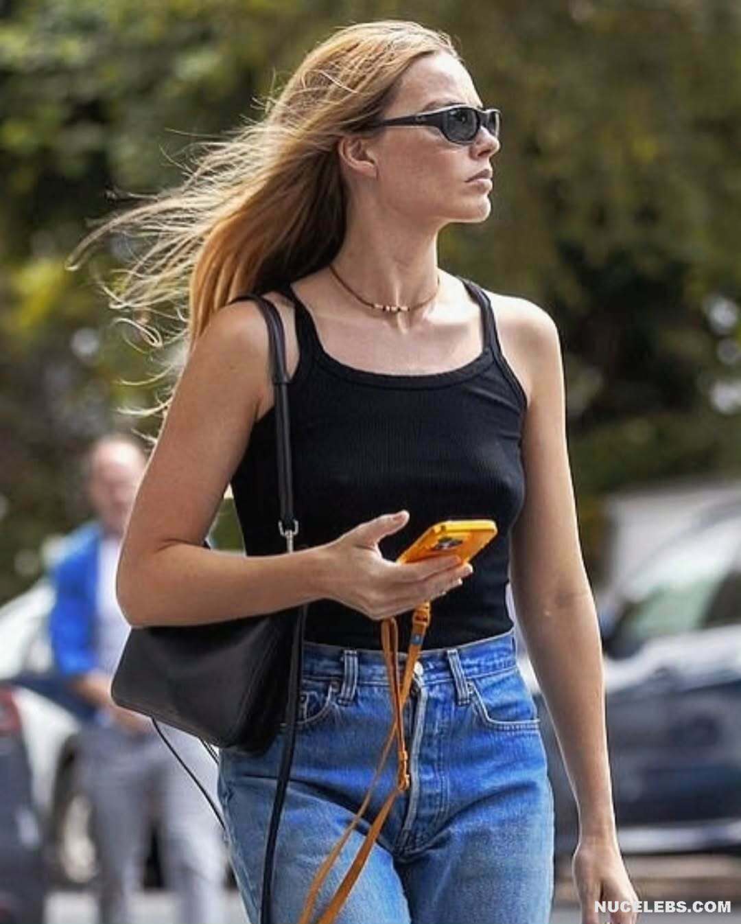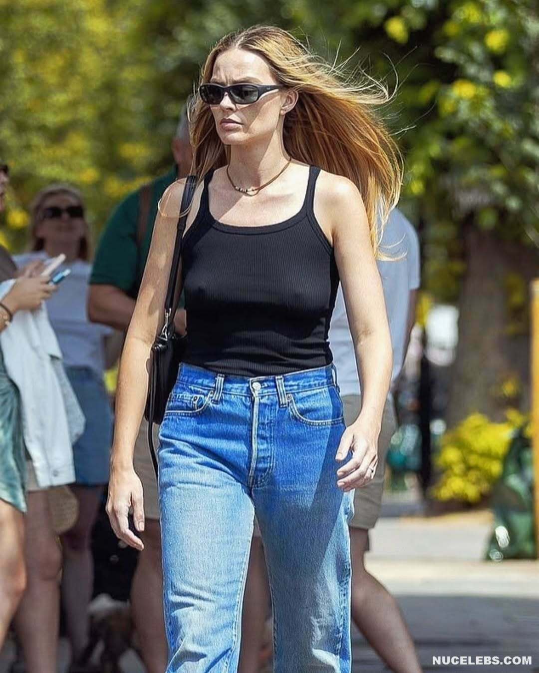 Margot Robbie has once again delighted her fans with her provocative photos. This charming Australian actress does not like wearing a bra at all. And we like it! After all, the paparazzi managed to take many pictures of Margot Robbie poking nipples! The celebrity was walking down the street, and her tight black top perfectly emphasized her miniature boobies. Oh, she is such a hot thing, it is simply impossible to resist!