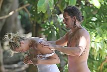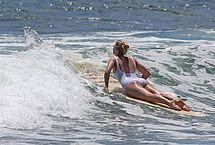 Australian actress Margot Robbie was having a fun day at the beach, surfing in her white, one piece bikini, and the paparazzi were there with her waiting for a hot candid shot. She showed them her pokies through a wet bathing suit, as well as a nice view of her silky ass, when she reached down to pick up her surfing board.