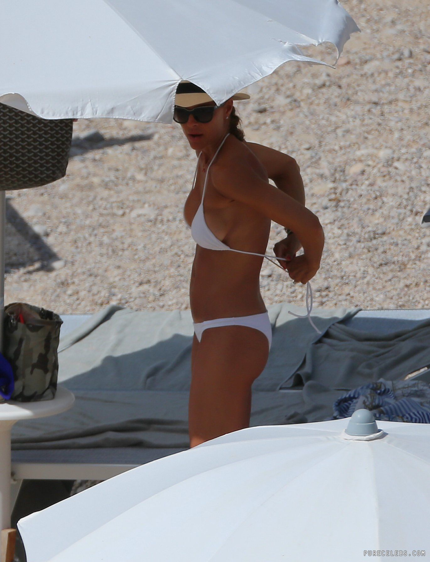 Paparazzi managed to photograph the nude boobs of Italian actress Martina Colombari. The girl just decided to relax on the beach. And while the celebrity changed clothes, paparazzi caught her topless. Martina Colombari just took off her shirt and everyone around could see her juicy nude boobies with brown nipples. In addition, her white panties not only emphasized her awesome ass but also demonstrated her gorgeous cameltoe.