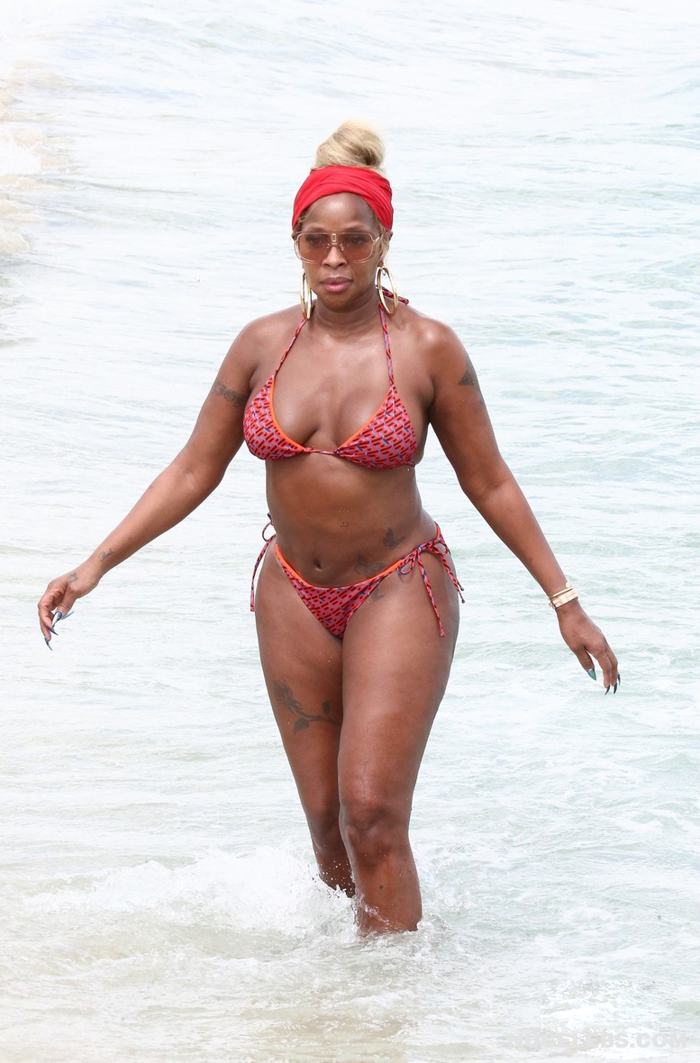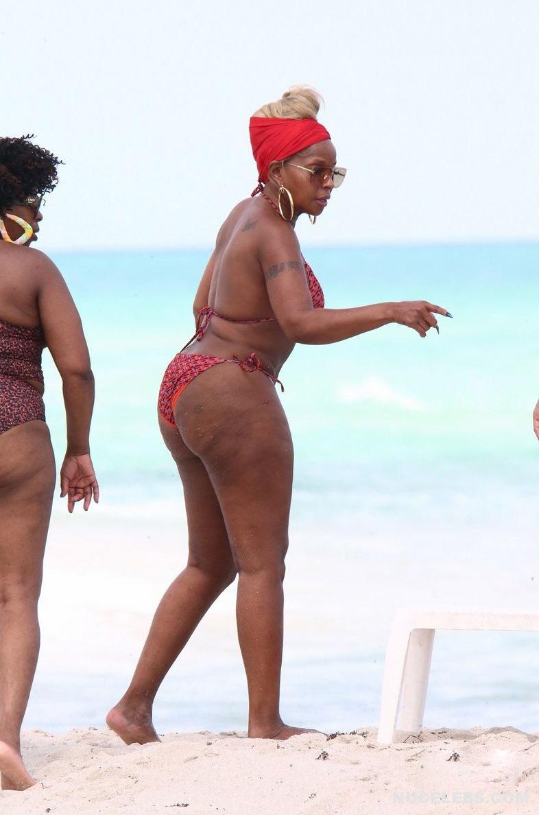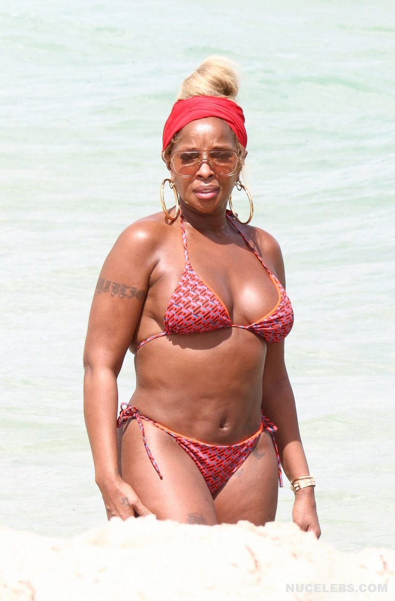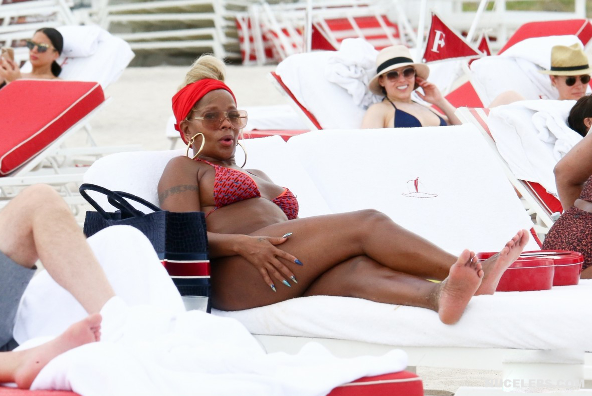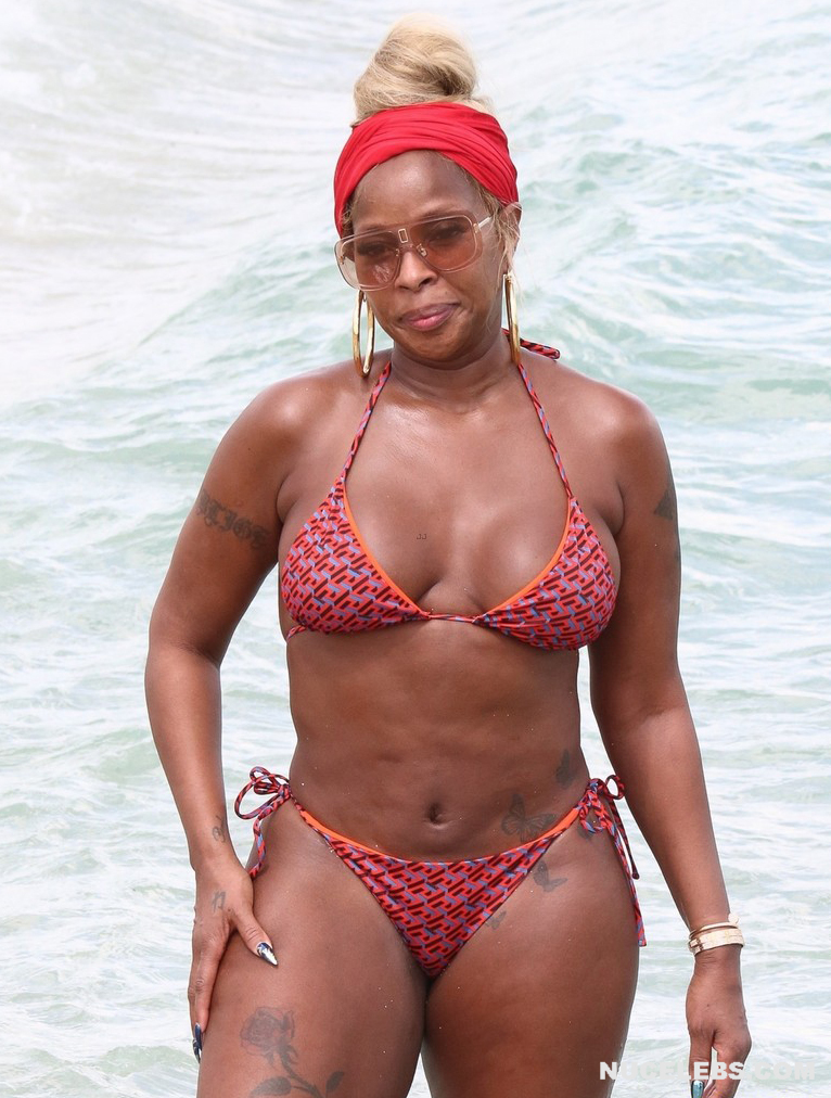 Mary J. Blige decided to soak up the sun on the seashore, and the paparazzi immediately began to photograph her. Well, it seems that this American singer did not want to hide her gorgeous body from the public at all. Her red and orange print bikini seemed too small for Mary J. Blige’s nude huge boobs and her gorgeous peach booty. A red bandana and big glasses perfectly complemented her image!
