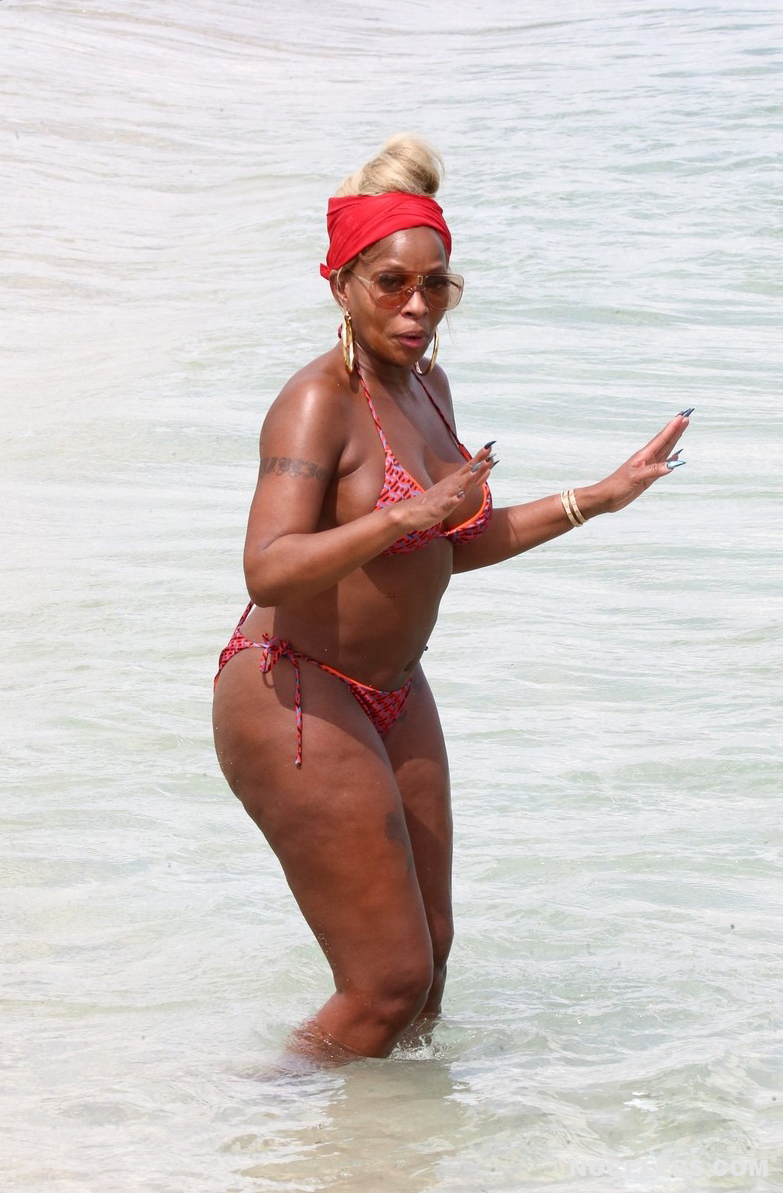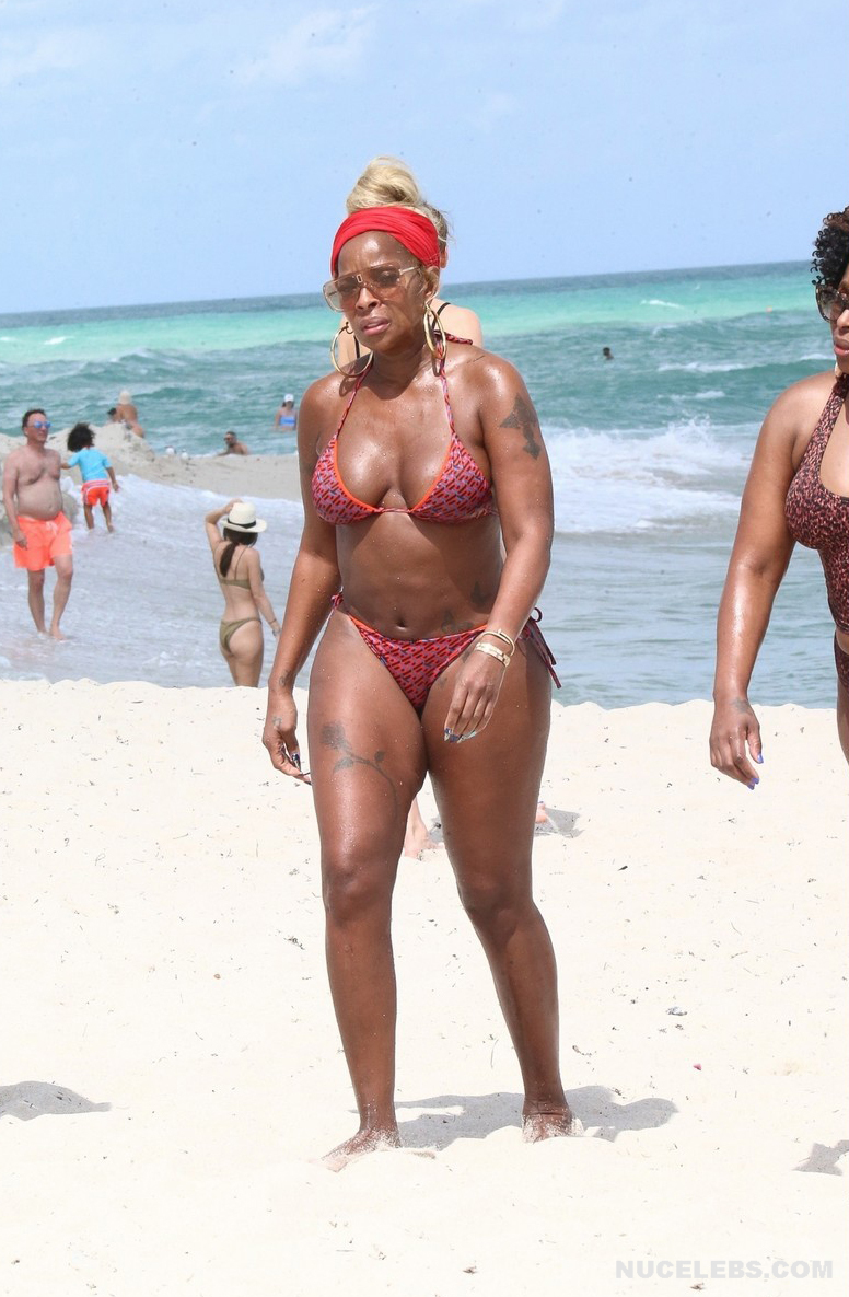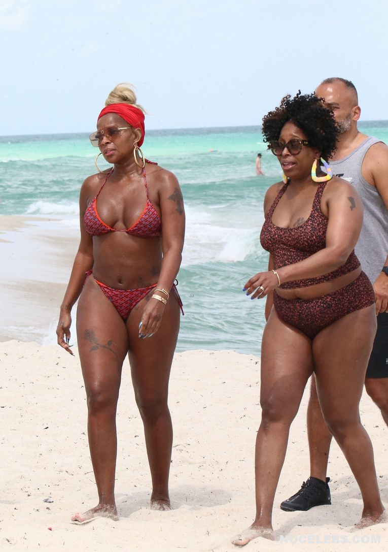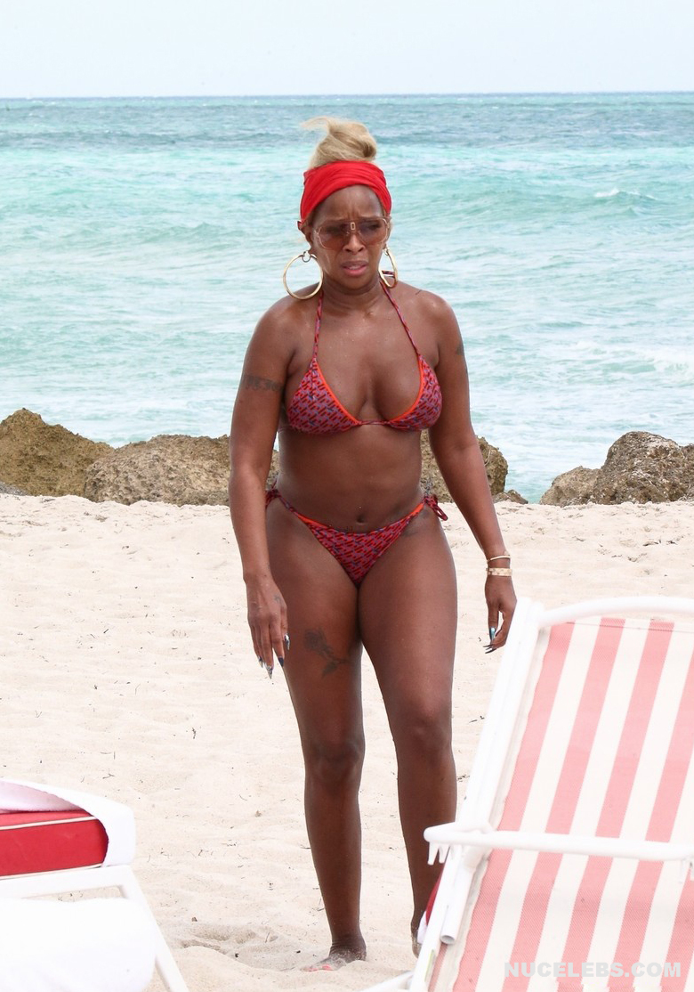 Mary J. Blige decided to soak up the sun on the seashore, and the paparazzi immediately began to photograph her. Well, it seems that this American singer did not want to hide her gorgeous body from the public at all. Her red and orange print bikini seemed too small for Mary J. Blige’s nude huge boobs and her gorgeous peach booty. A red bandana and big glasses perfectly complemented her image!