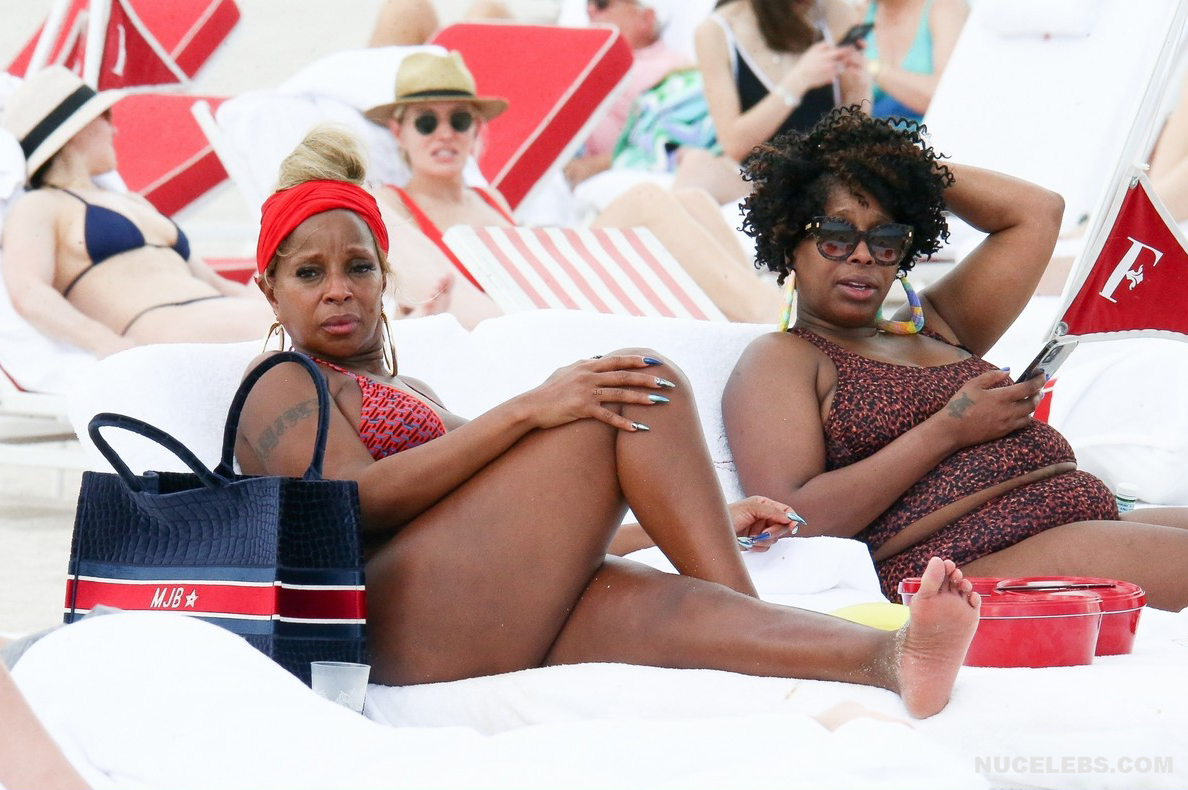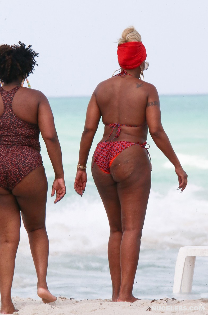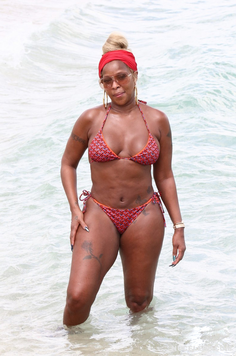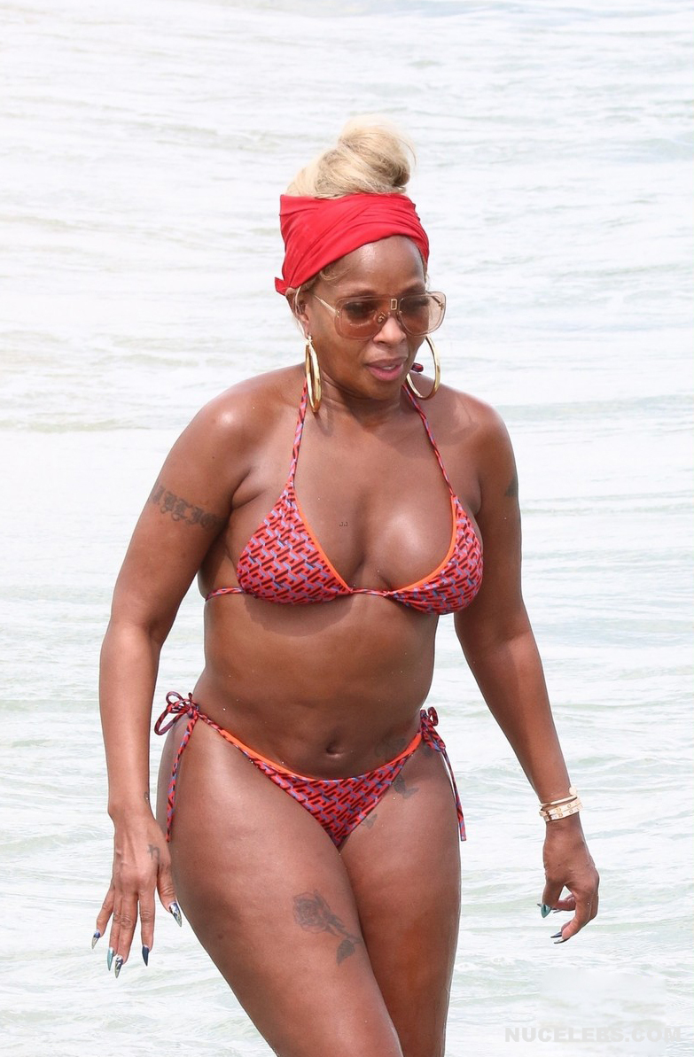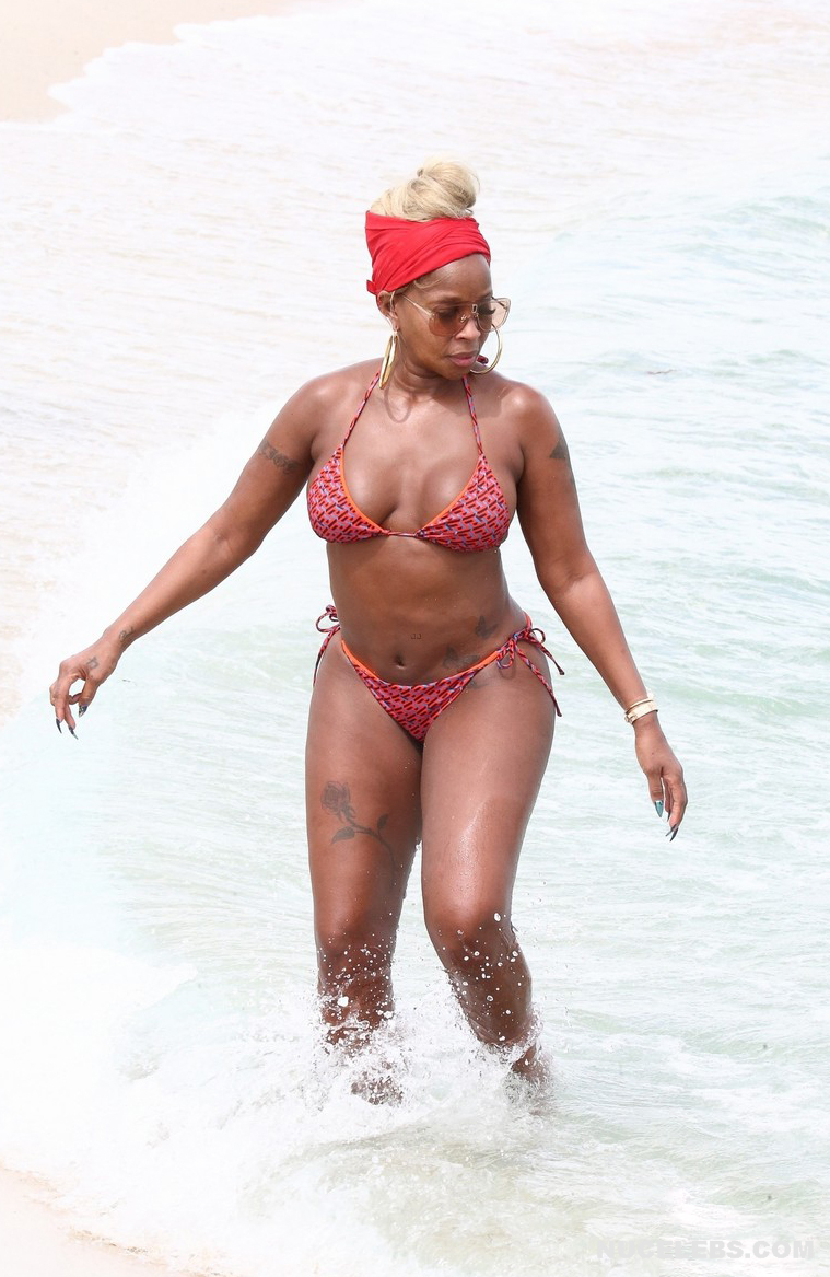 Mary J. Blige decided to soak up the sun on the seashore, and the paparazzi immediately began to photograph her. Well, it seems that this American singer did not want to hide her gorgeous body from the public at all. Her red and orange print bikini seemed too small for Mary J. Blige’s nude huge boobs and her gorgeous peach booty. A red bandana and big glasses perfectly complemented her image!