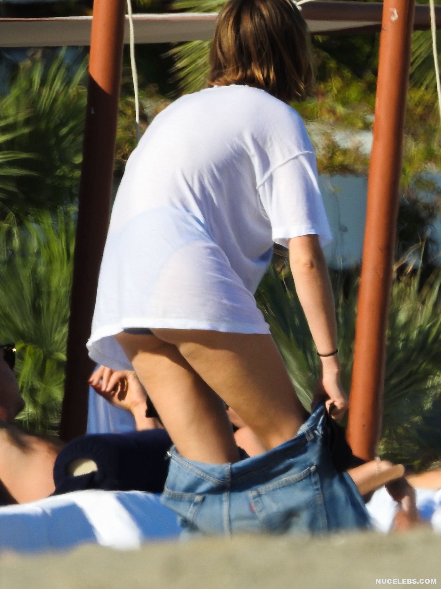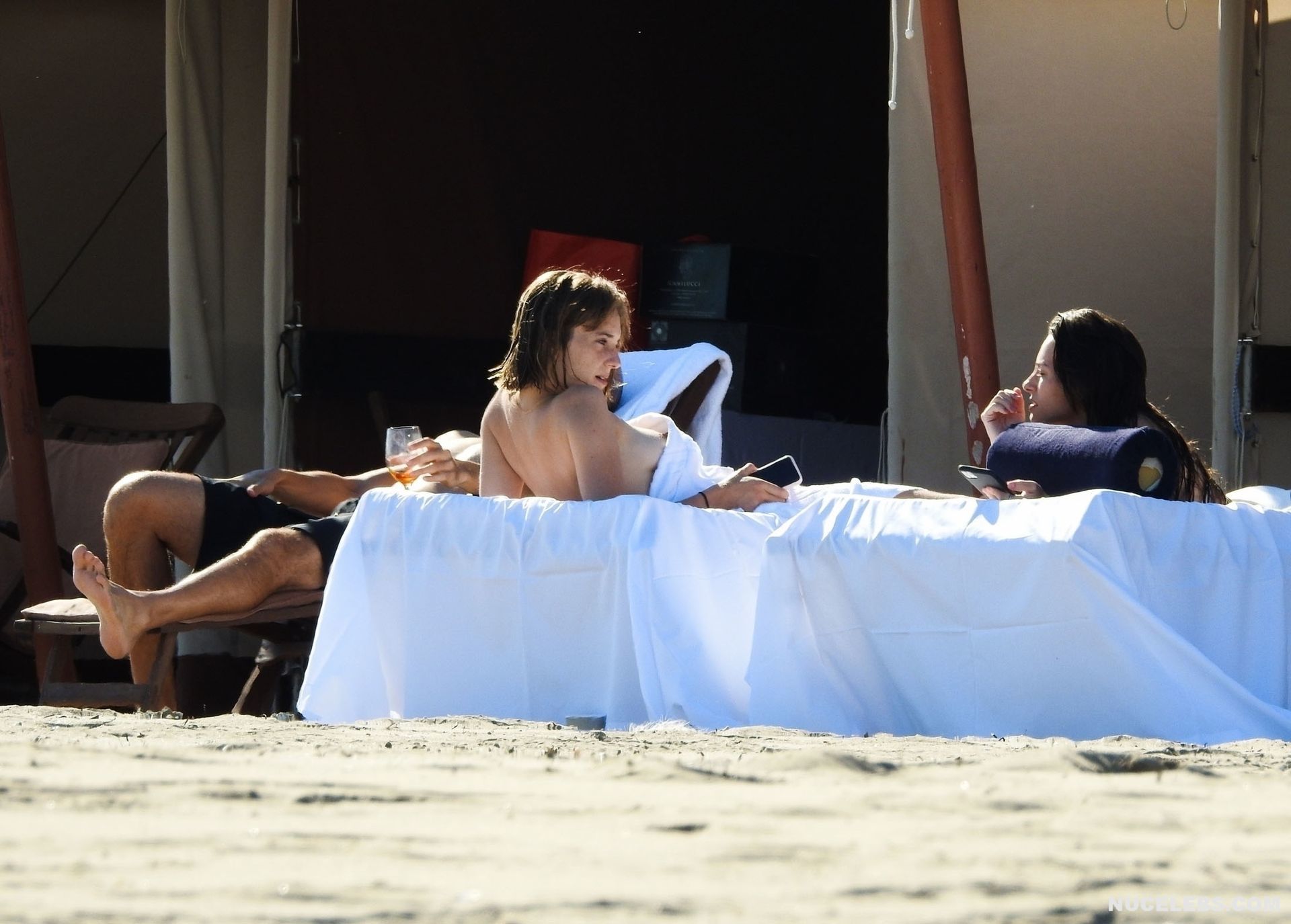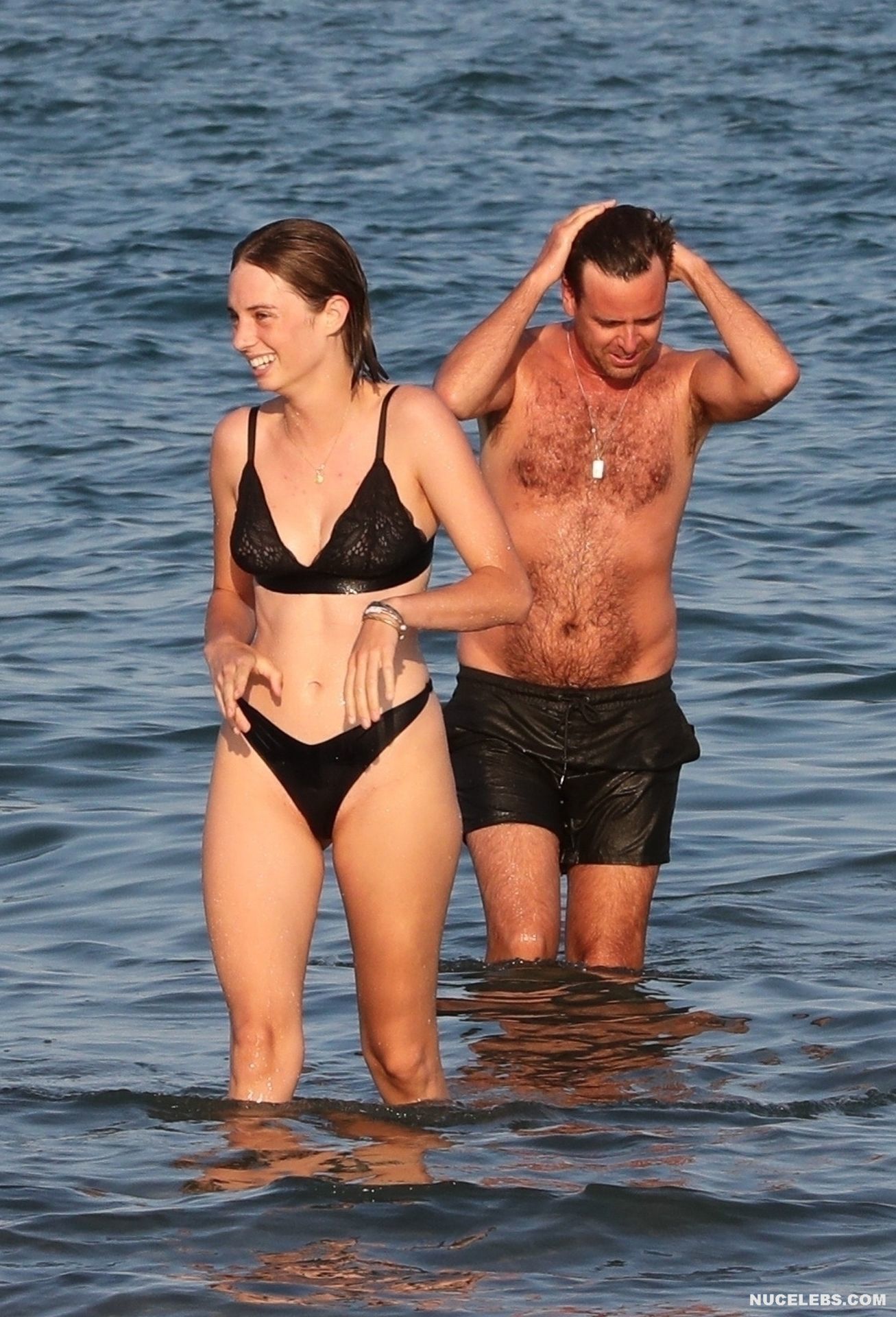 Paparazzi managed to photograph Maya Hawke’s nude boobs right on the beach! The celebrity was just lying on a lounger, and her naked breasts were covered with a white towel. However, when she lifted herself up, the towel slipped off Maya Hawke’s nude tits with a hard nipple. By the way, her pictures in a black bikini turned out to be very sexy. Especially hot looked her wonderful ass, covered only with a narrow strip of the thong.