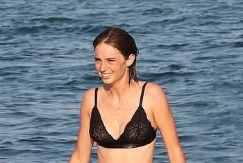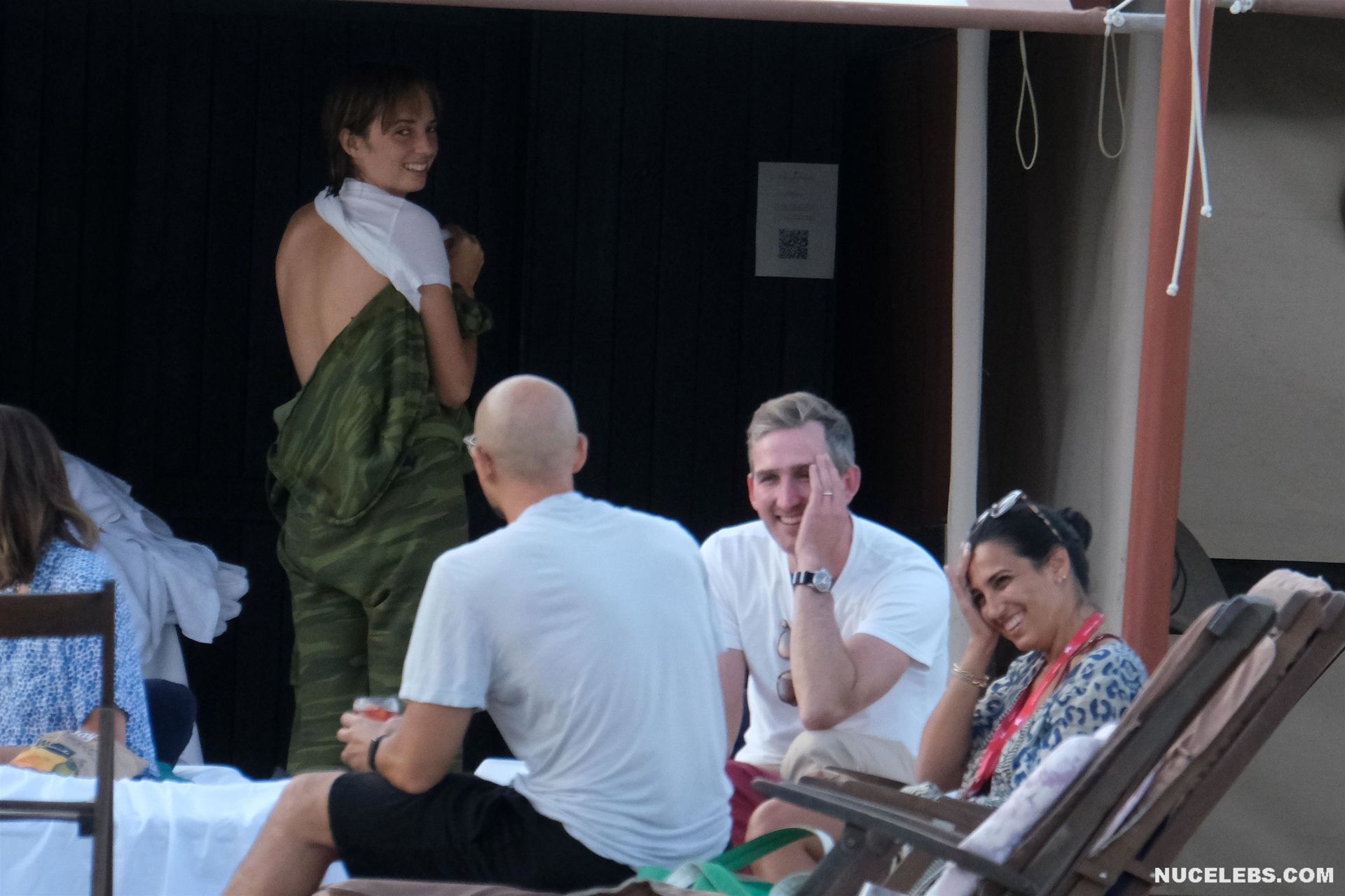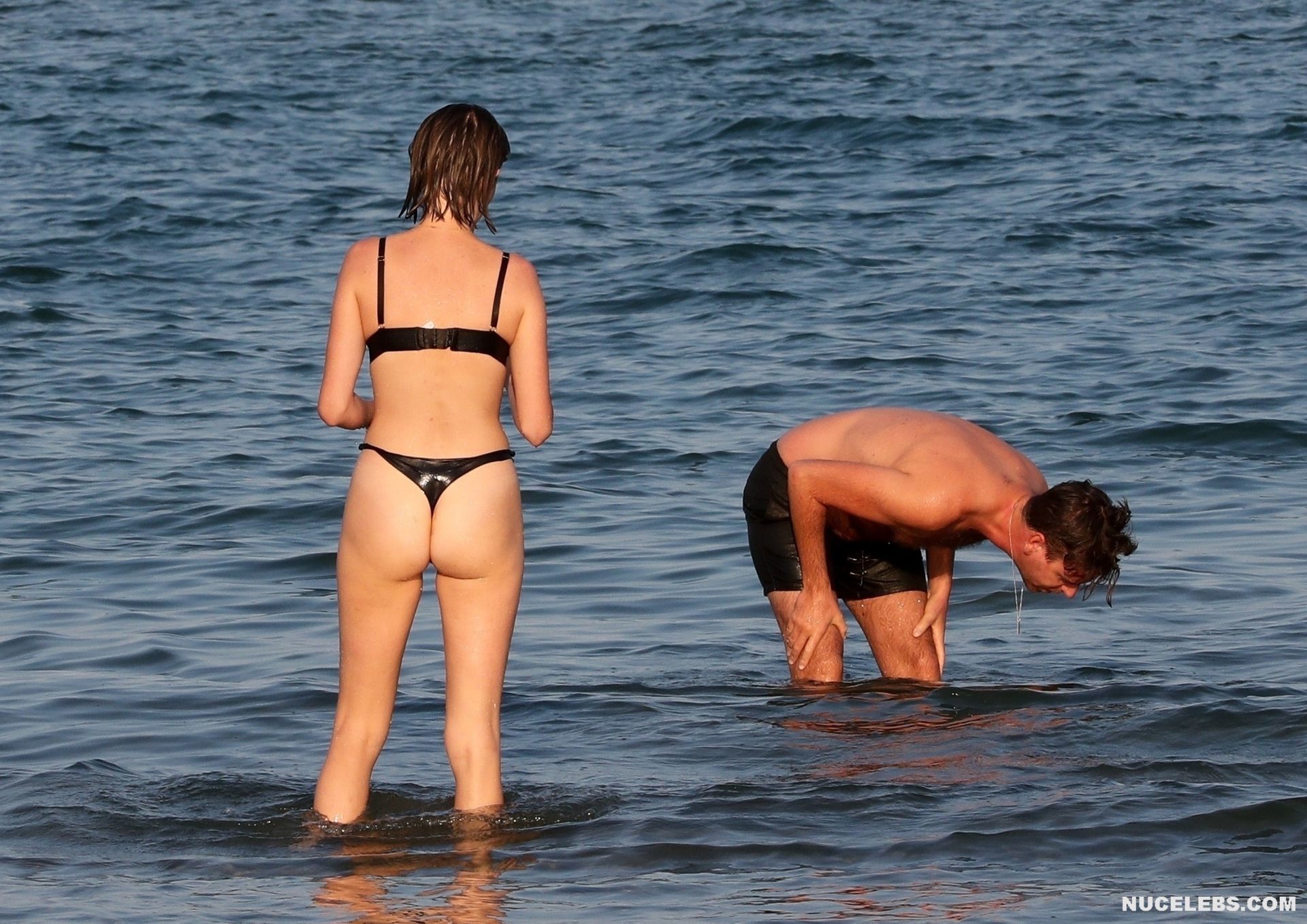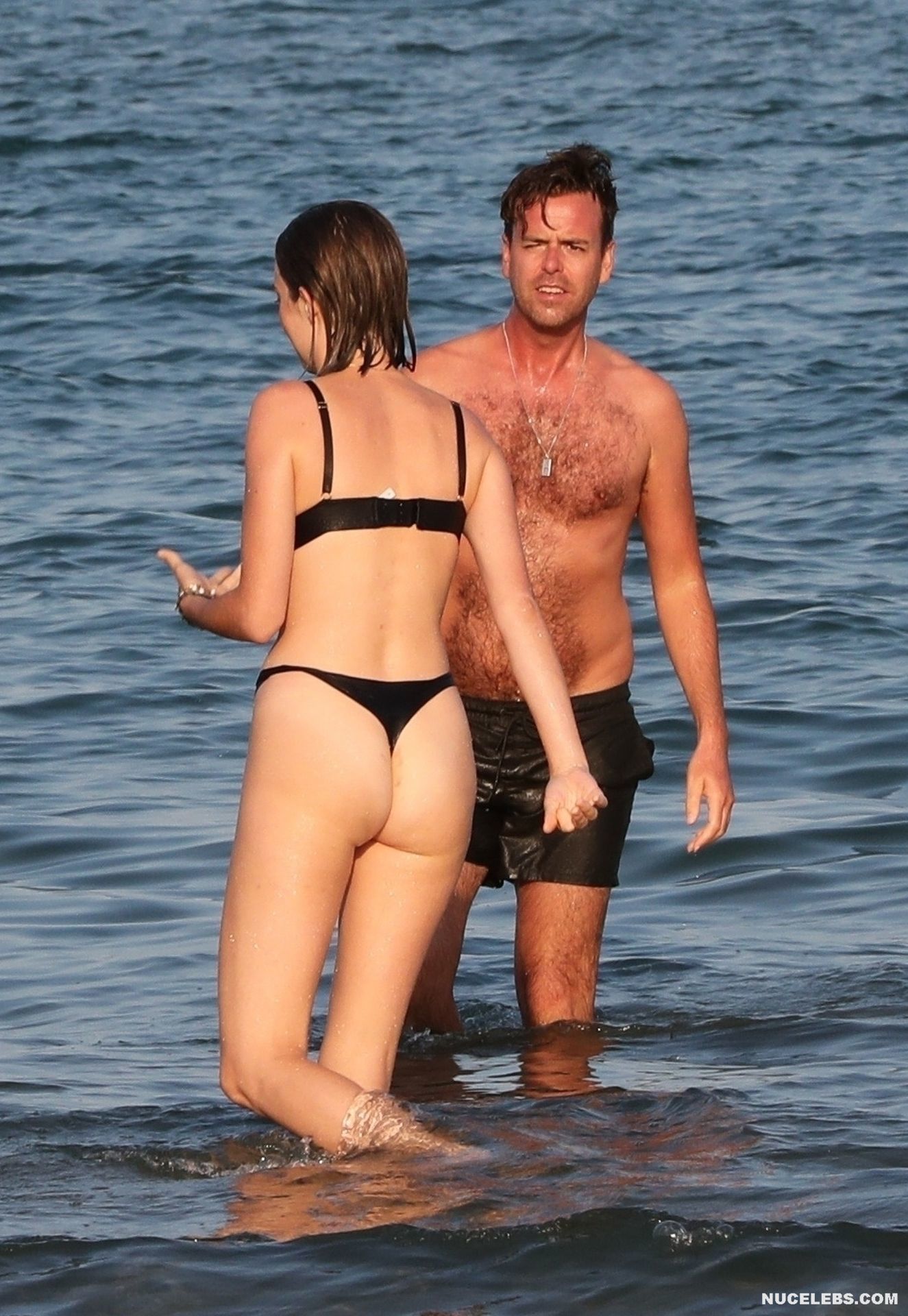 Paparazzi managed to photograph Maya Hawke’s nude boobs right on the beach! The celebrity was just lying on a lounger, and her naked breasts were covered with a white towel. However, when she lifted herself up, the towel slipped off Maya Hawke’s nude tits with a hard nipple. By the way, her pictures in a black bikini turned out to be very sexy. Especially hot looked her wonderful ass, covered only with a narrow strip of the thong.