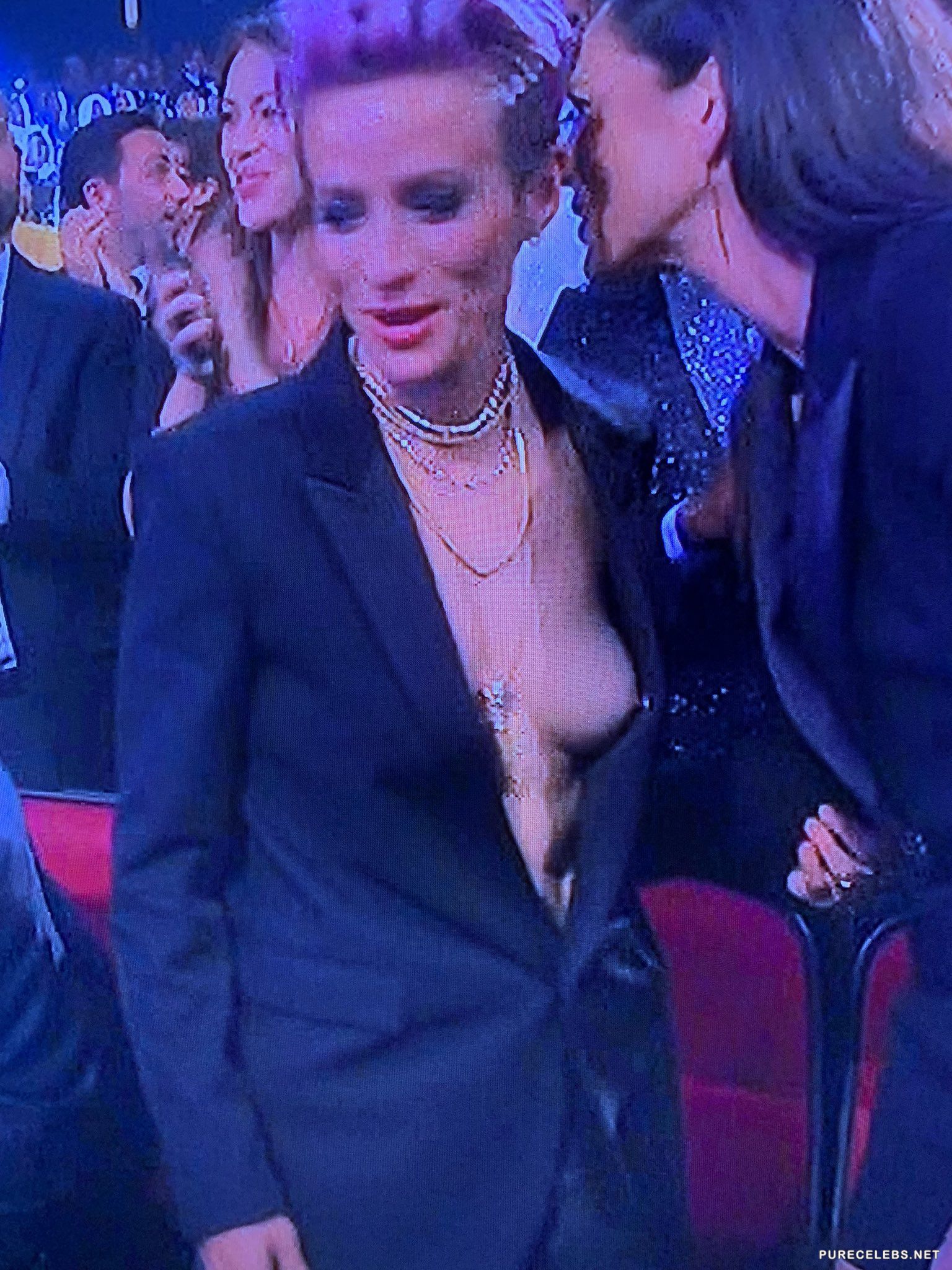 American professional soccer player Megan Rapinoe has an incredibly seductive body, which she always tries to keep in good shape and shows off with pleasure to the public. Recently, a charming blonde attended the event, dressed in a black-fitting jacket over her naked body. Since the celebrity did not put on a bra, and the jacket had a deep neckline, at some point her wonderful boob with a hard nipple slipped out of it.
