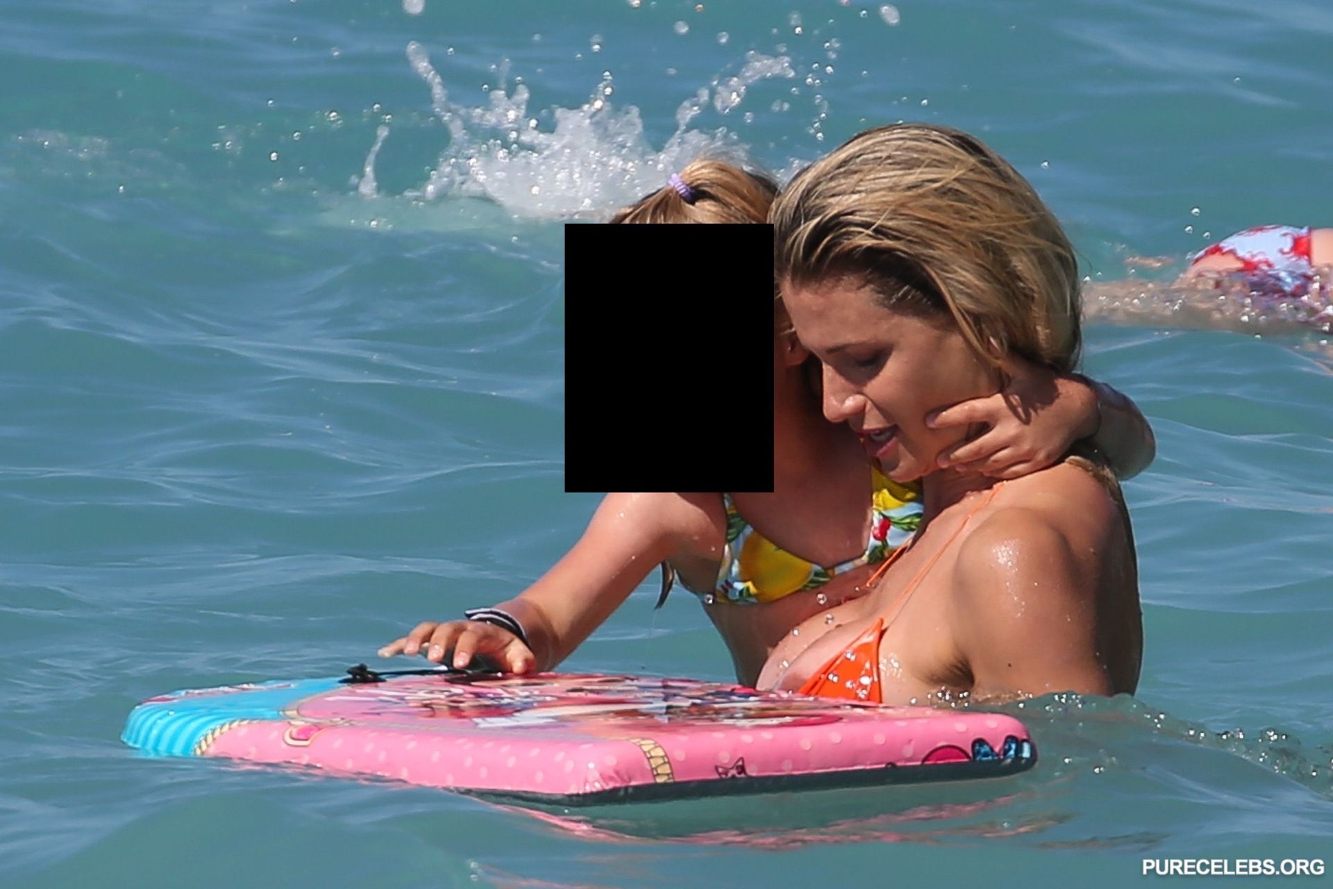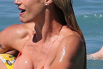 Hot blonde Michelle Hunziker accidentally flashed her nude titties while on a beach vacation. This celebrity looked amazing in an orange bikini when swimming in the sea. Wet panties perfectly emphasized the beauty of her awesome butt. And at one point Michelle Hunziker nude boob with a brown nipple slipped out of a small wet bra. Fortunately, paparazzi managed to catch this nipple slip moment.