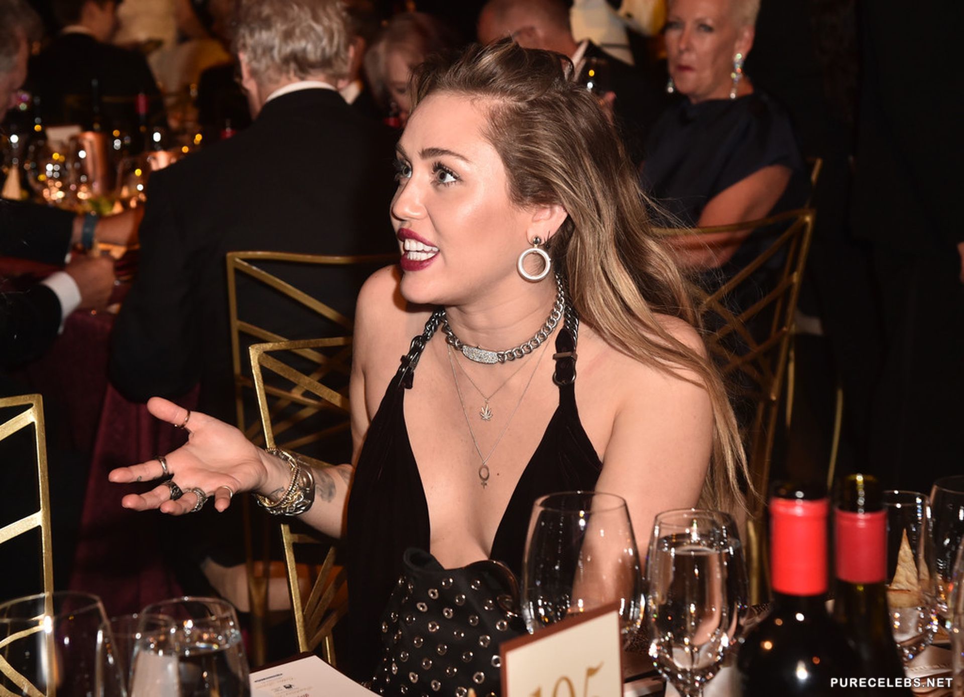 Miley Cyrus is an attention whole along with being a regular whore. That means that she needs to be in the center of attention all the time. Since she has no real talent, she can only get people to notice her with her hot body – her sexy ass and her natural pair of tits. She makes a feeble attempt to cover them up at this gala with her friends.