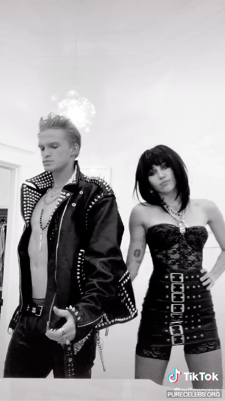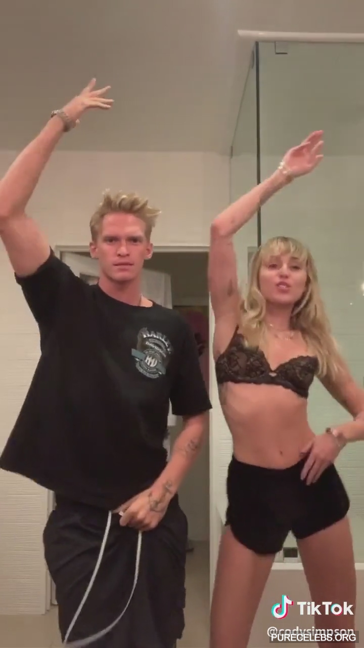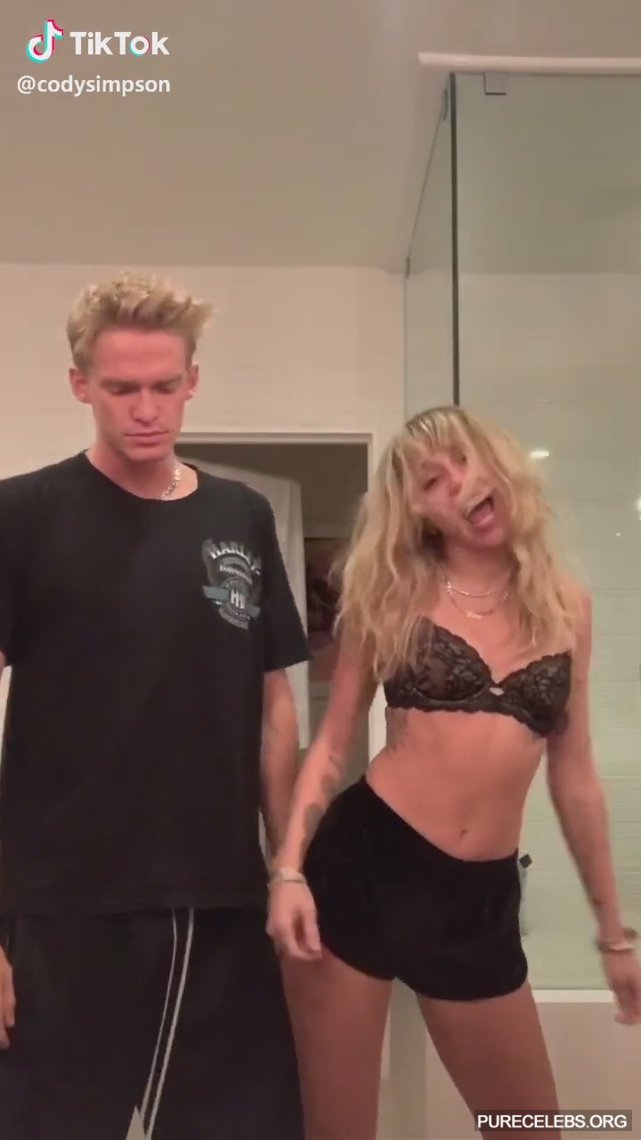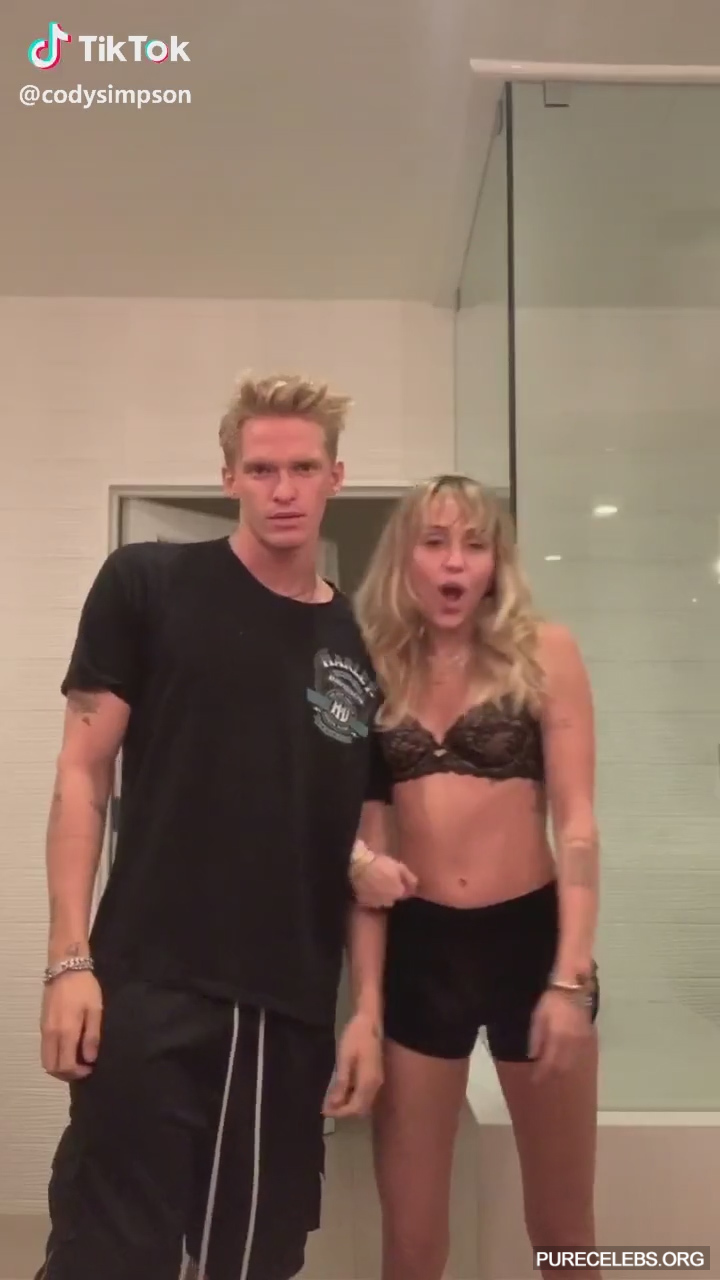 Sweet couple Miley Cyrus and Cody Simpson decided to tease their fans with provocative videos. Hot blonde Miley just looked amazing when she danced in front of the camera in a black lace bra, which perfectly fit her amazing boobs, and in black shorts that emphasized the beauty of her hips. In addition, the charming beauty posed in a sexy leather skirt, stockings and lace bodysuit and it looked incredibly hot!