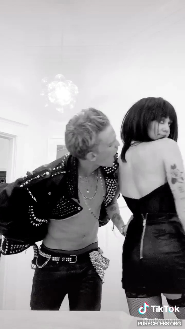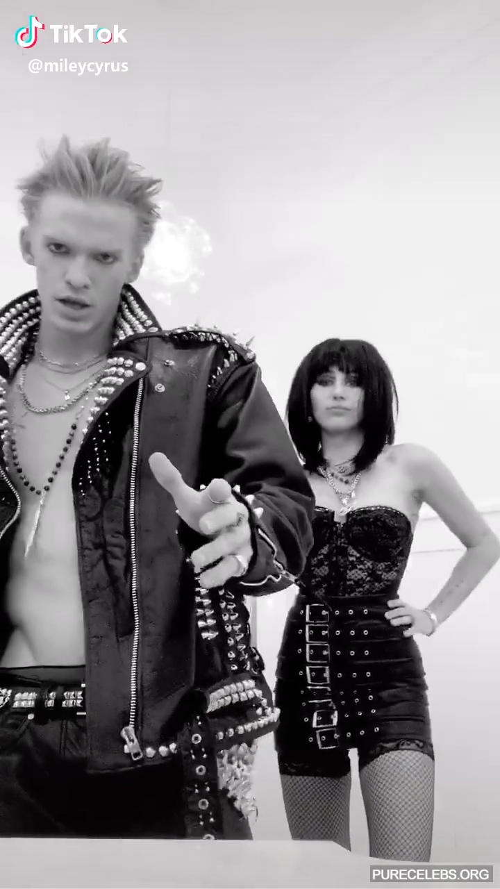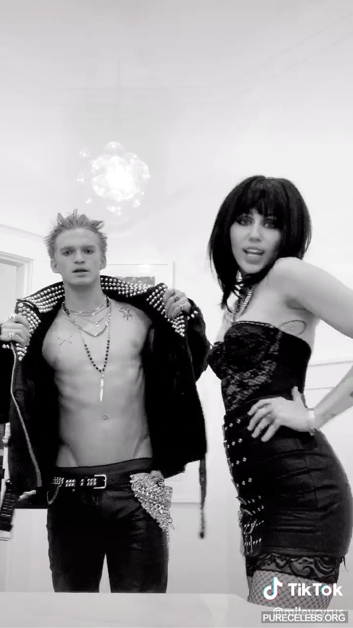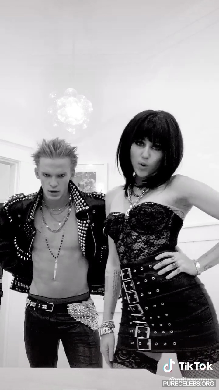 Sweet couple Miley Cyrus and Cody Simpson decided to tease their fans with provocative videos. Hot blonde Miley just looked amazing when she danced in front of the camera in a black lace bra, which perfectly fit her amazing boobs, and in black shorts that emphasized the beauty of her hips. In addition, the charming beauty posed in a sexy leather skirt, stockings and lace bodysuit and it looked incredibly hot!