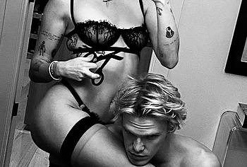 Miley Cyrus fell into scandals more than once after her nude photos appeared on the network. Also, this American singer decided to share her photos in sexy black lingerie, posing next to a guy. The beauty was dressed in black stockings and panties that covered only her sweet pussy. Her bra was very small and translucent and didn’t hide Miley Cyrus’s nude boobies at all. The celebrity seems to have decided to try herself as a sexy hairdresser. She held black scissors in her hands and seemed intent on cutting hair of her boyfriend.