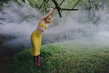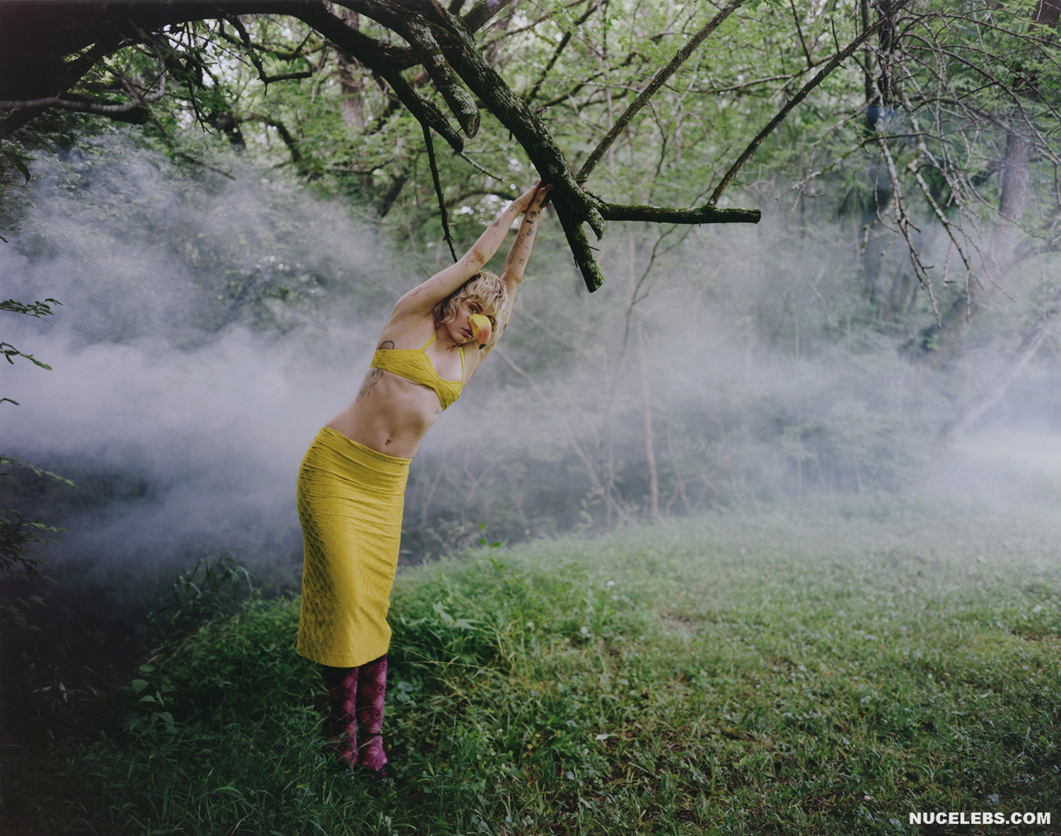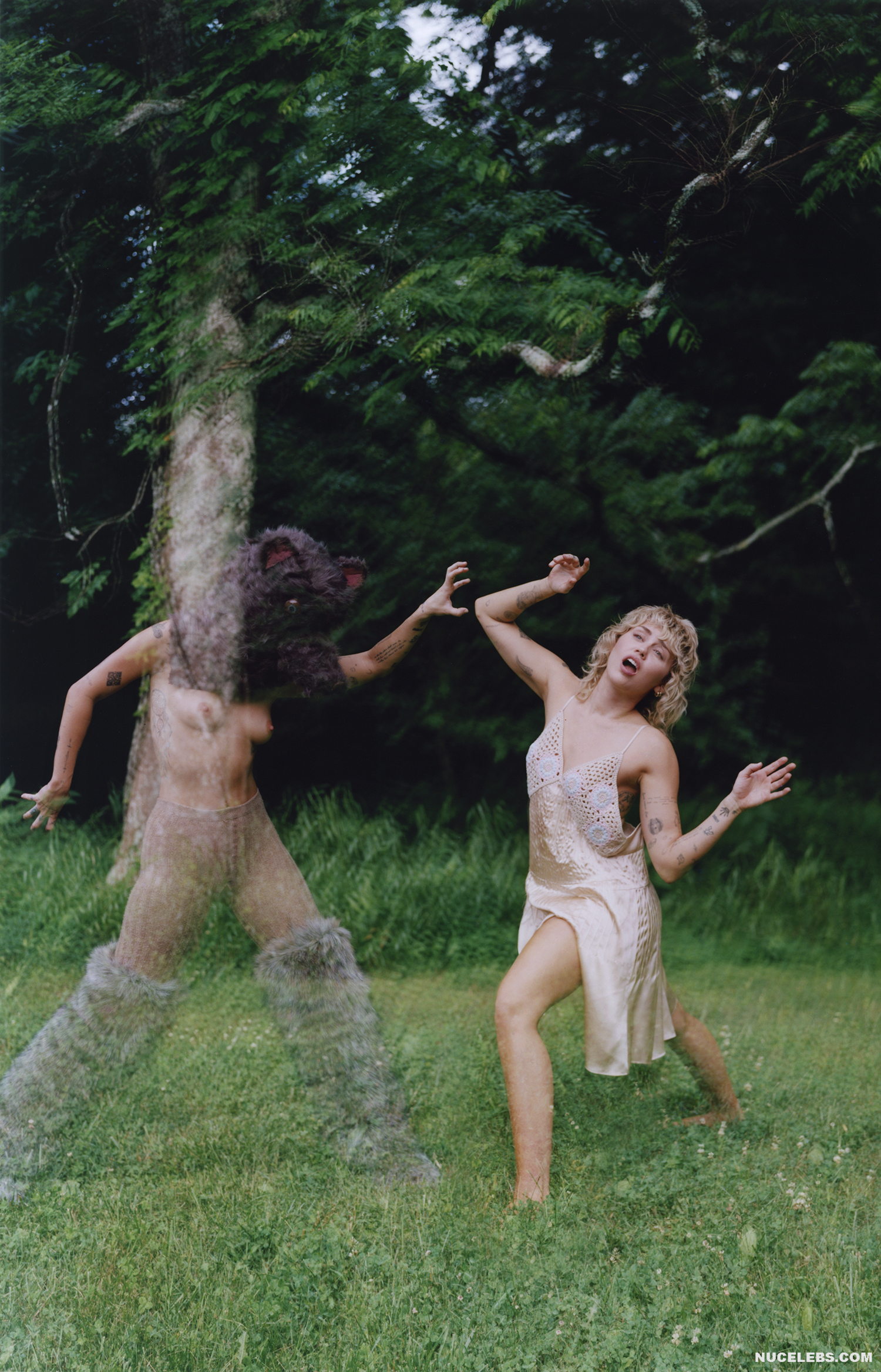 Miley Cyrus appeared before the audience in an unusual and sexy way in a photo shoot for Interview Magazine. So, this singer posed in short dresses and underwear. For example, you will be able to see Miley Cyrus’s nude booty, which was perfectly visible through her black sheer panties. In addition, this star also boasted of her huge boobies with poking nipples. At the same time, Miley Cyrus’s nude titties were perfectly visible through her white tight top. The hottie was jumping in the trees, laying on the lawn in the forest and seductively eating a banana. This naughty beauty will definitely find something to surprise you!