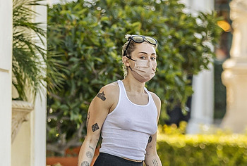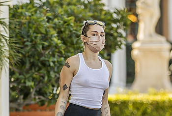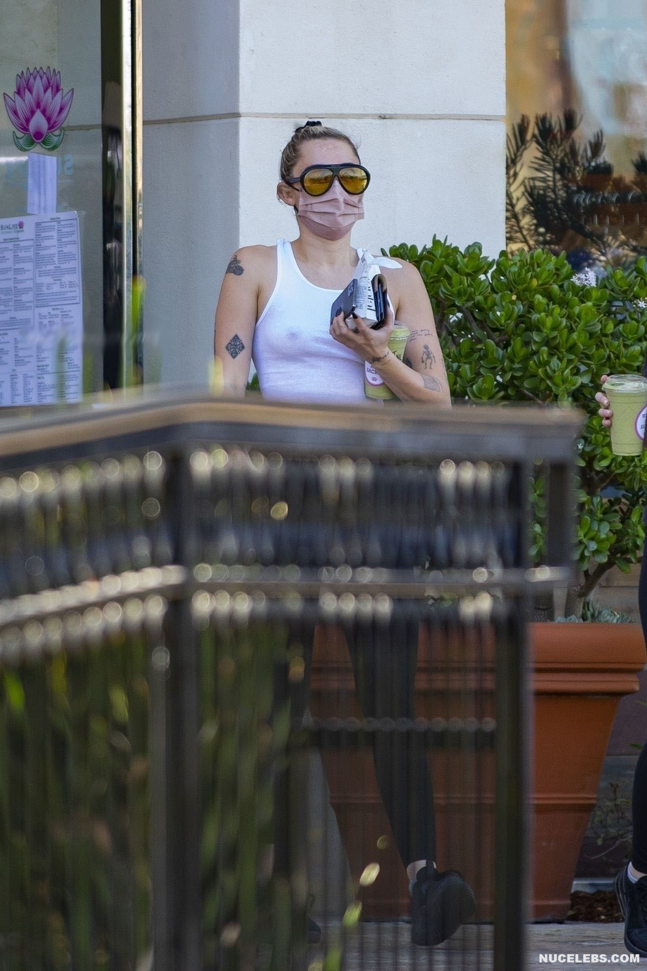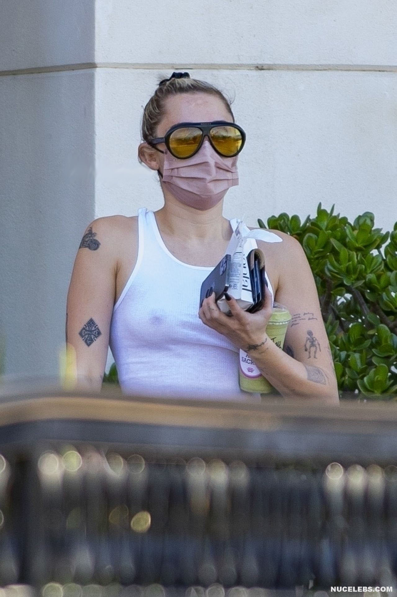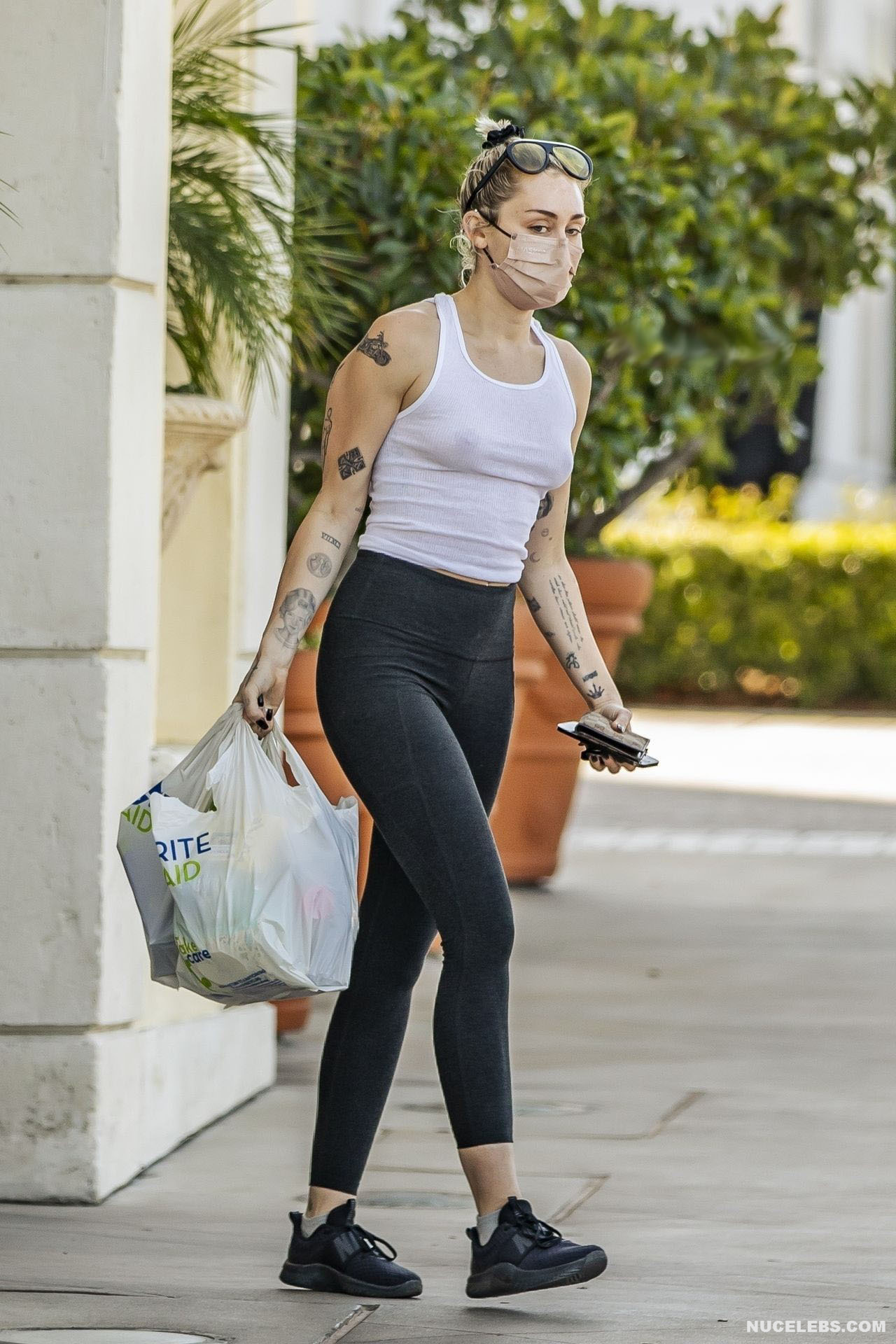 American pop singer Miley Cyrus doesn’t have to do anything to get the attention of the public. After all, it seems that this singer has an innate talent for choosing such outfits for herself that she will always be at the center of discussions and scandals. Recently, the paparazzi managed to photograph this beauty on the street. The girl’s face was covered with a beige mask, tight leggings emphasized her slender hips. But the most attention was attracted by Miley Cyrus nude juicy tits with brown nipples. By the way, everyone could enjoy their view, because they were visible through her translucent white top.