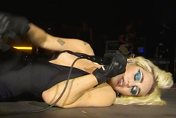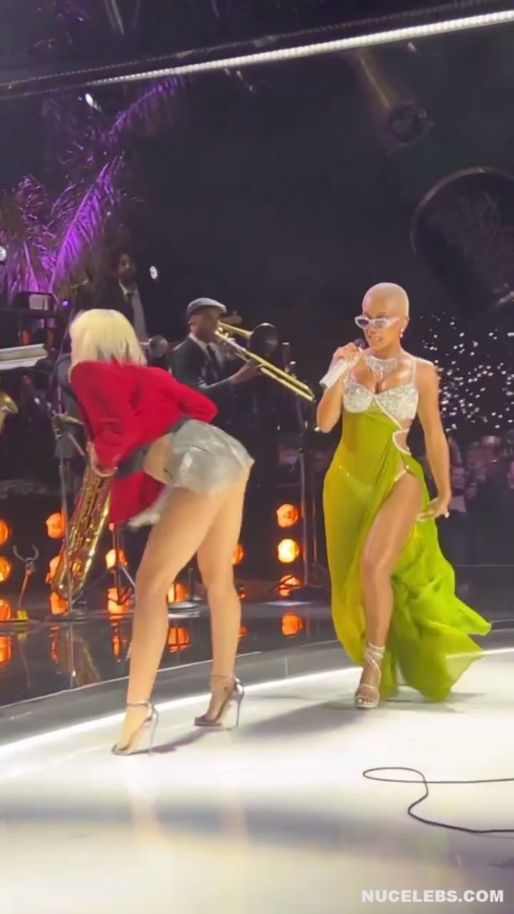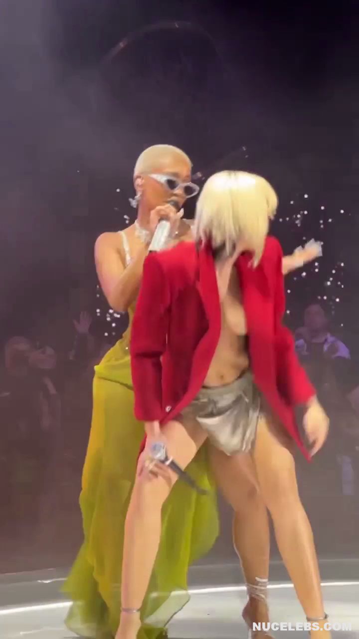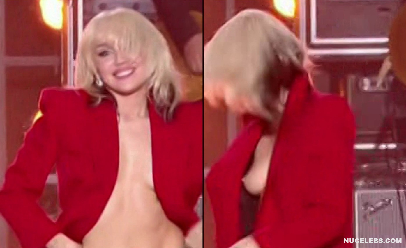 Miley Cyrus never stops getting into awkward situations with her provocative outfits. During several of her performances, this singer showed her naked boobs. For example, she was so passionate about her performance that she even sang into the microphone, lying right on the stage. At the same time, Miley Cyrus did not even notice that her nude boob with a brown nipple slipped out of the low neckline of her black dress. It was also impossible to look away from her bare titties periodically peeking out of an unbuttoned red jacket during another performance.