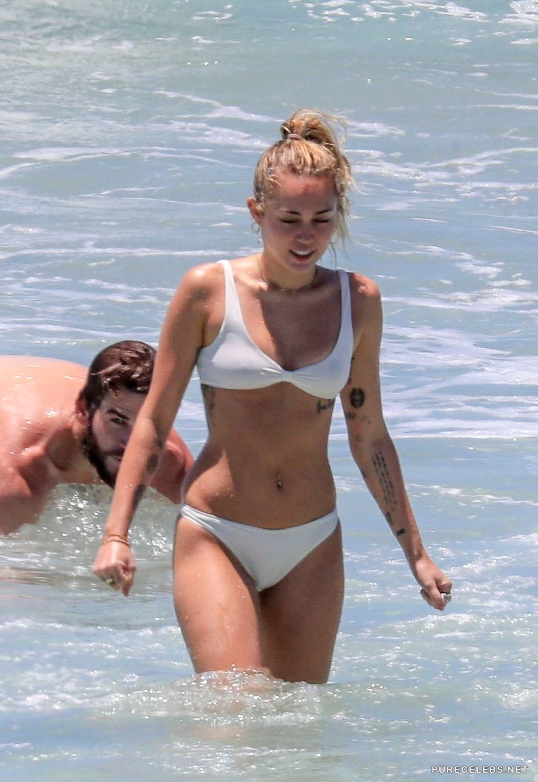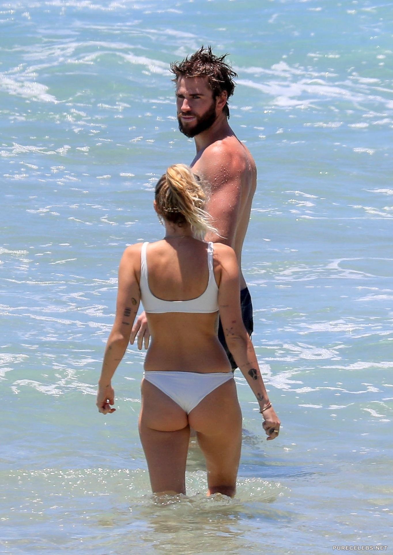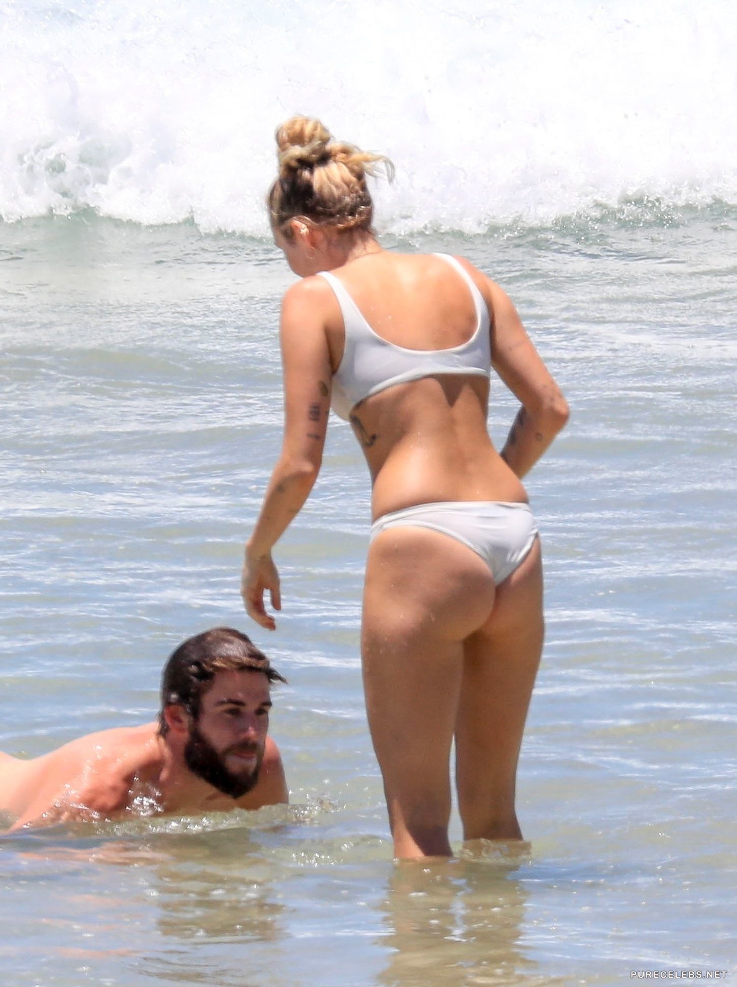 Not much introduction is needed for Miley Cyrus. With the first sunny days Miley went to the beach dressed in skimpy white bikini and splashed around in water with her current boyfriend. Paparazzi managed to capture photos of her young hot body and especially of her amazing tight little but that is barely covered by thong bikini as she walked around beach and bent down in water, as she probably knew that she was photographed.