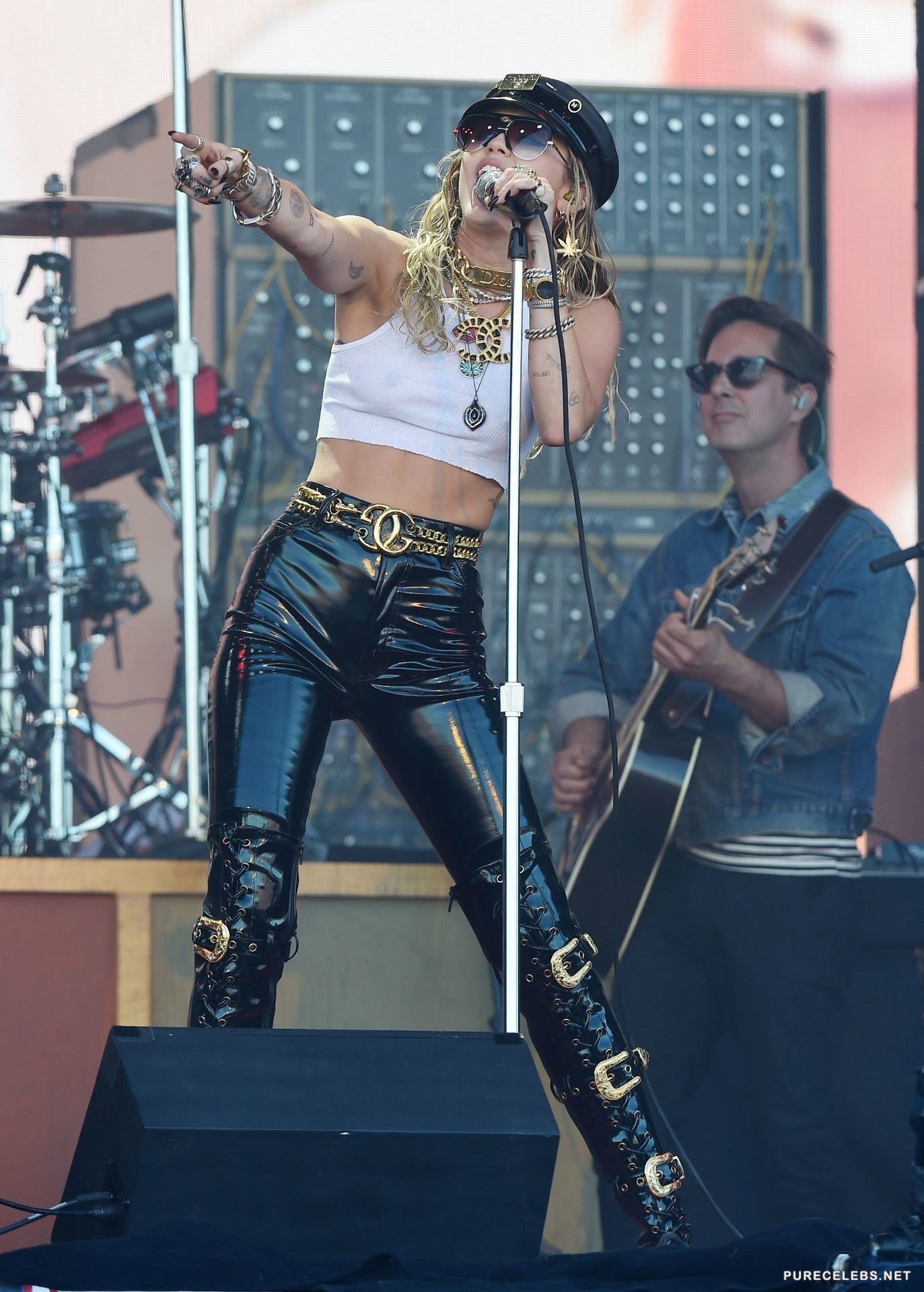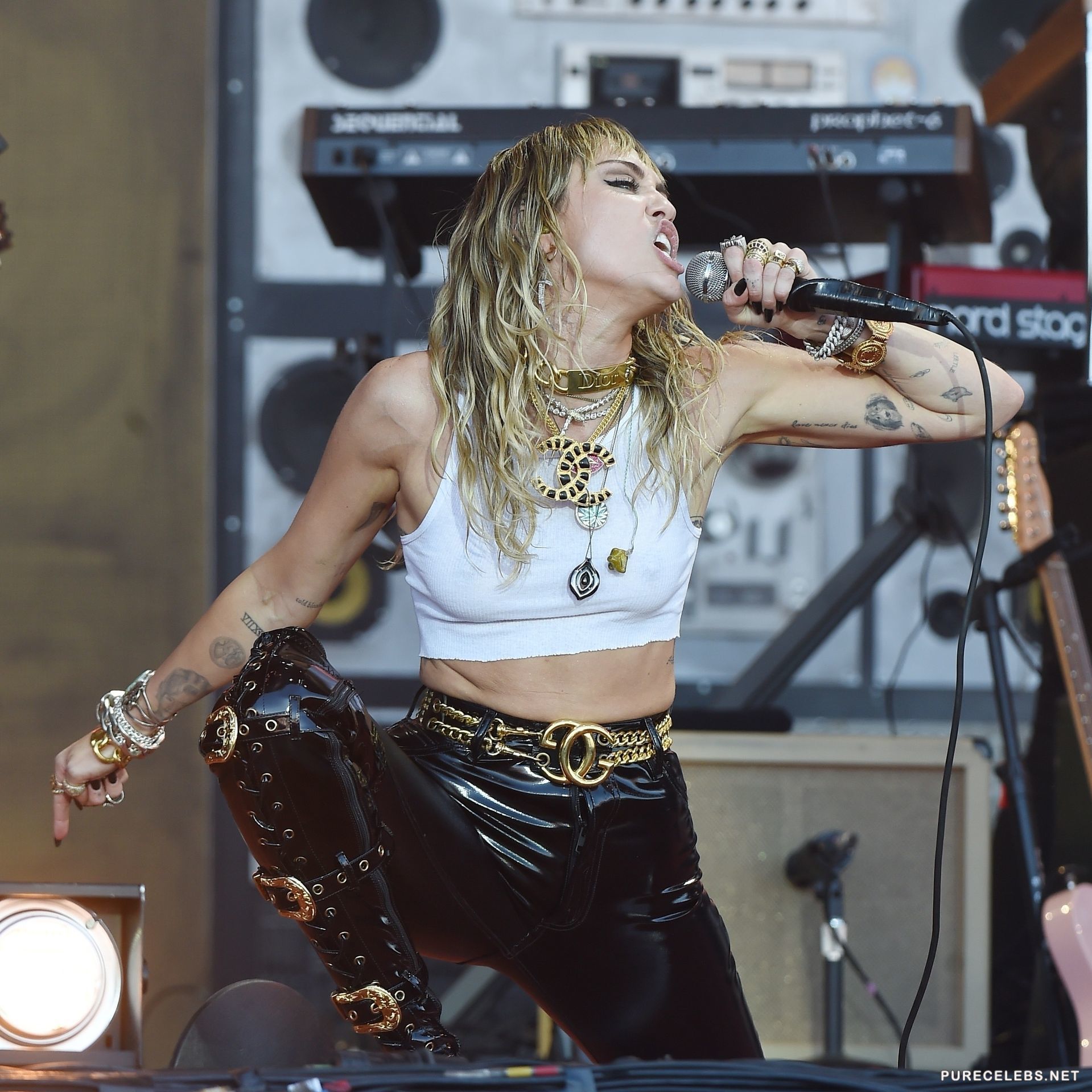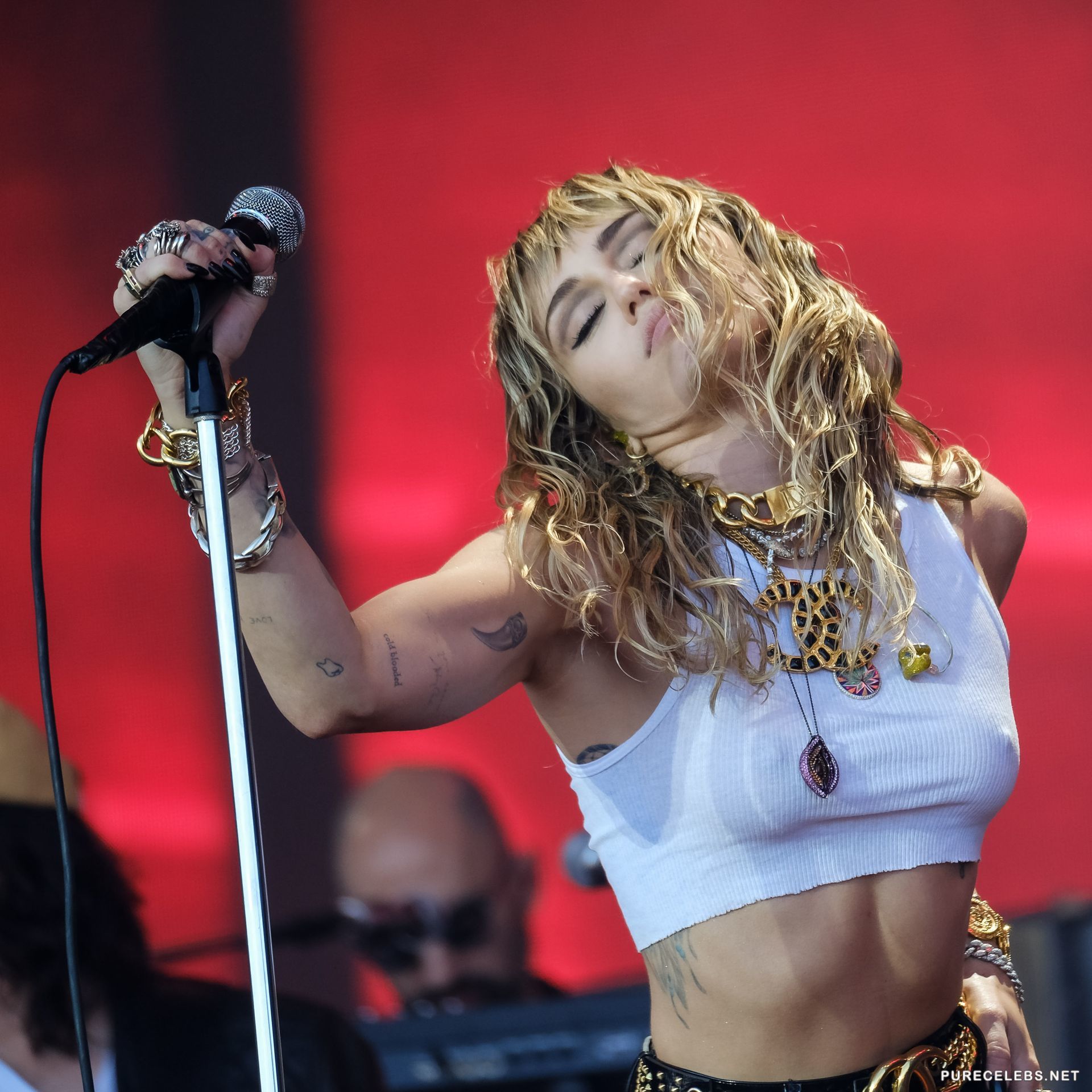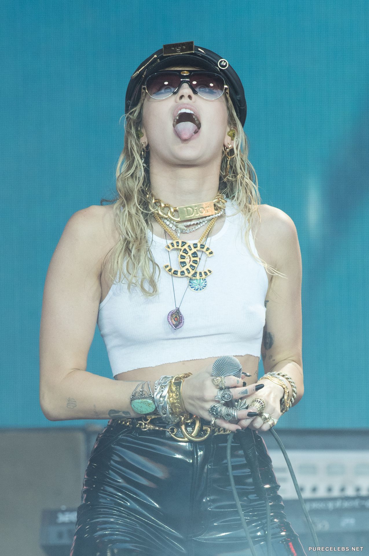 The charming singer Miley Cyrus just transforms in an incredible way when she steps on stage. The girl loves to wear seductive outfits, and when she starts singing, she looks incredibly sexy. For example, recently a star was photographed in black latex pants and a short white top. It was simply impossible to resist her wonderful breasts with poking nipples, which was clearly visible through her tight top.