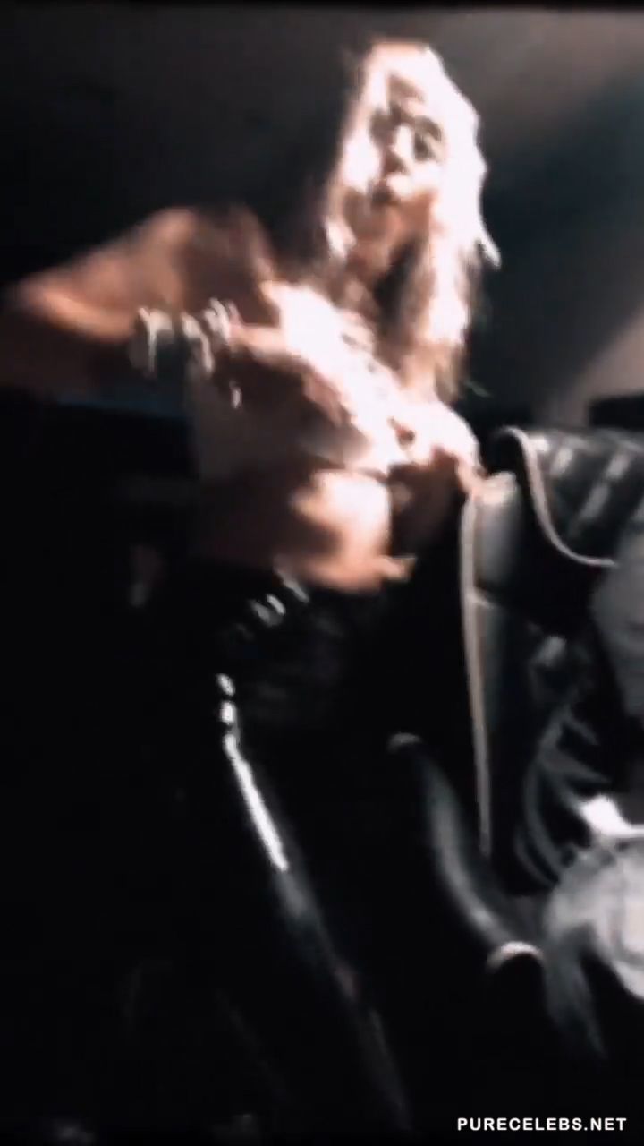 Miley Cyrus just loves to tease her fans with provocative photos and videos. For example, recently a video has hit the network, where we can see a hot blonde topless. A charming beauty dressed in black latex pants and a short white top moving rhythmically to the music, and then decided to make her dance hotter and for a moment pulled up her top, exposing her awesome juicy boobs. This girl knows how to indulge her fans!