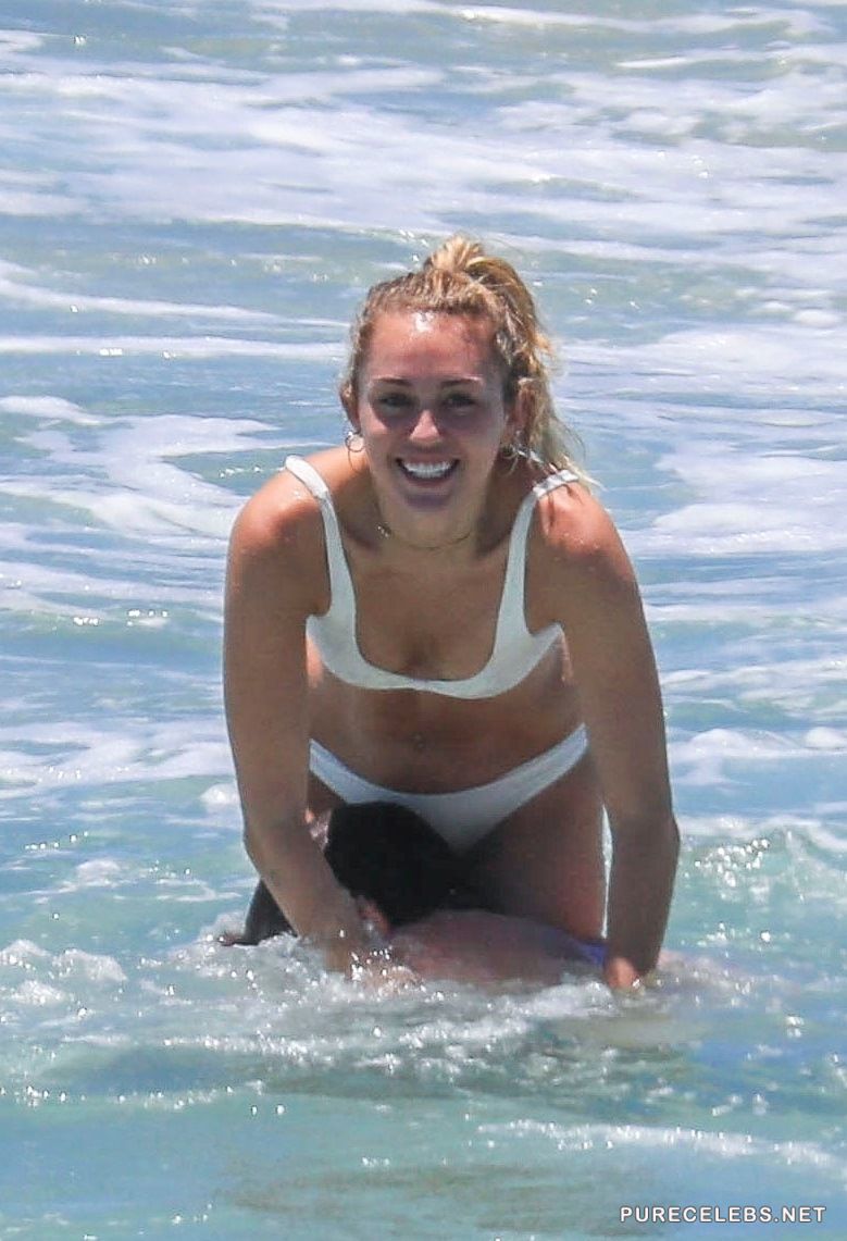 Not much introduction is needed for Miley Cyrus. With the first sunny days Miley went to the beach dressed in skimpy white bikini and splashed around in water with her current boyfriend. Paparazzi managed to capture photos of her young hot body and especially of her amazing tight little but that is barely covered by thong bikini as she walked around beach and bent down in water, as she probably knew that she was photographed.