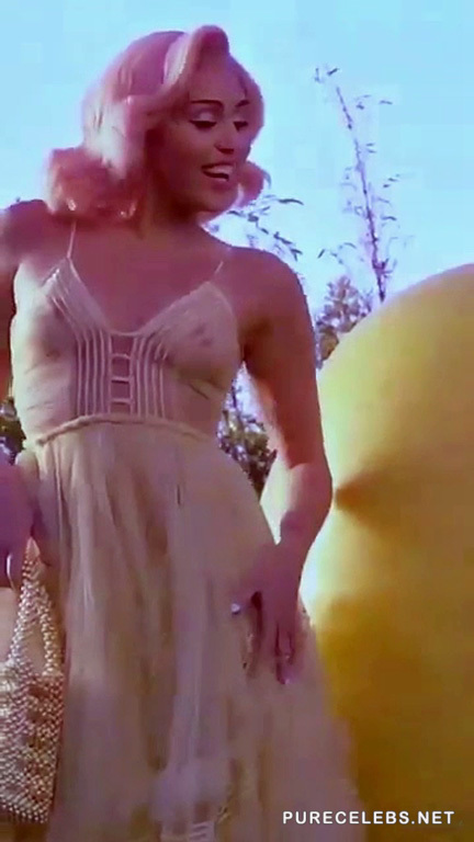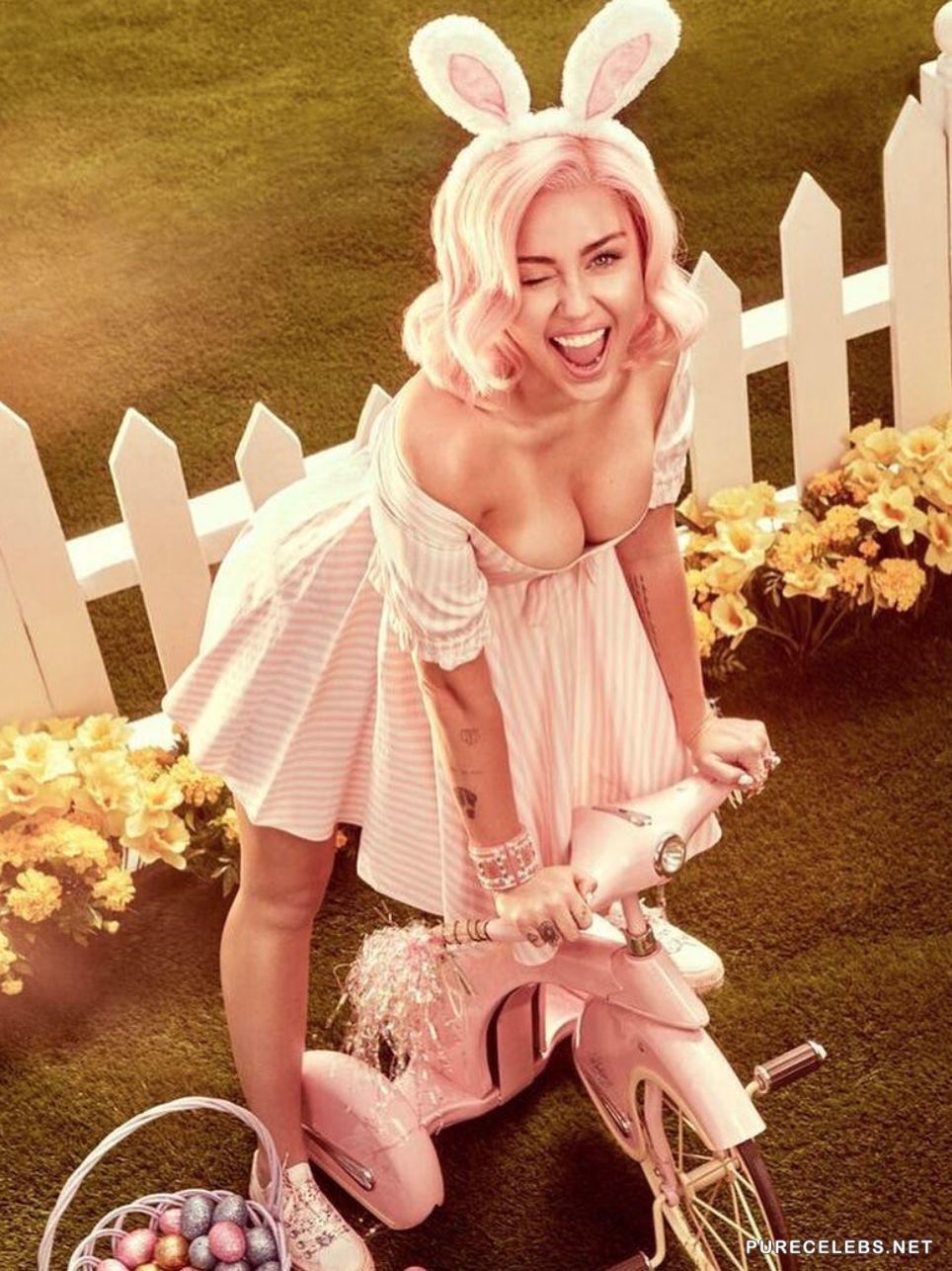 Miley Cyrus recently posed for famous magazine in photo editorial that was Easter themed. She wore bunny ears and yellow tight dress that has completely see through top part, and of course she is not wearing any bra, so her shapely nice tits are exposed for our pleasure. She poses lying on the ground, as well as bending down to pick up eggs, thus giving us perfect view of her shapely ass.