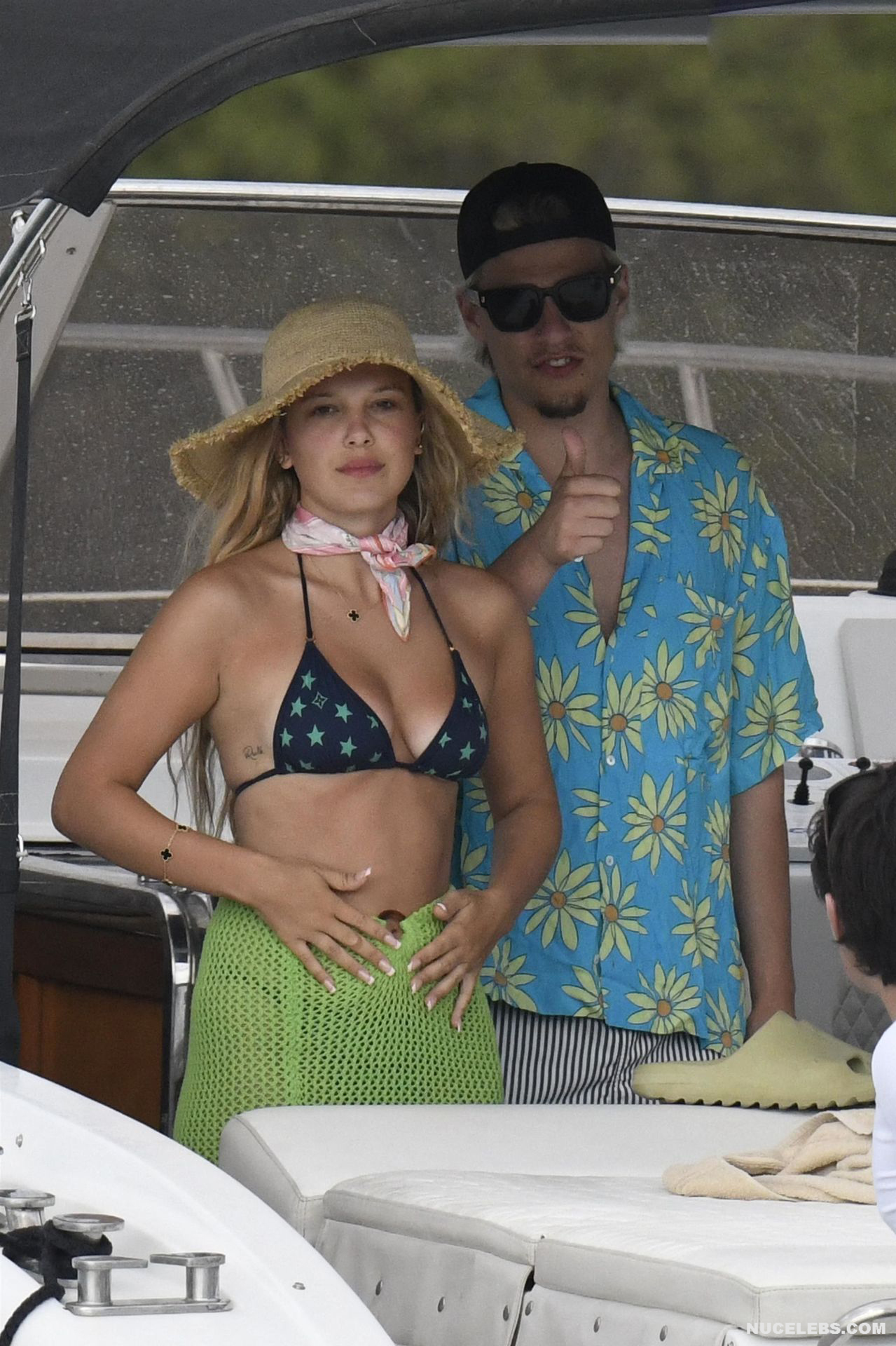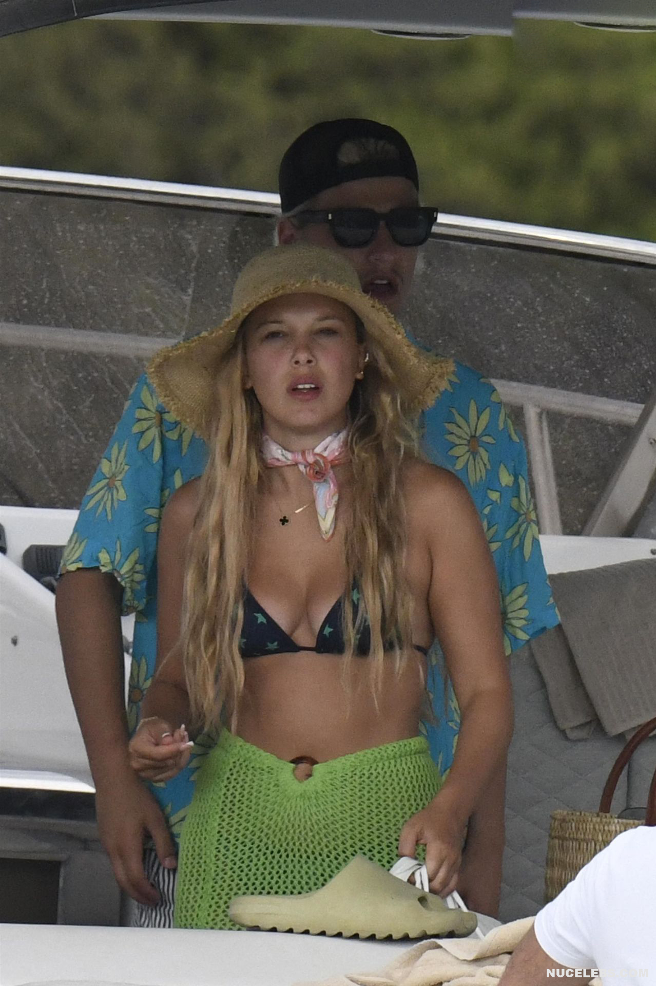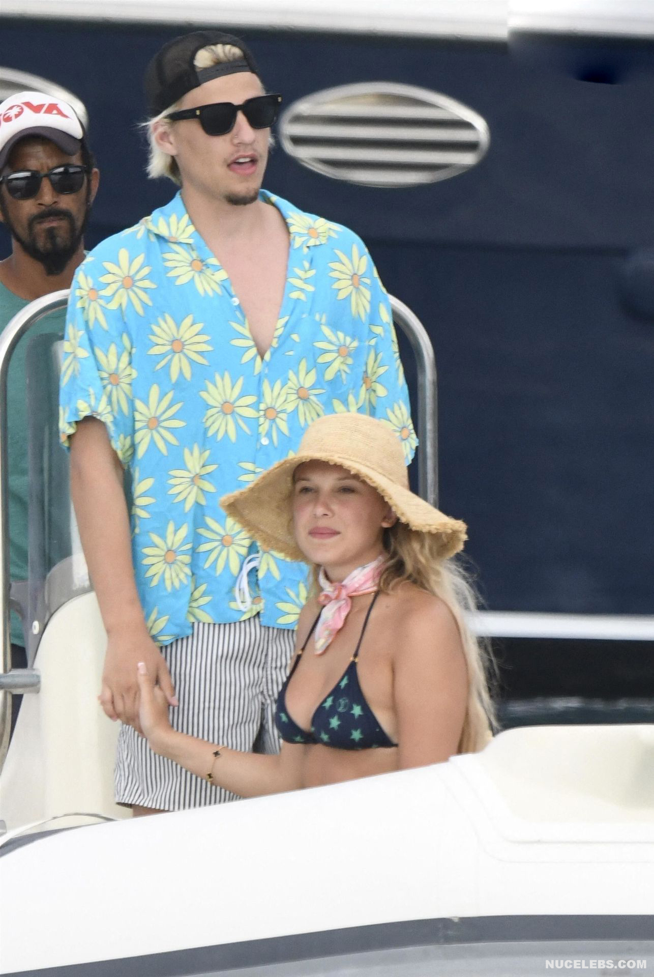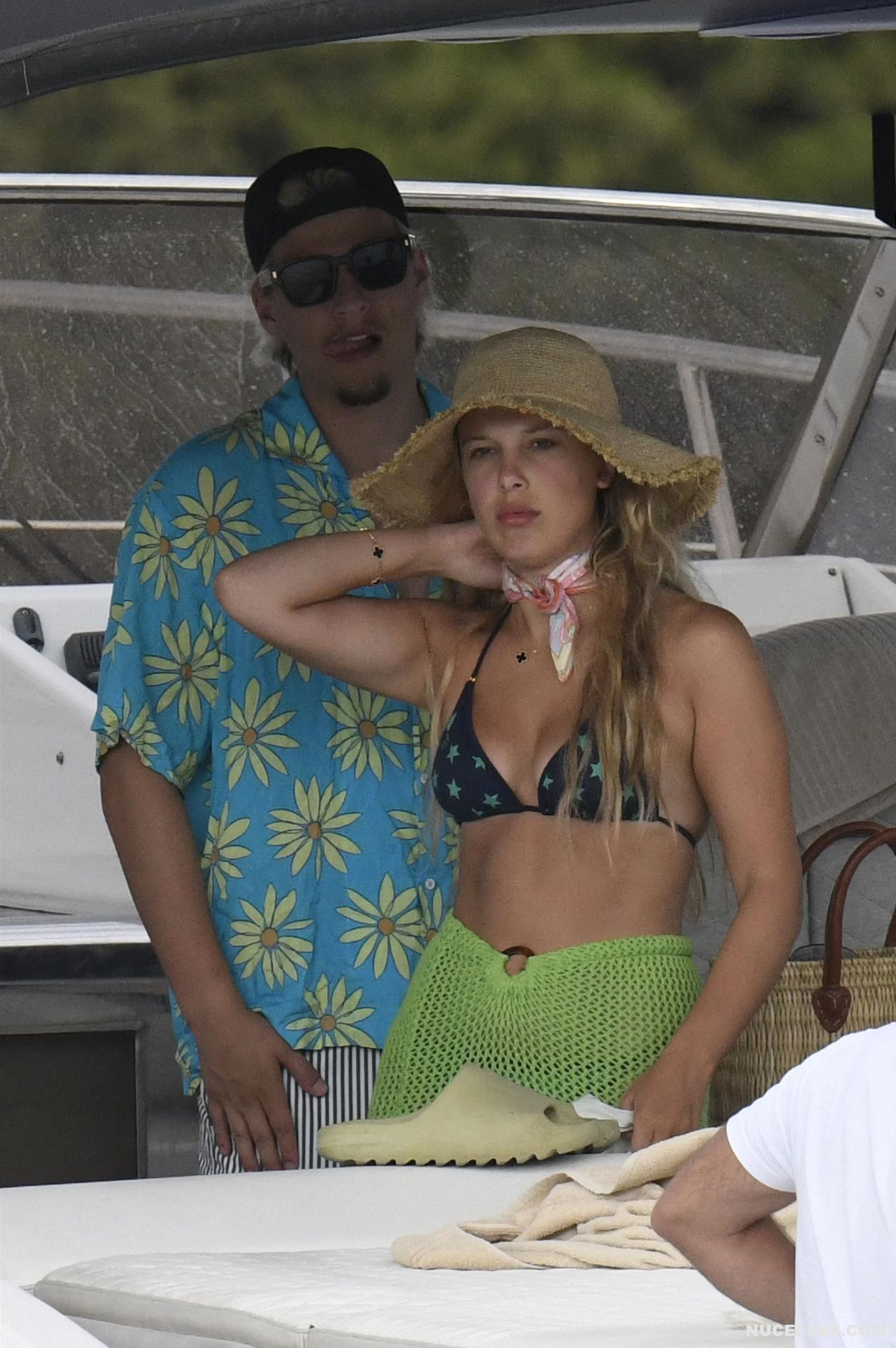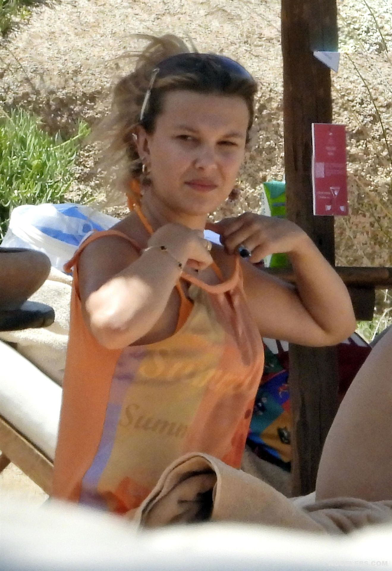 Millie Bobby’s keen sense of style and fashion further enhances her appeal. And this British model looked especially seductive in a blue bikini with a star print. Agree, Millie Bobby’s tits looked very sexy in these two pieces of fabric. And of course, you can’t ignore the photos of her in an orange bikini. Her booty in a tight thong seemed almost naked, especially when you look at this beauty in profile!