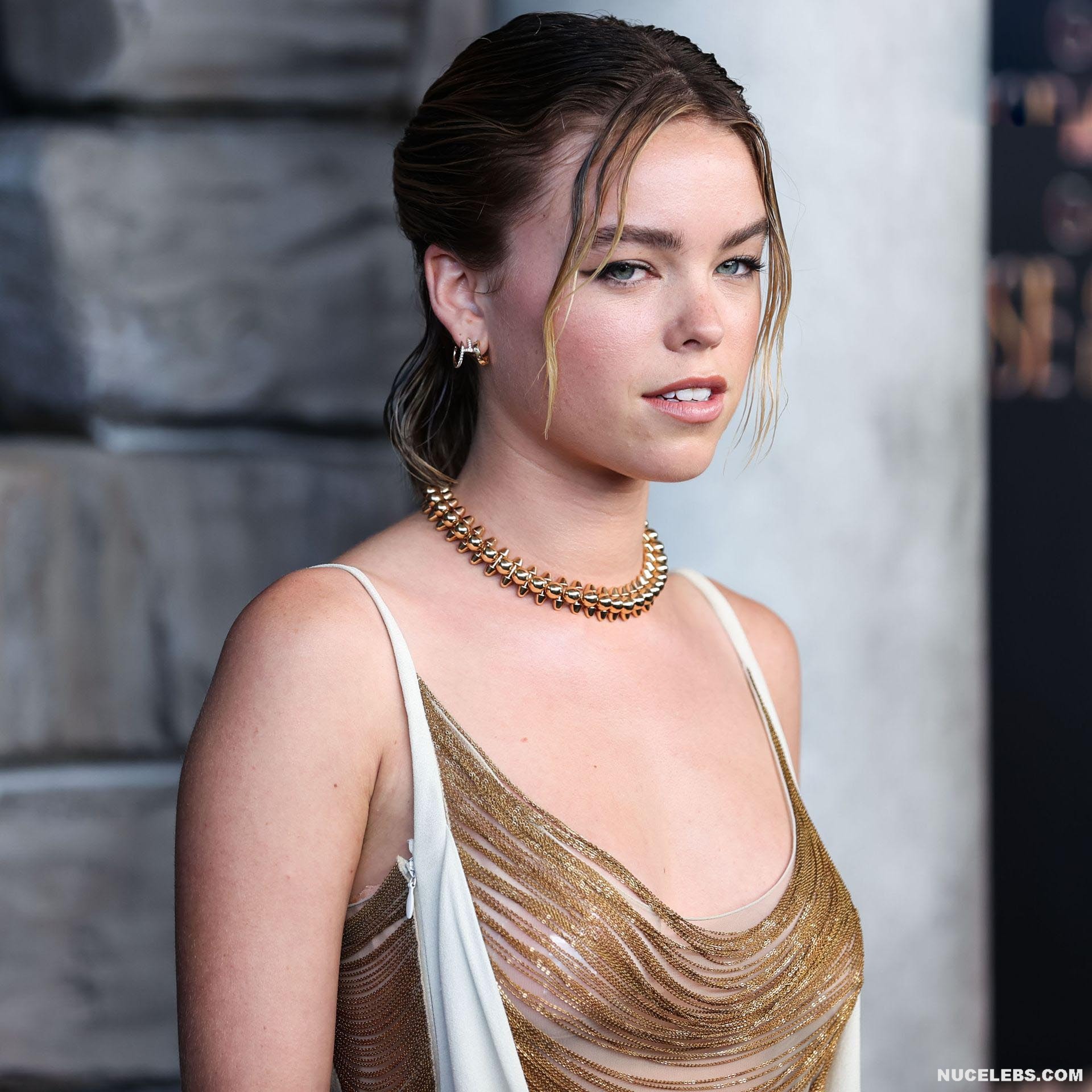Hot babe Milly Alcock will blow your mind with her bikini pics. After all, this star chooses for herself such miniature bikinis that barely cover her naughty bits. And at one of the events, this 22-year-old actress arrived in a see through outfit. Her long white dress was embellished with golden threads that showed through Milly Alcock’s nude boobies with brown nipples!