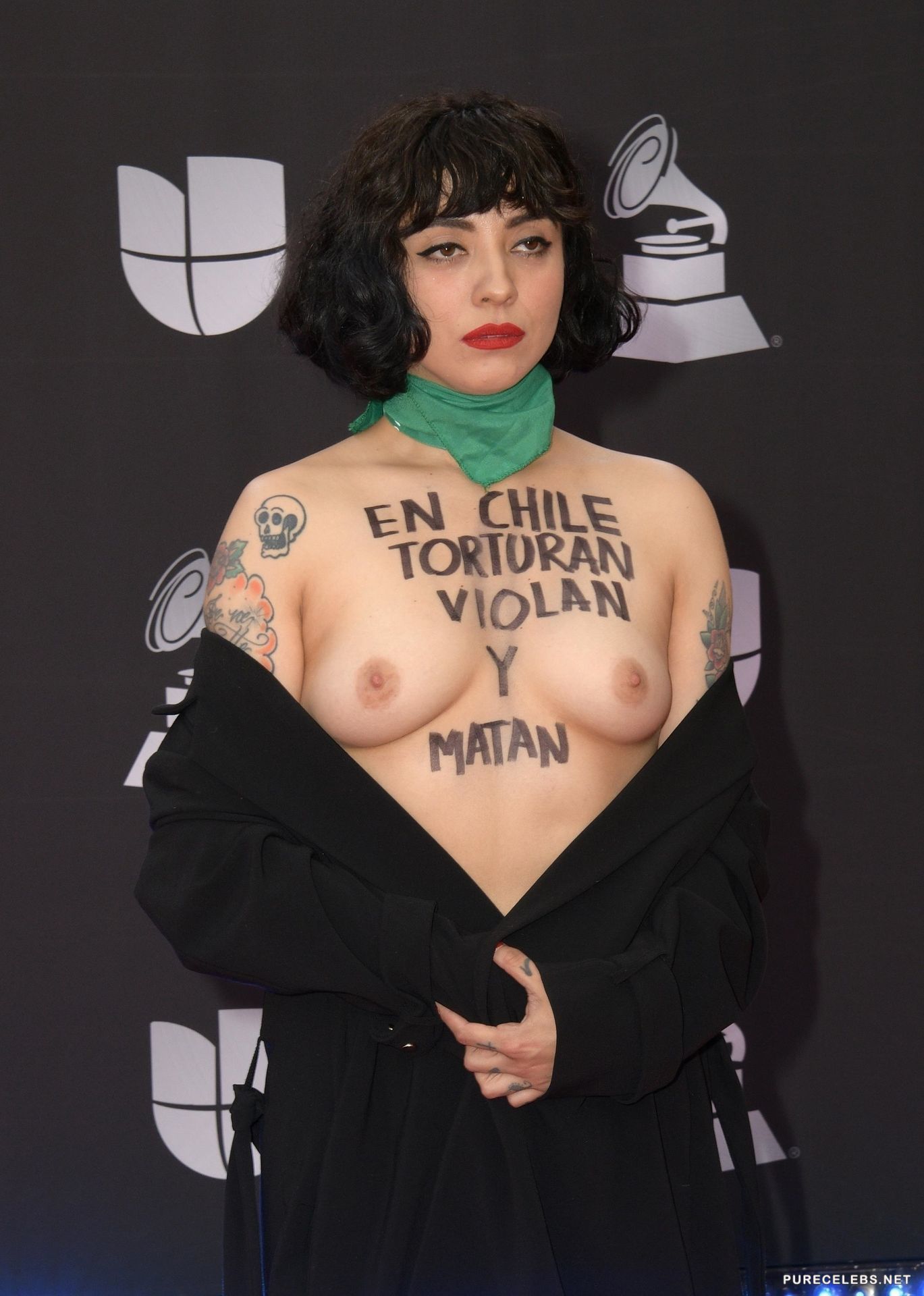 Mon Laferte, Chilean-born Mexican dual citizen singer-songwriter, decided to draw public attention to herself and appeared at one event in a very provocative outfit. This hot brunette was dressed in a spacious pantsuit and looked very elegant. But at some point, she unzipped her jacket and showed off her chic naked boobs with small nipples, over which the inscription was made with a black marker.