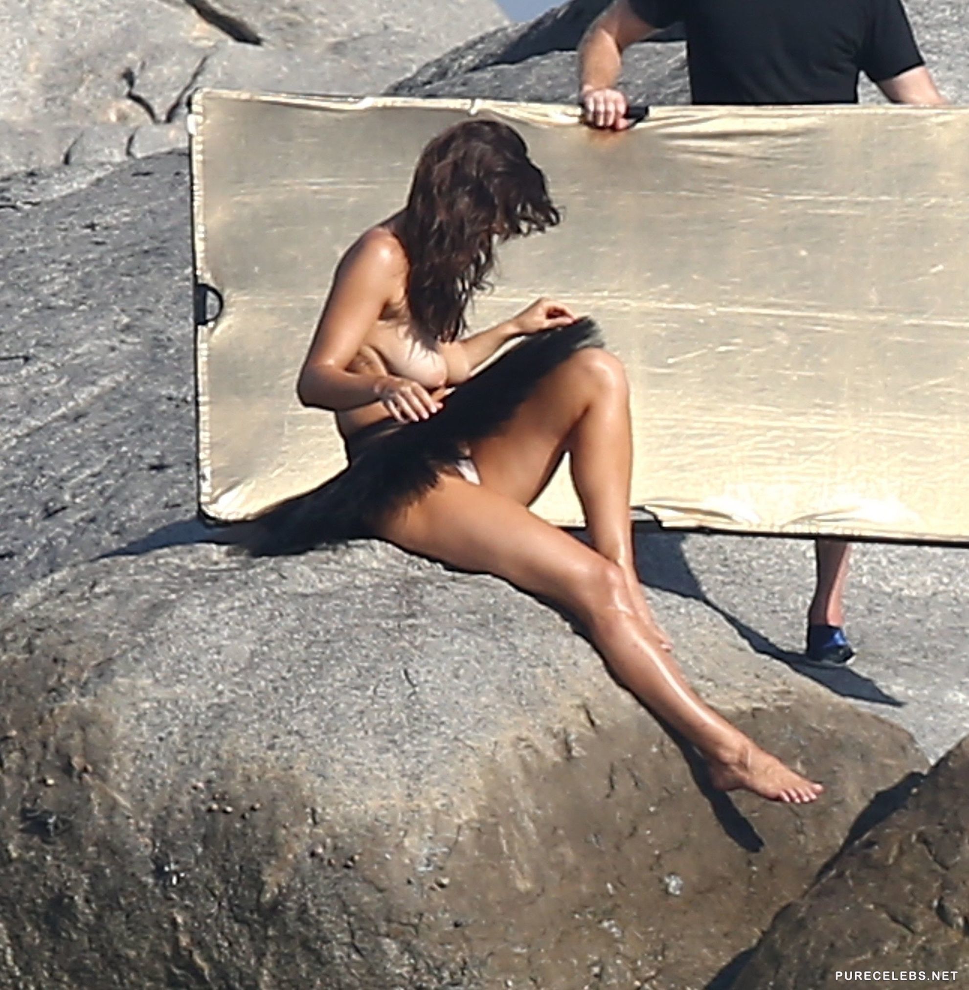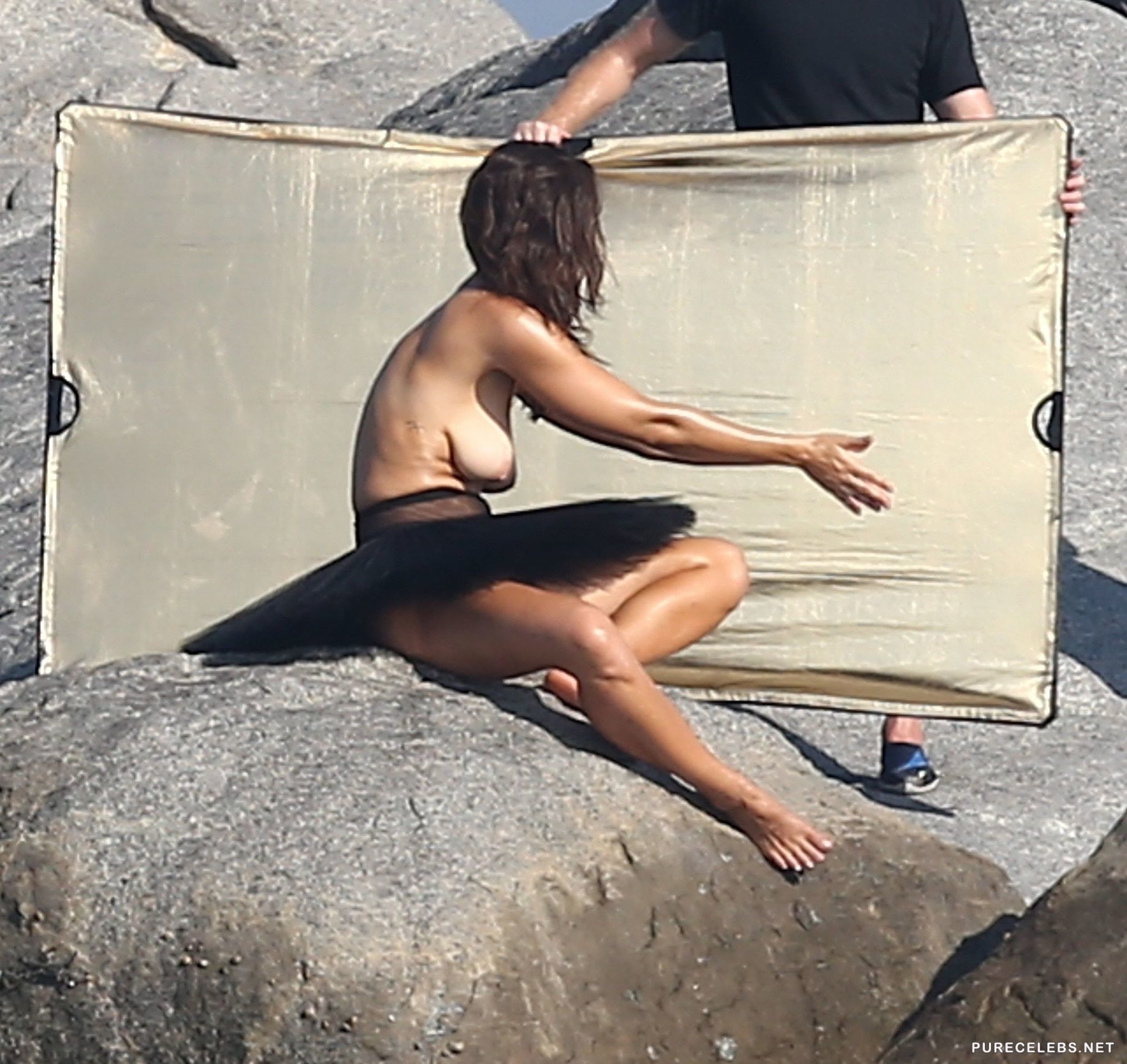 Myla Dalbesio has appeared in editorials for magazines including LOVE, Purple, Vogue, Elle France and many others. This former Miss Wisconsin from US has grown up to become highly sought plus sized model by many photographers. Her natural beauty and body with heavenly curves are impossible not to notice. She often poses completely nude for photographers like in these pictures, where she is sitting on rocks, topless and wet, displaying her huge tits.