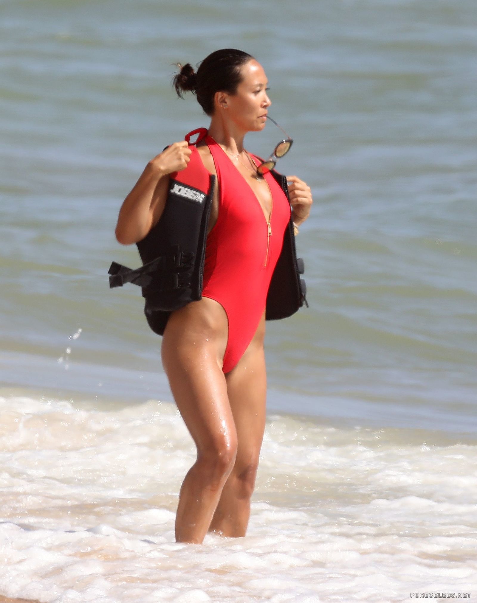 Myleene Klass could easily be the newest member of the Baywatch team. If you were drowning we are sure that you would want this hottie to save you. The stunning brunette was spotted on the beach in a red bathing suit swimming and riding a jet ski. Her wet swimsuit stuck to her body and provided perfect outlines of her perky natural breasts and tight shaved pussy.
