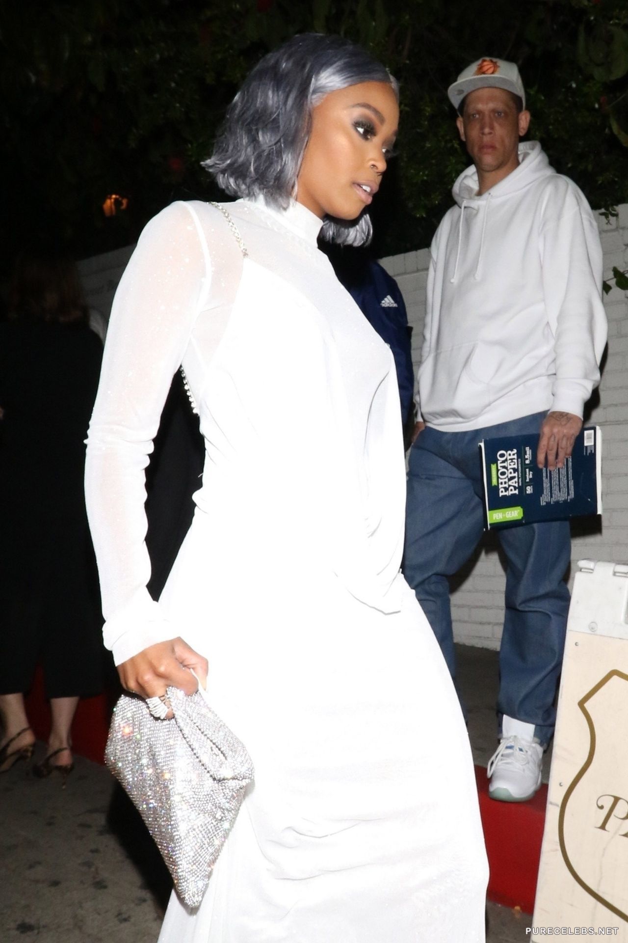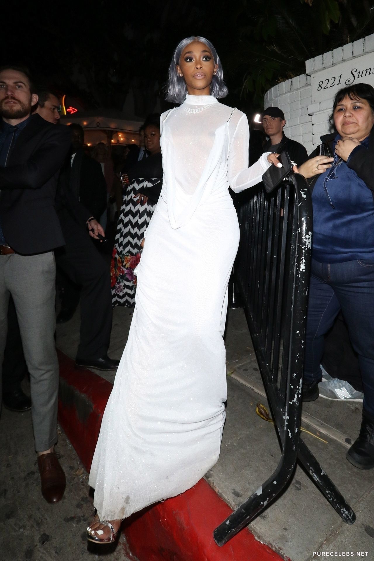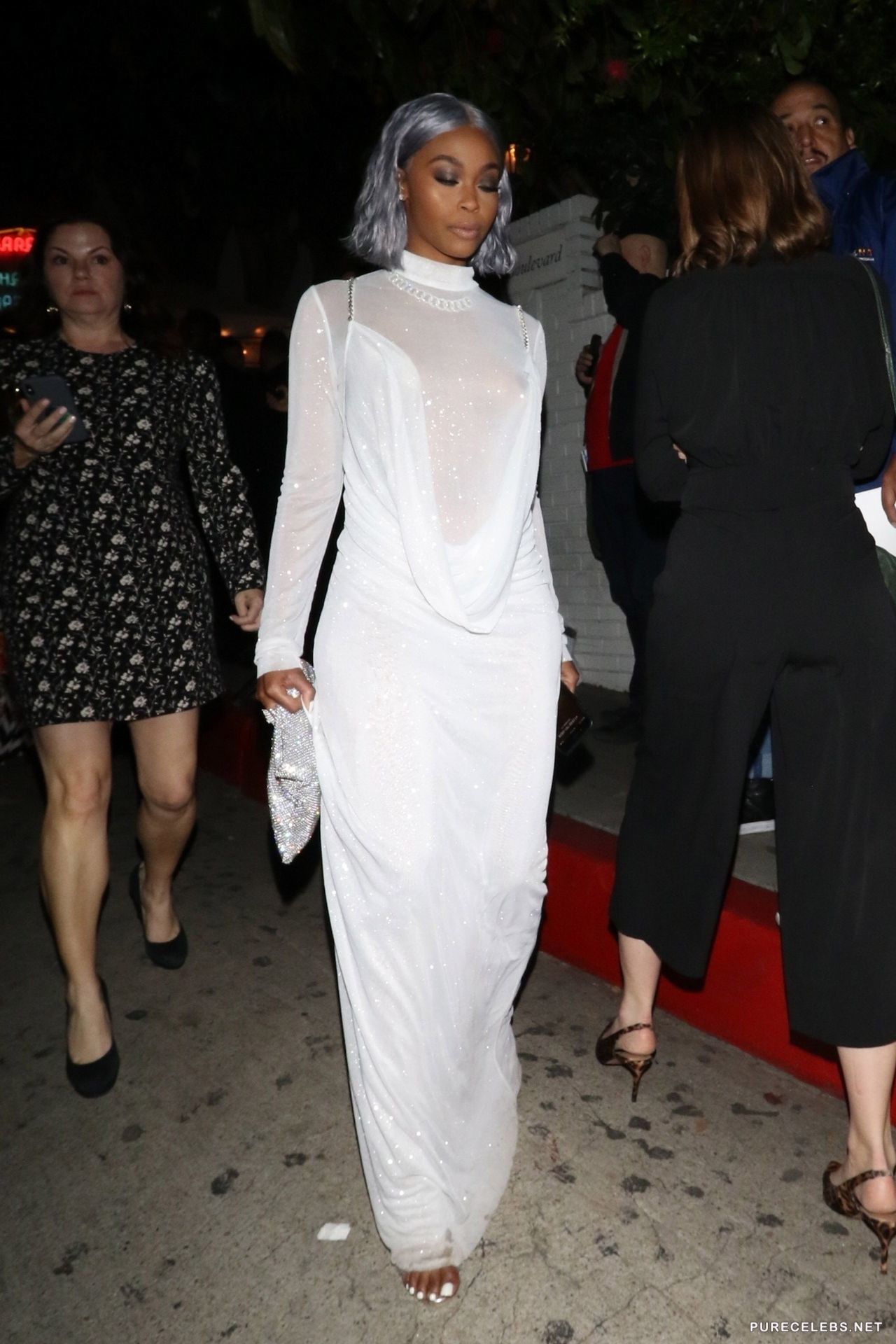 Nafessa Williams is in a white dress that looks great in contrast of her dark skin. The fabric is transparent on top so we are able to see her dark nipples poking through. The chick with silver hair is probably aroused by all the attention the daring outfit is bringing her. She wants as many people as possible to see how hot she really is.