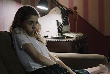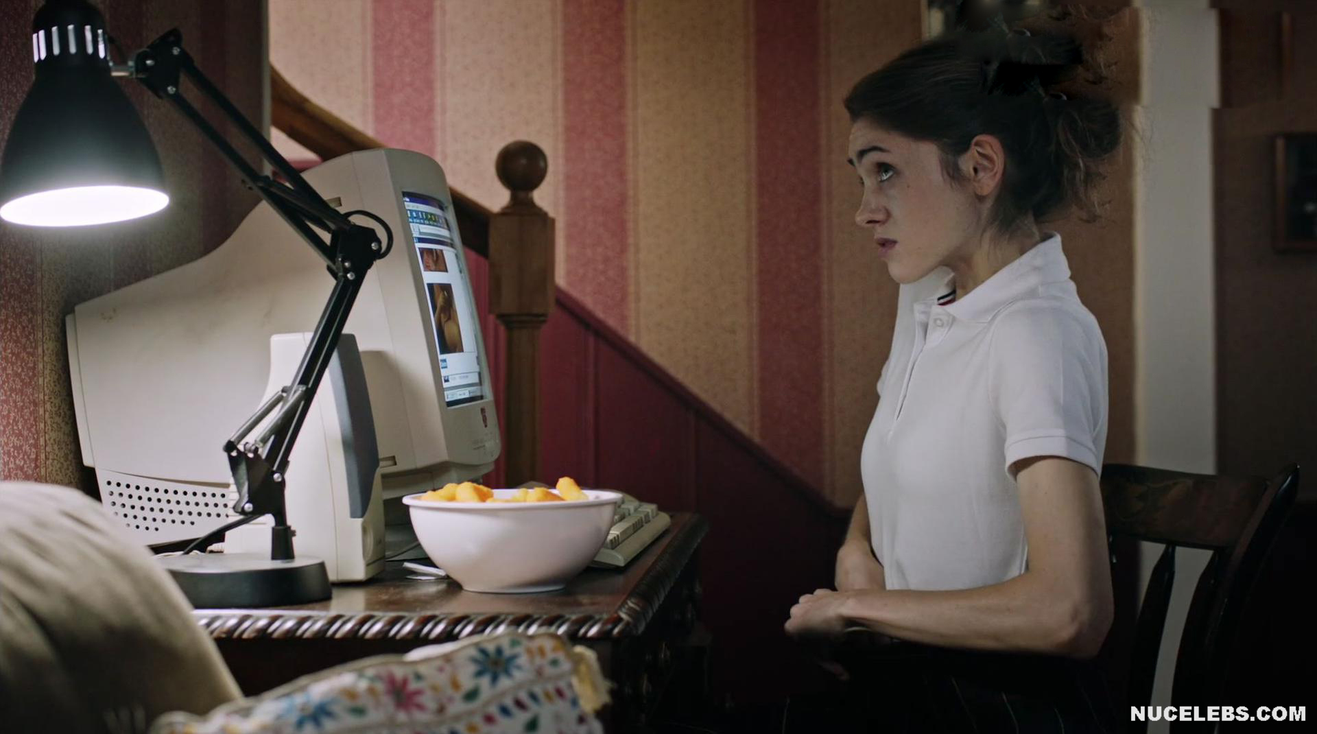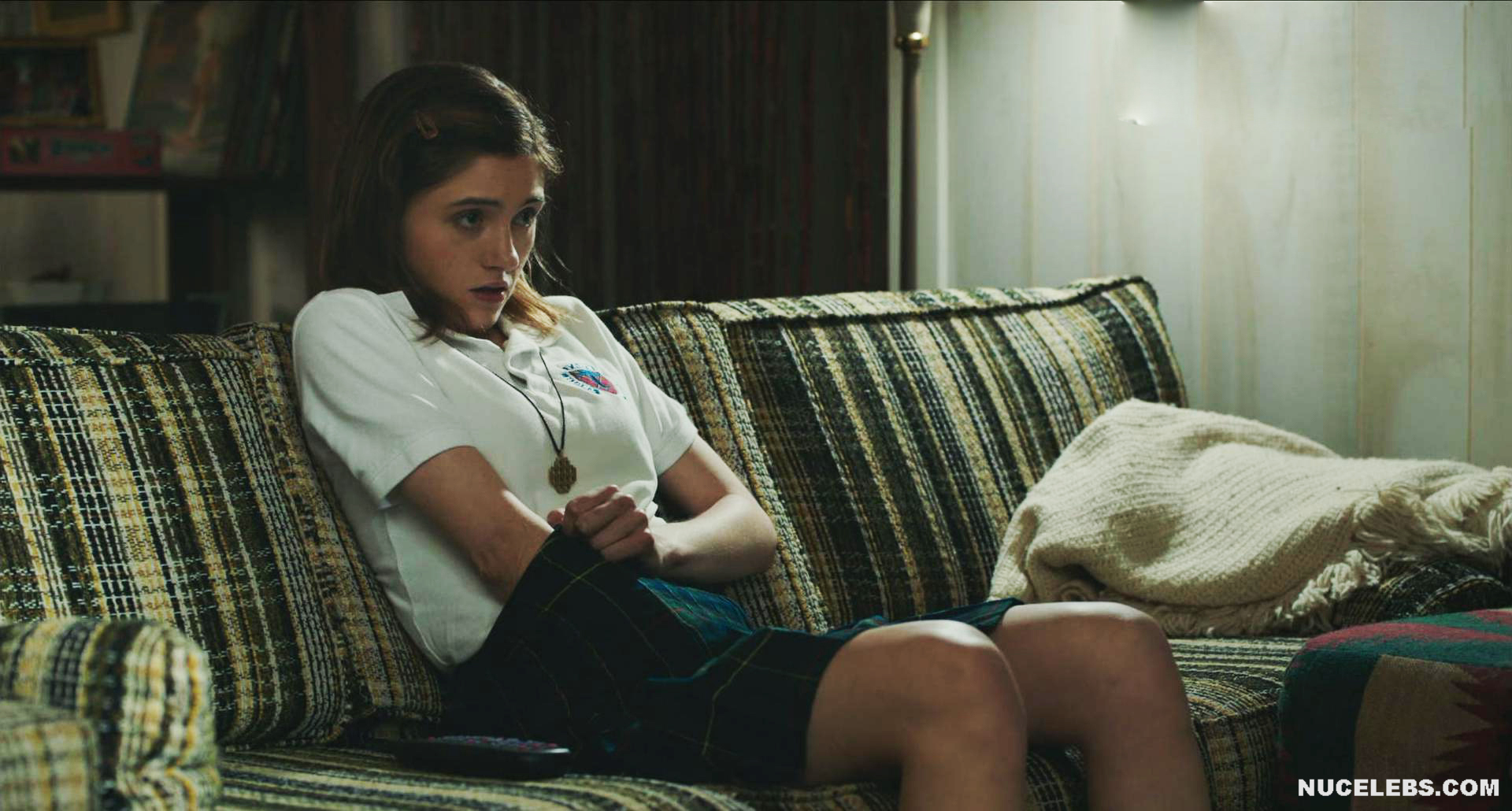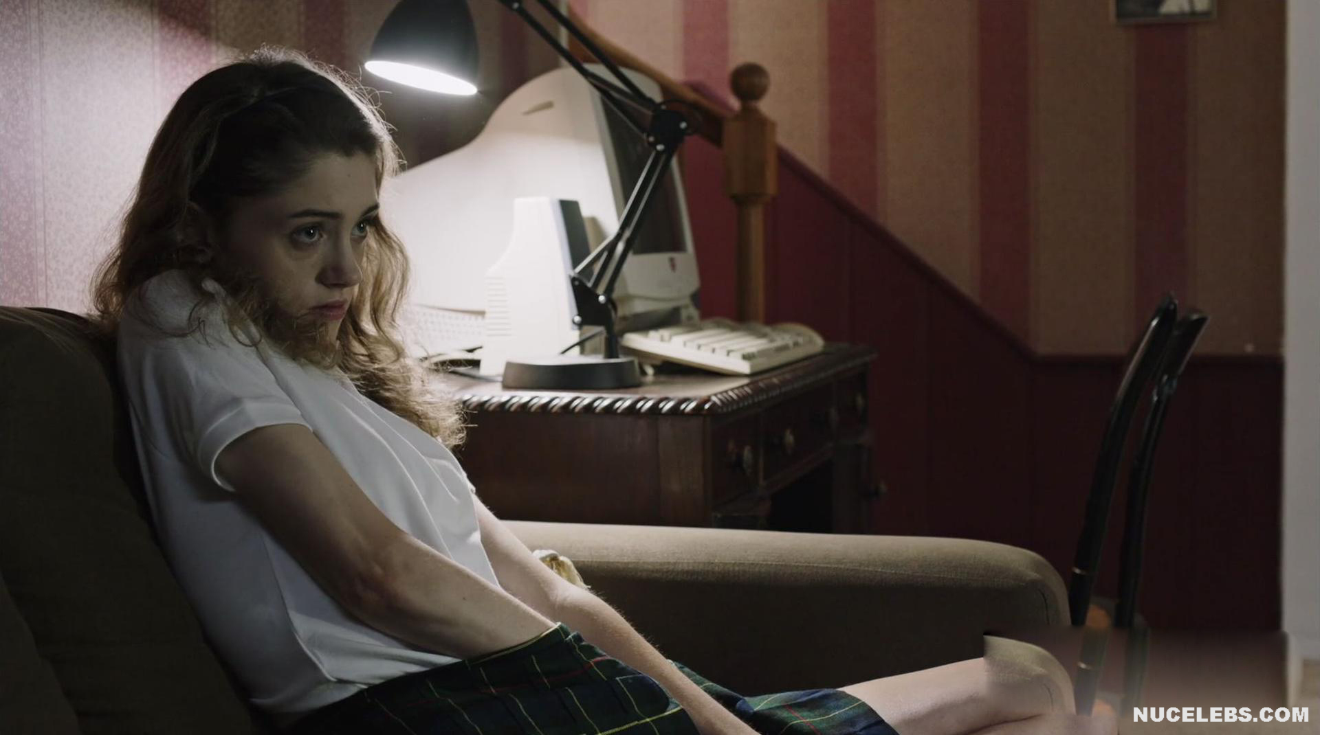 This hottie was amazing in Yes, God, Yes (2017). There she sat on the couch and watched the action unfold on the TV screen. This really excited her, and Natalia Dyer began to masturbate, putting her hand under her skirt… However, this was not enough for her and her gaze fell on the blue and white sex toy lying next to her…