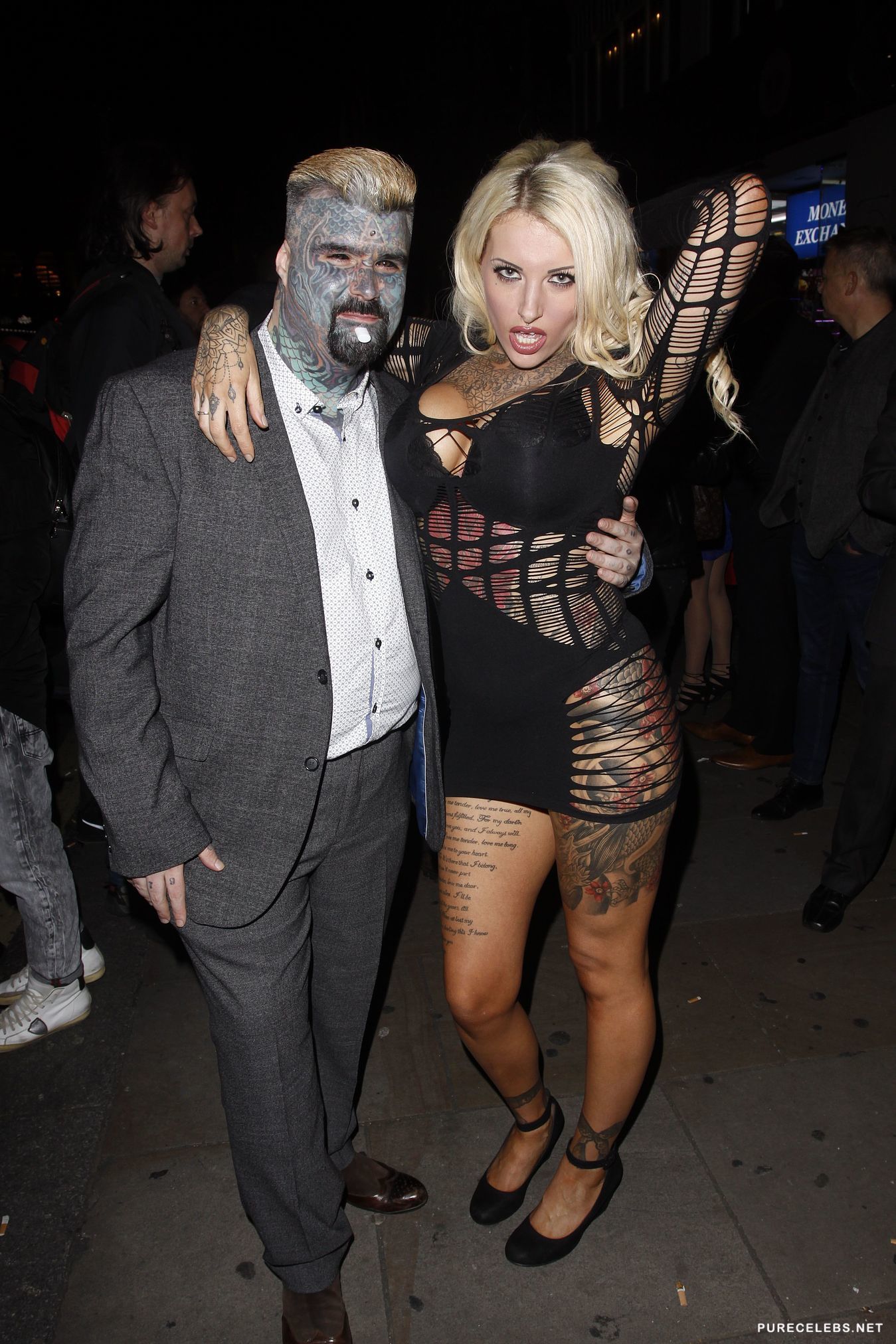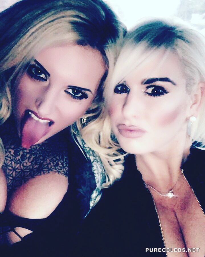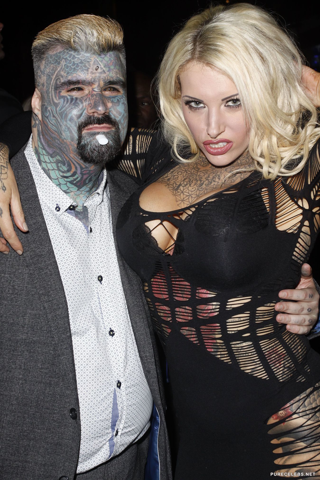 Heavily tattooed glamour model Nevaeh Heaven recently attended a public event with her alternative entourage. The smoking hot blond was photographed wearing a revealing black dress with only her lacy bra covering those massive fake tits. She was happy to pose for photographers and playfully smiled for the camera. We strongly encourage Nevaeh to keep this slutty behavior up and give us more sexy curves.