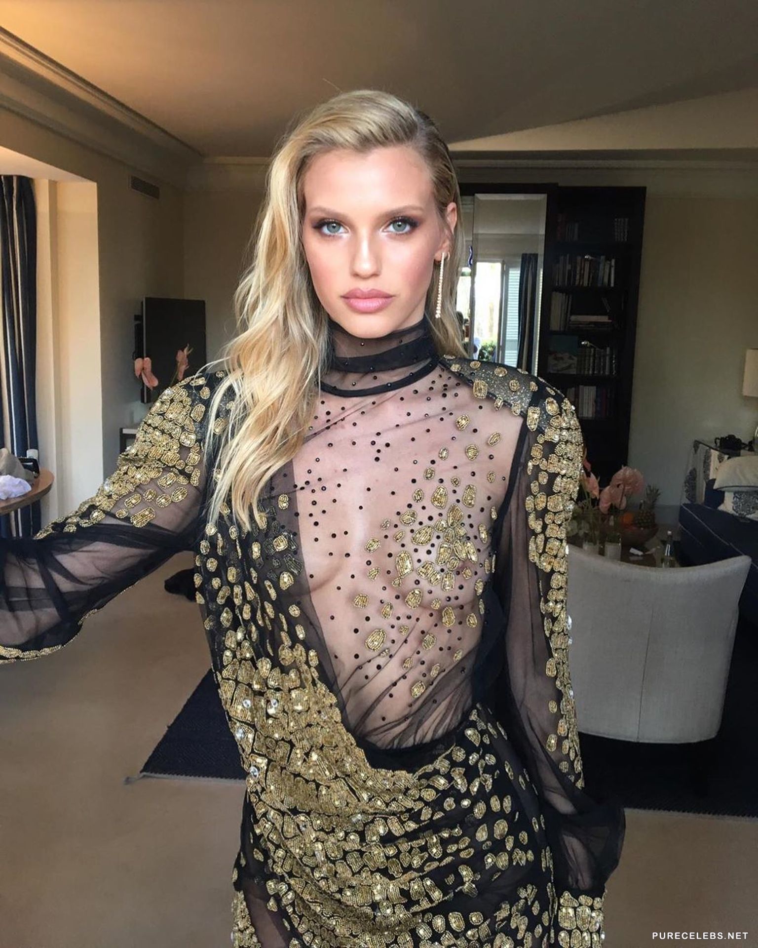 Israeli model Nibar Madar recently visited the event in a provocative outfit. Bright blonde wore a short black dress, decorated with gold and looked in it just gorgeous. But of course all attention was focused on her awesome tits with hard nipples, which were clearly visible through the translucent top of her dress, because the celebrity did not put on a bra. This girl knows exactly how to be the center of attention!