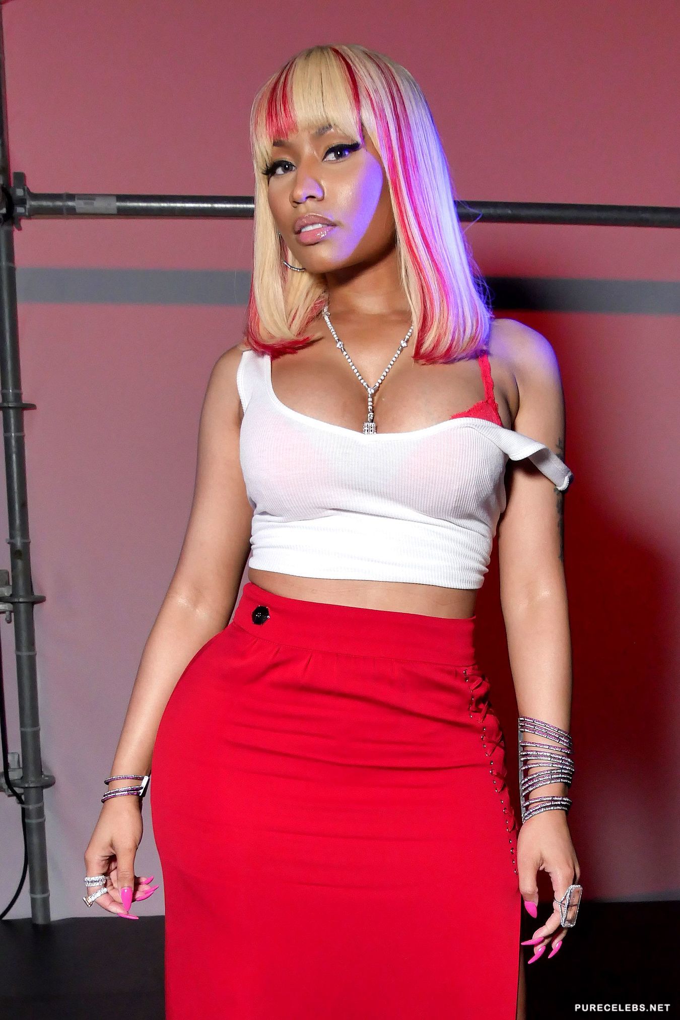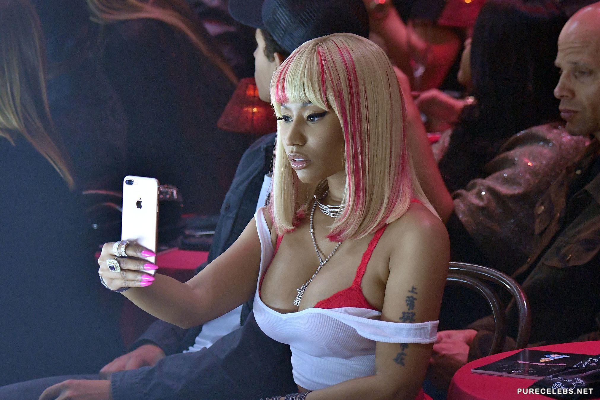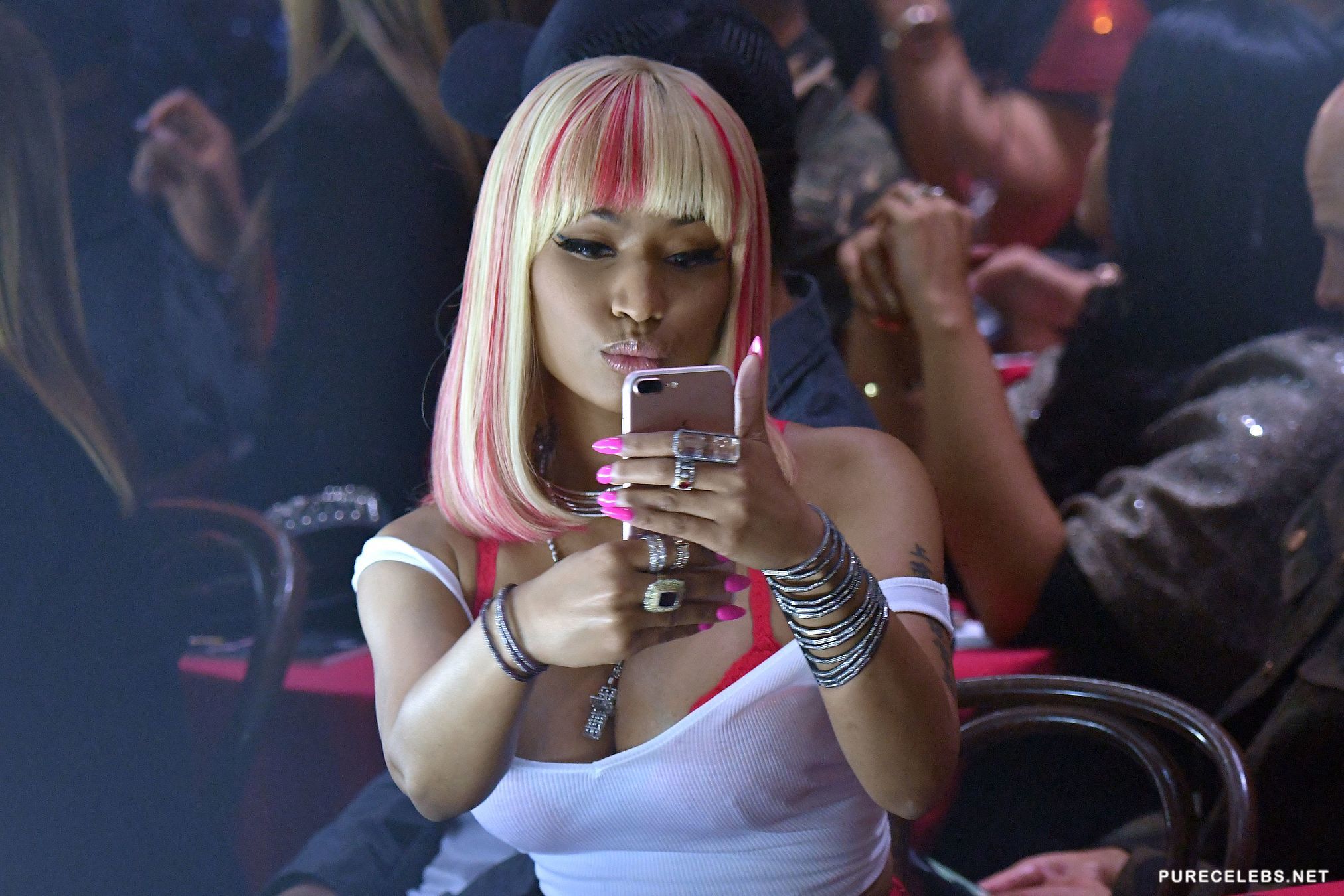 NY Fashion week is a chance for celebrities to show off their best assets and their fancy wardrobes. Nicki Minaj took this opportunity to flaunt her cleavage and giant boobs. The rap star was photographed by paparazzi taking selfies and photos of her massive tits during fashion shows. Her red lace bar was visible under a skin-tight white tank top and both could barely hold her tits from bursting out.