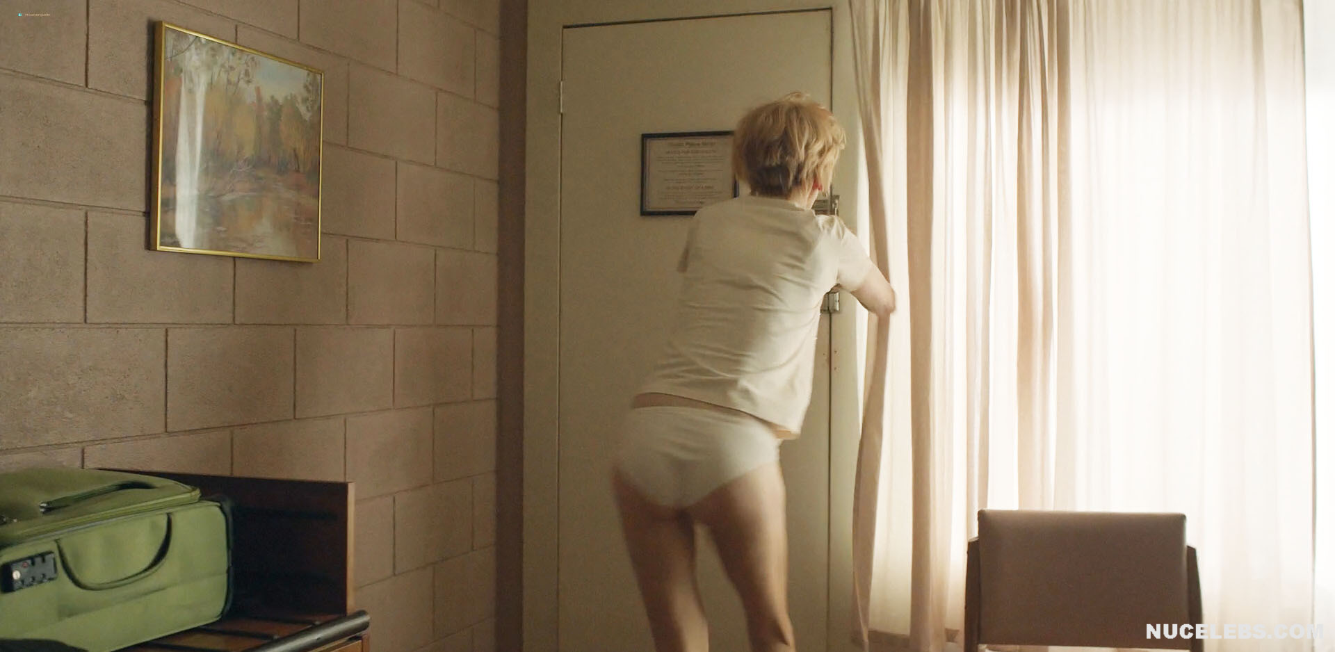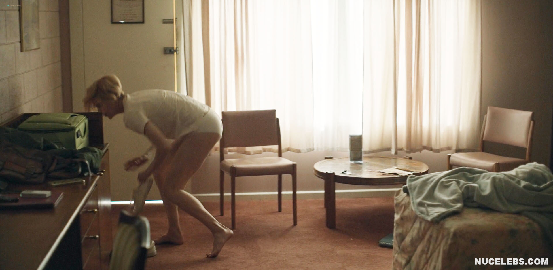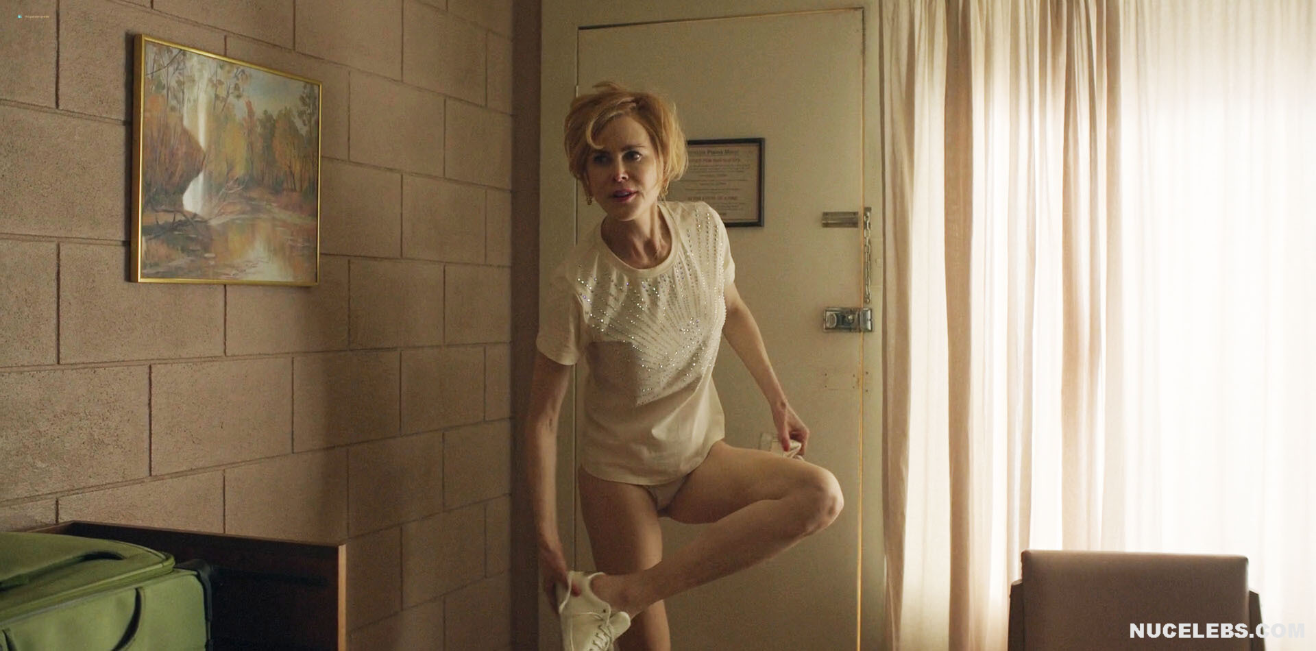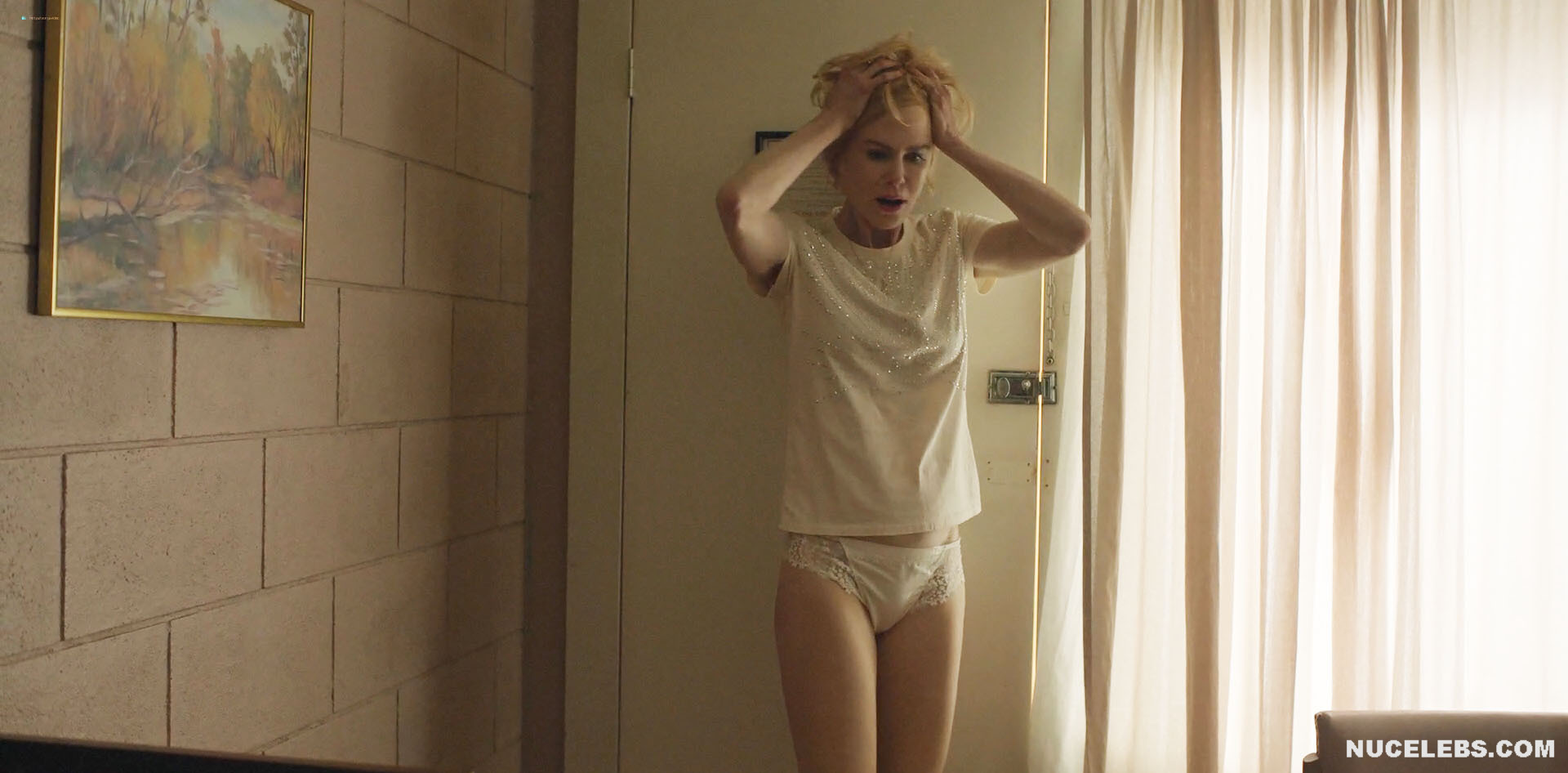 Nicole Kidman is in no hurry to show off her nude booty in the new series Roar. However, viewers can still admire this celebrity in cute white underwear. The lace panties accentuated Nicole Kidman’s cameltoe and also hugged her nude butt perfectly. Also, this star will excite your imagination with passionate kisses with men and erotic scenes.