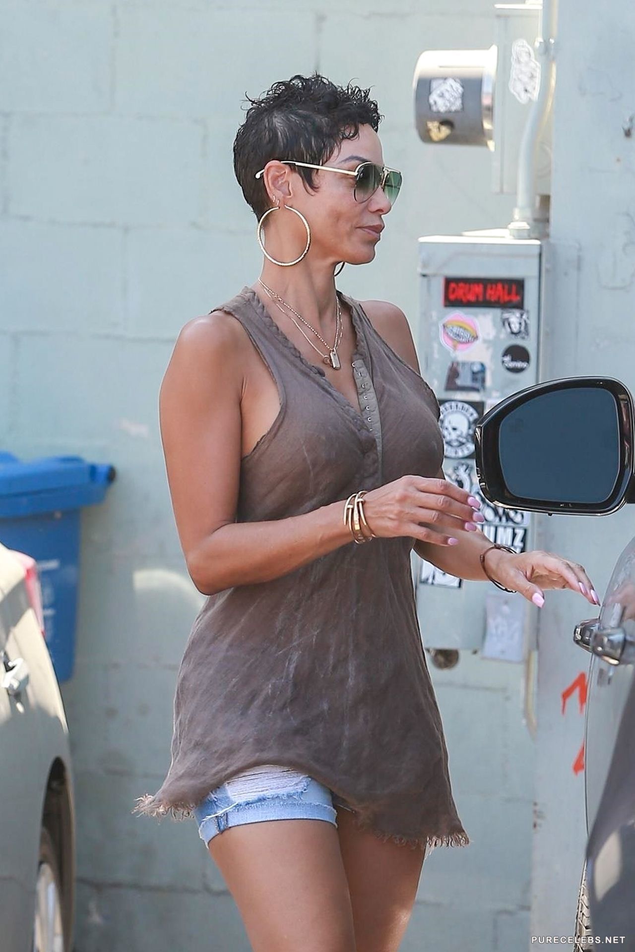 American model Nicole Murphy was spotted by the paparazzi as she walked down the street with her dogs in a very seductive outfit. The celebrity was wearing a coffee blouse and short denim shorts, showing off her beautiful slim legs. The hot brunette did not wear a bra, and so now we can admire her wonderful boobs with poking nipples, which were clearly visible through the thin fabric.